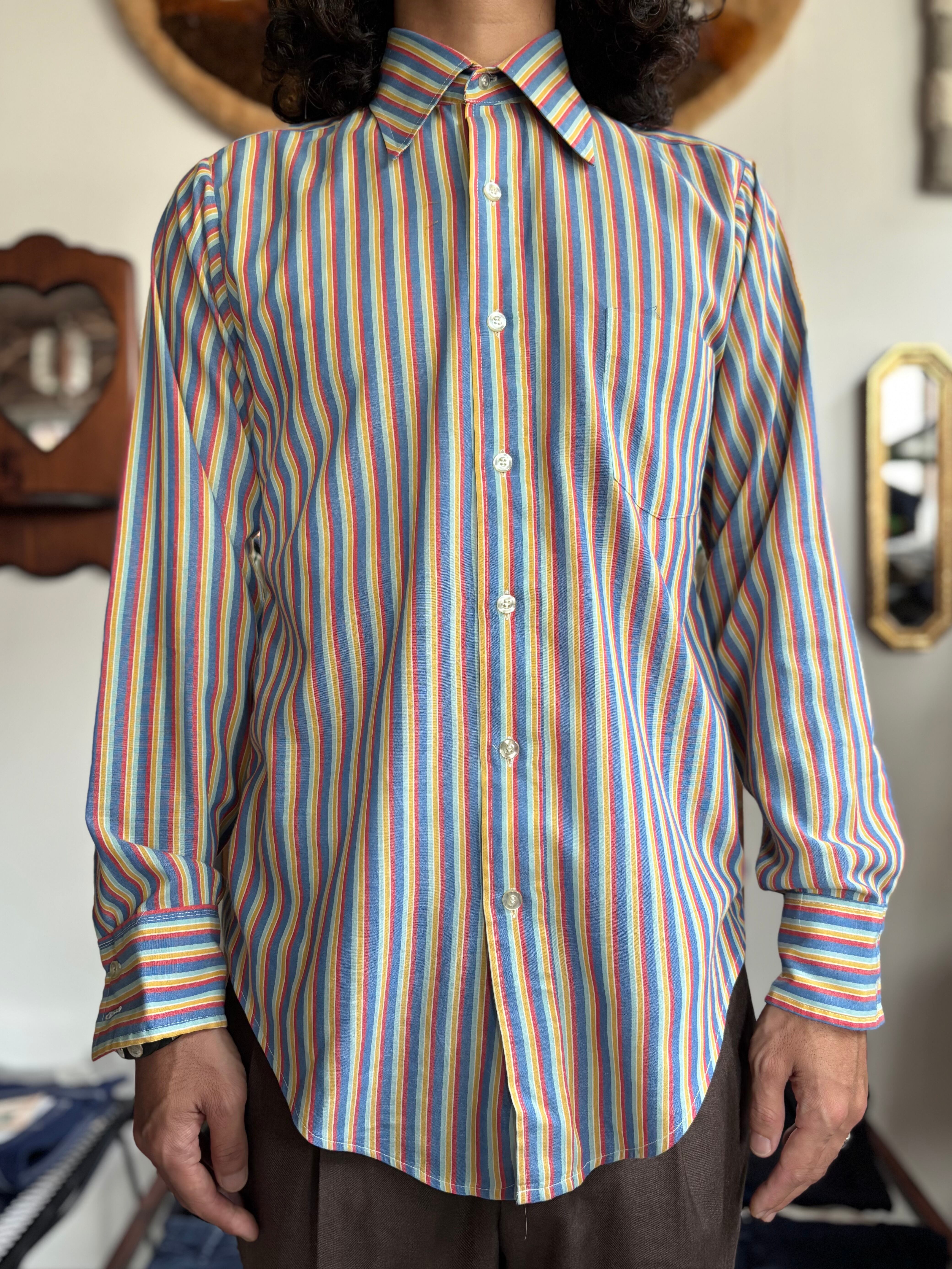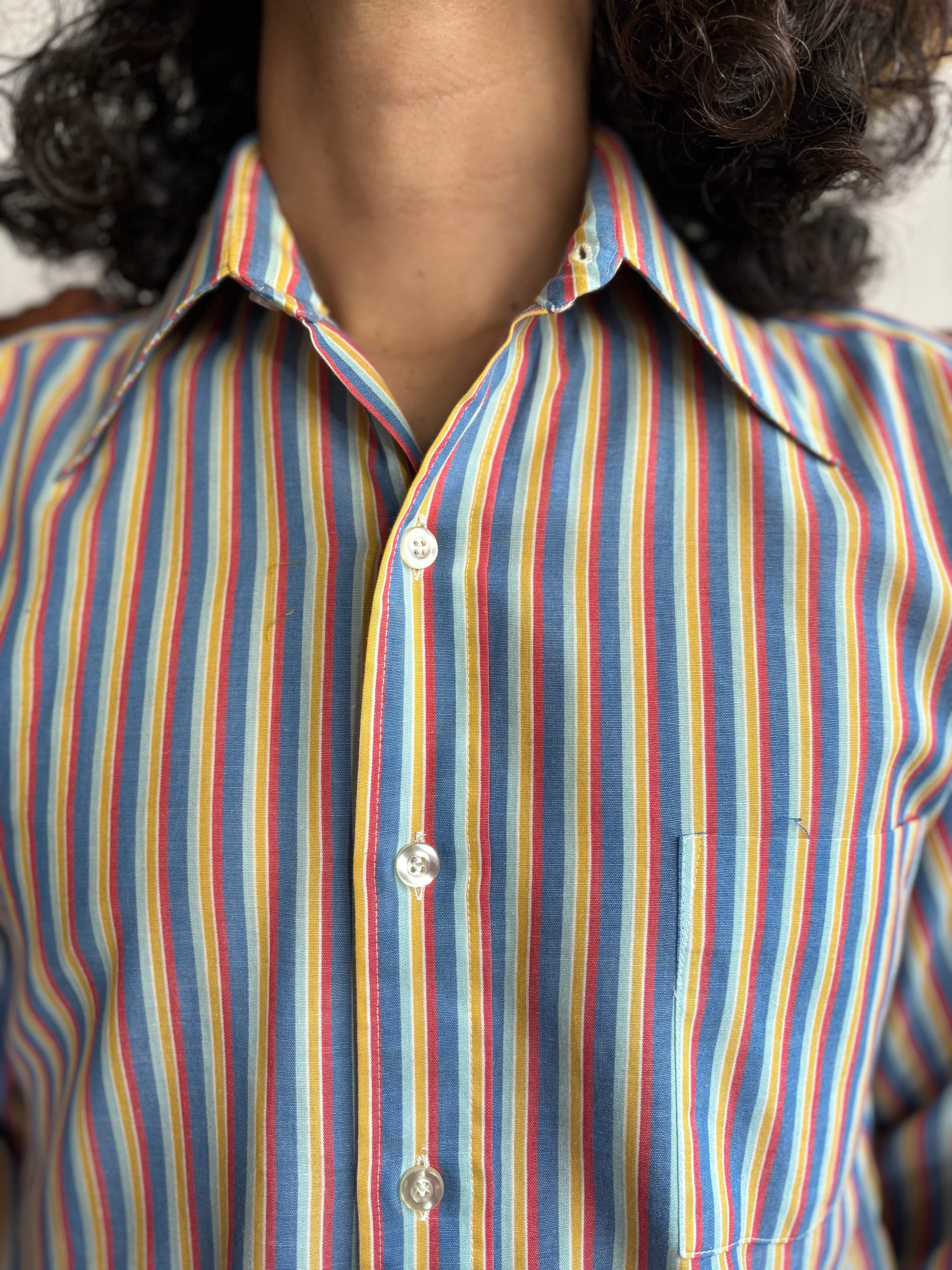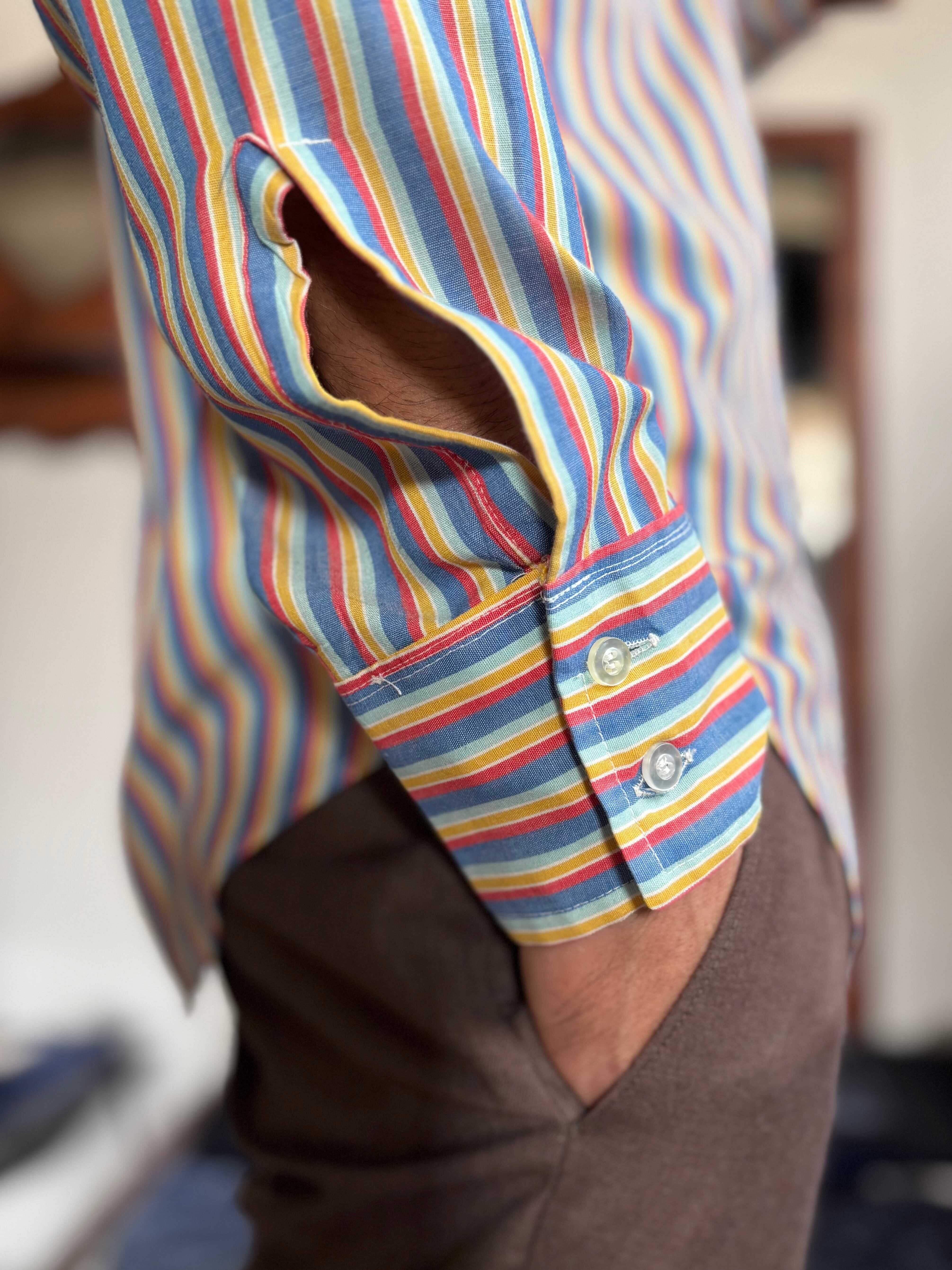 薄手のコットンポリ素材。すっきりしたジャストフィット。レトロなマルチストライプ。大きめの襟に、胸ポケット付き。クラシカルな印象のvan heusen製。