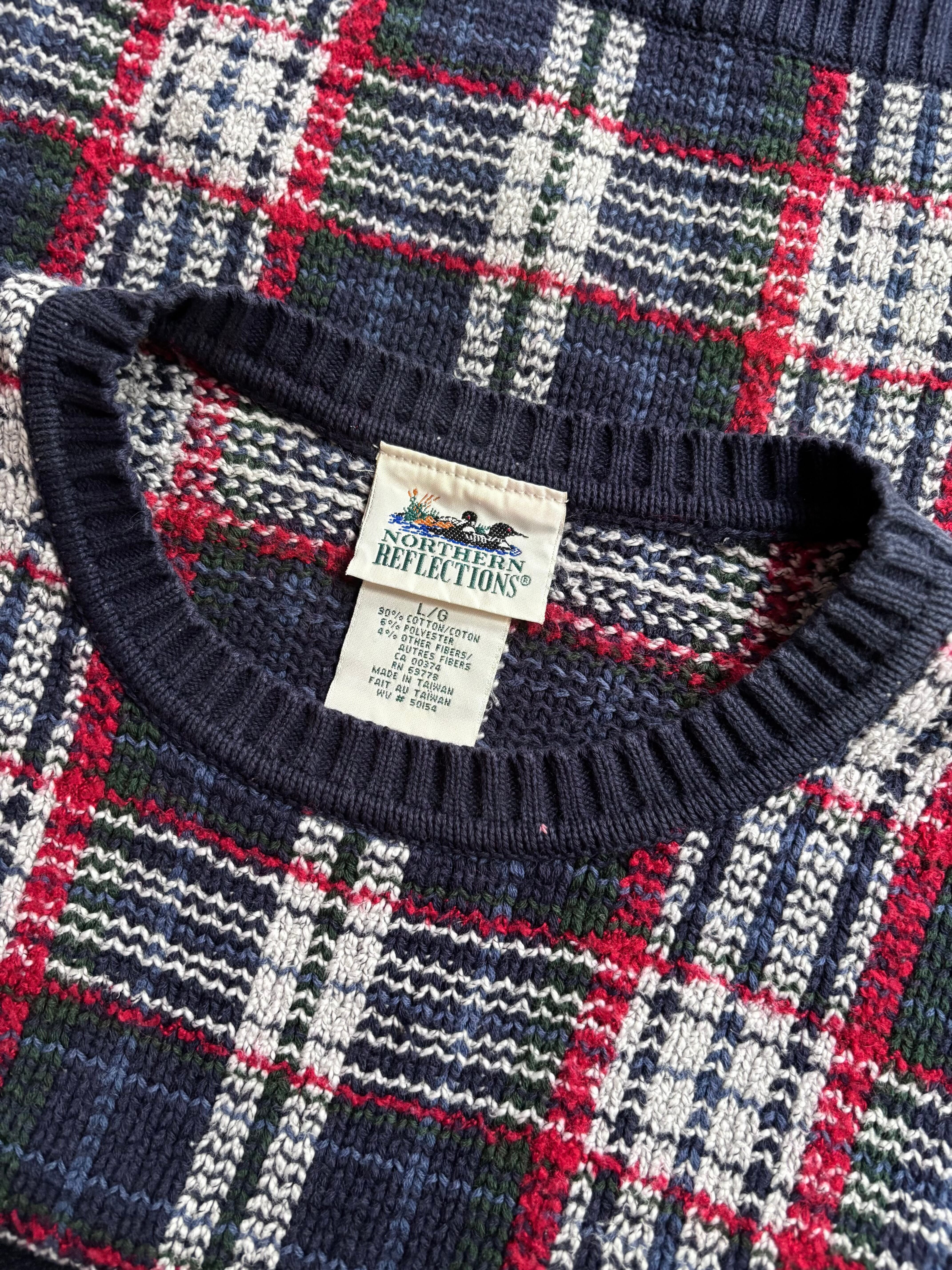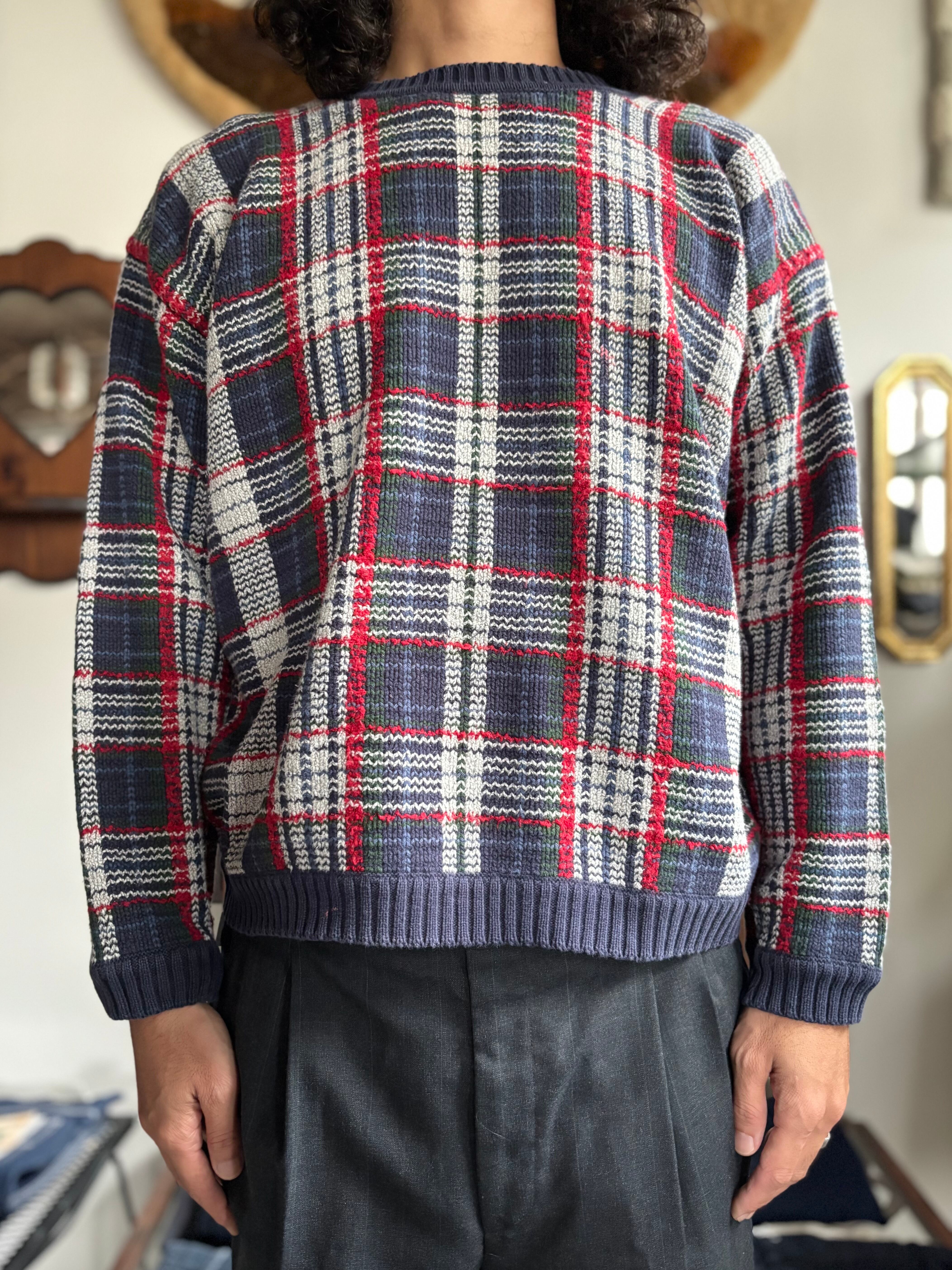 肉厚なコットンニット素材。丈短めのボックスシルエット。ブランケットのような大判のチェックパターン。