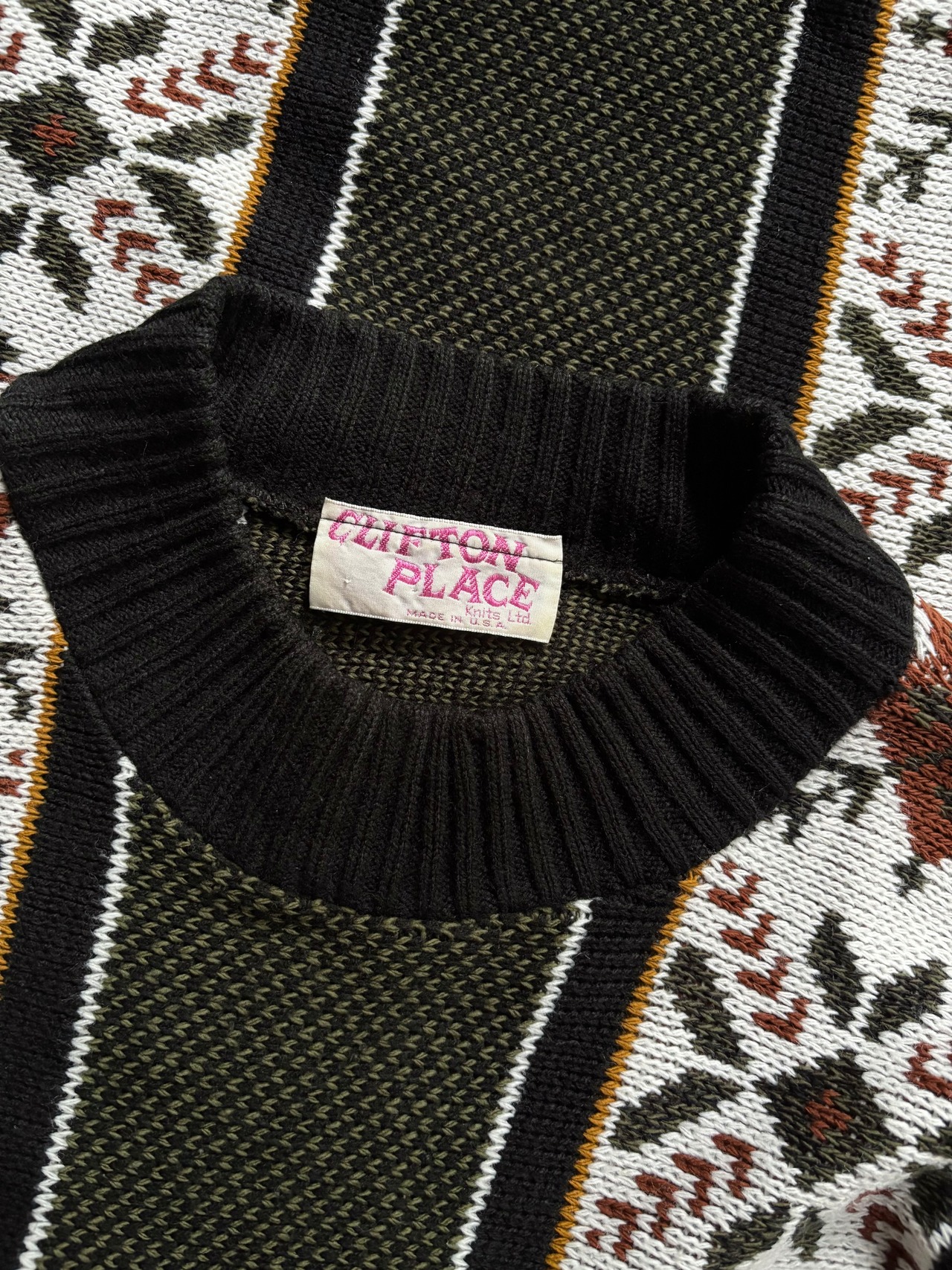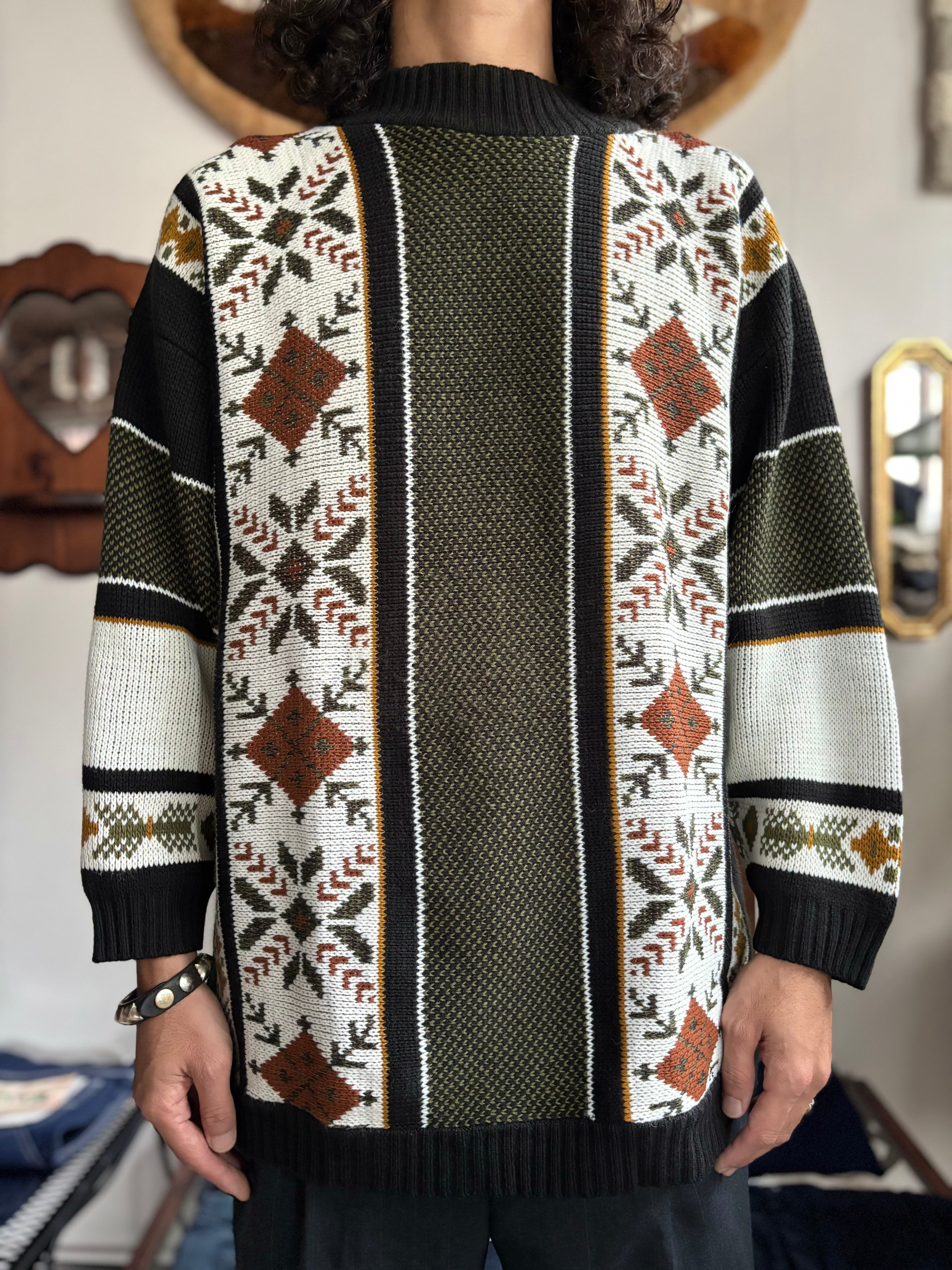 中厚のアクリルニット素材。ハーフ丈のリラックスフィット。落ち着いたオリーブベースに、クラシカルな総柄ファブリックがレトロなお洒落感抜群です。