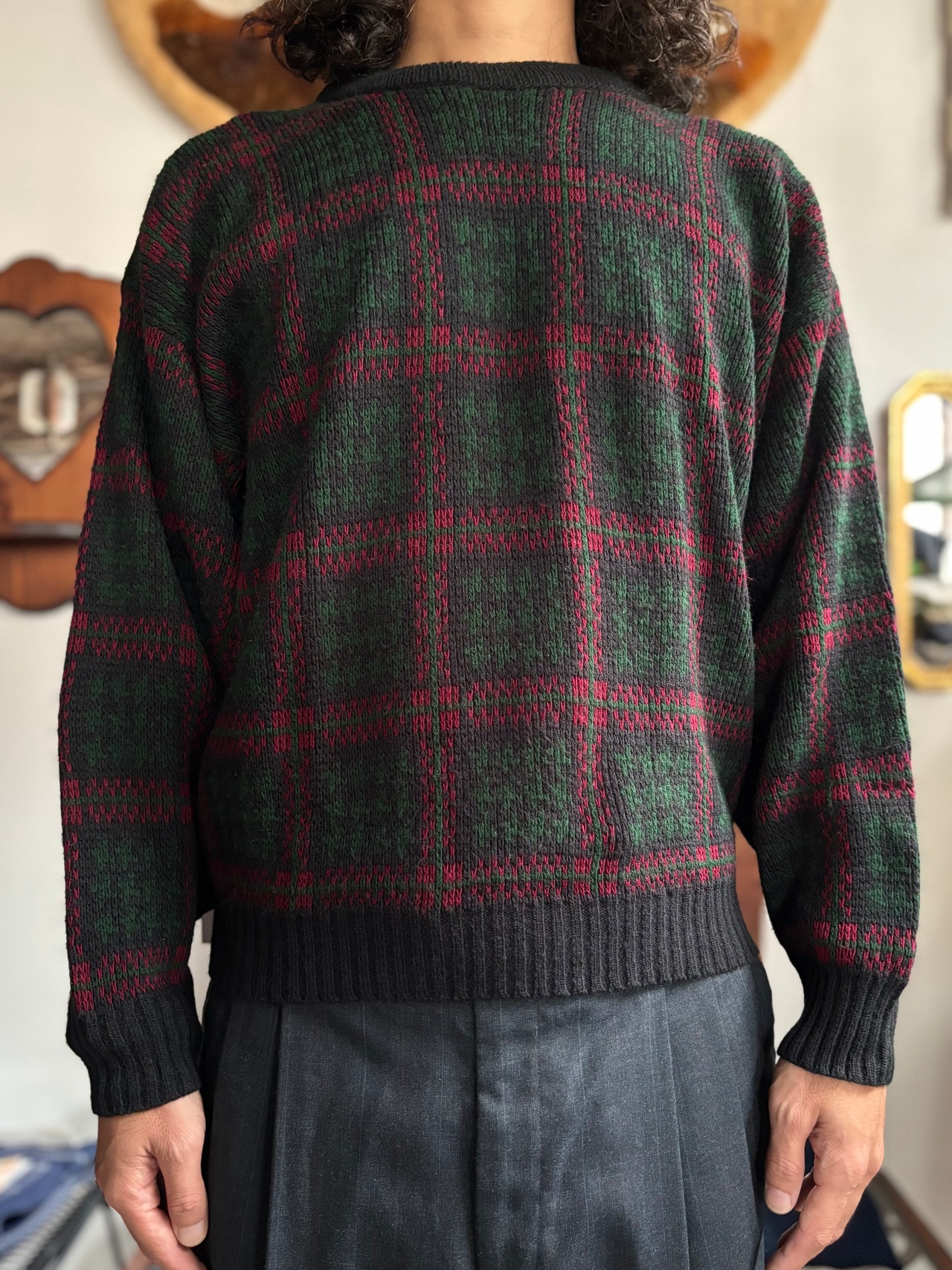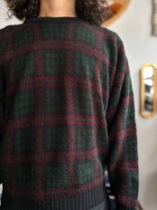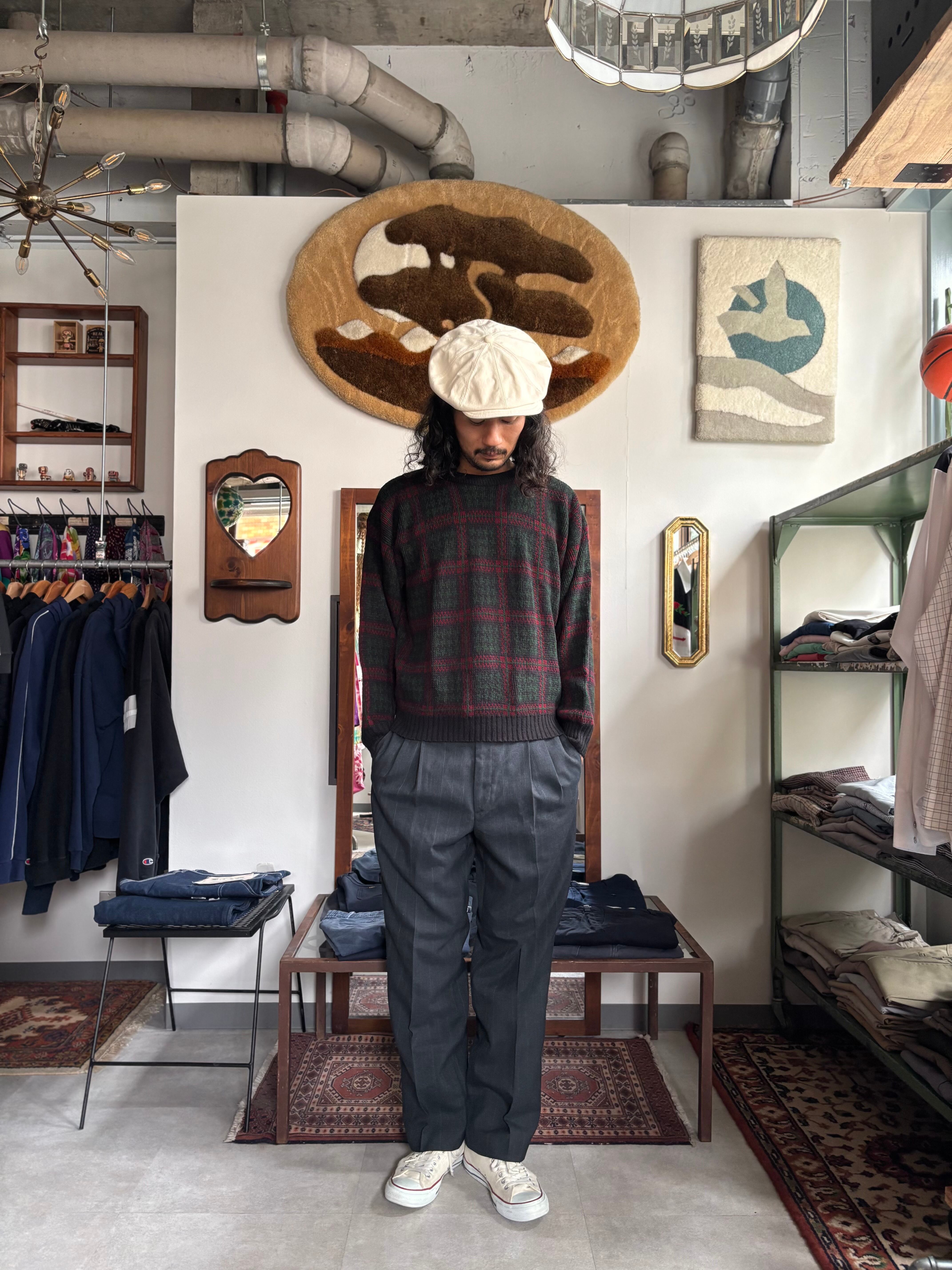 中厚のアクリルニット素材。オーセンティックフィット。ブランケットのような大判のチェックパターン。USA製のOLDモデル。