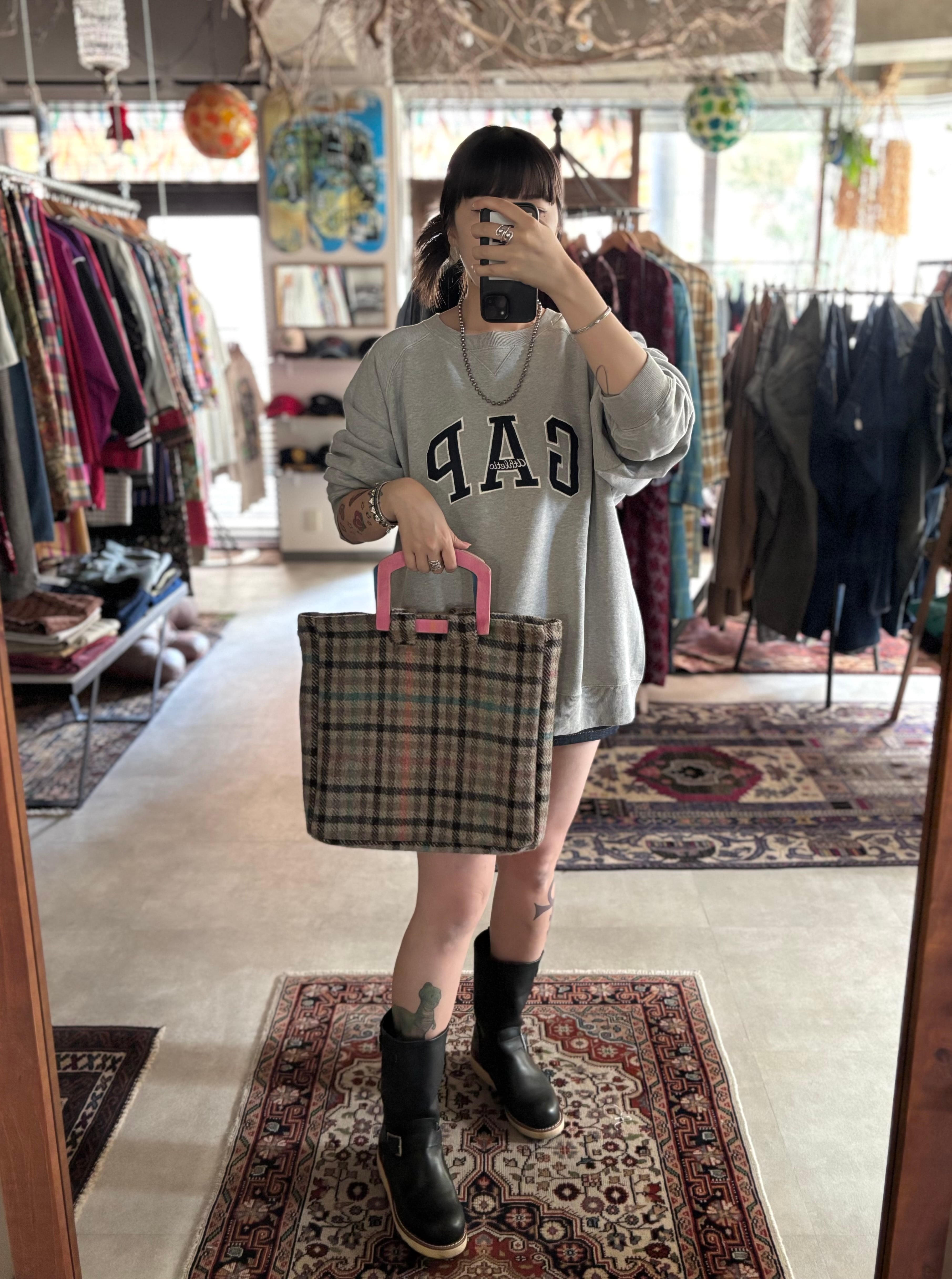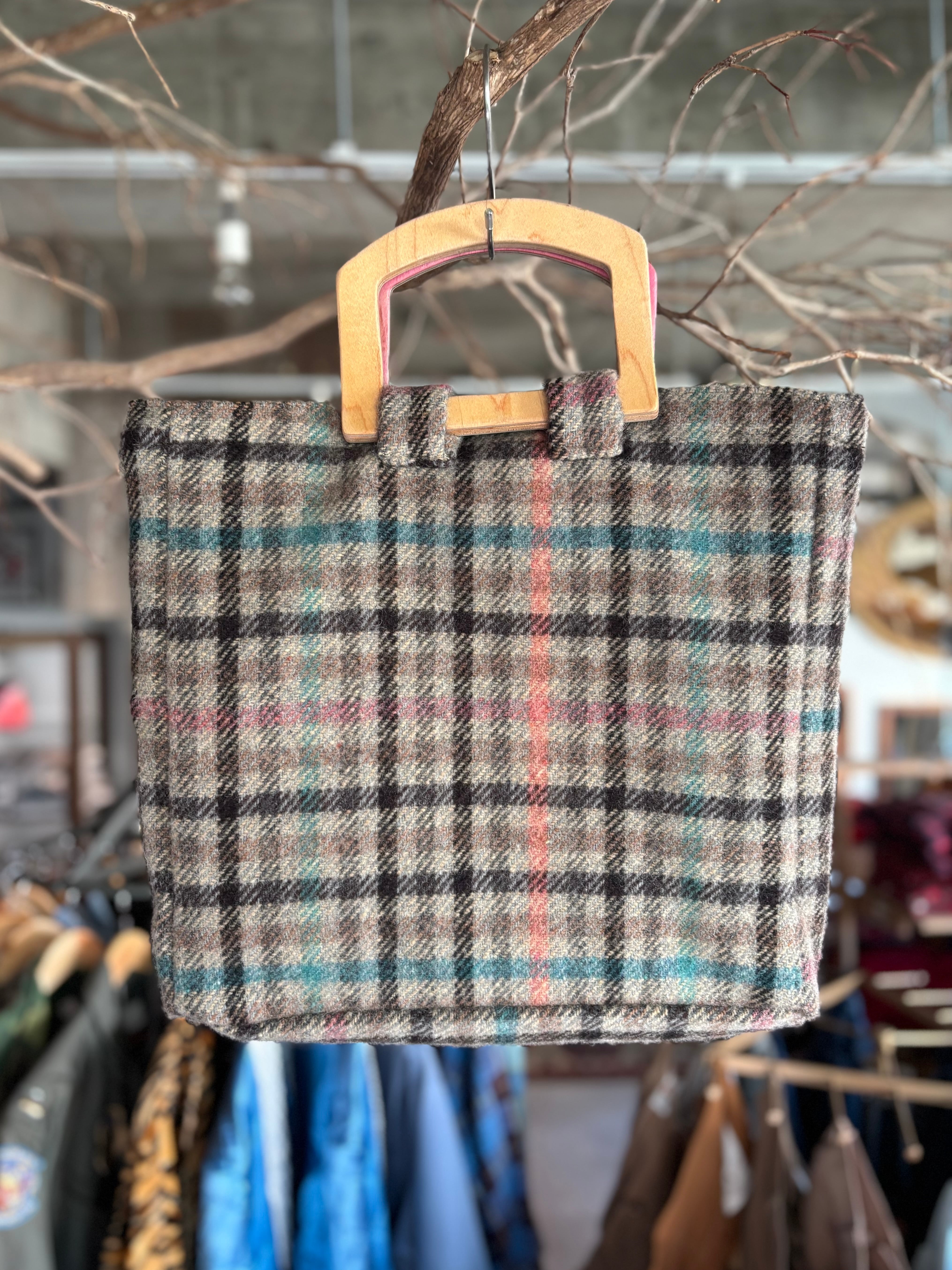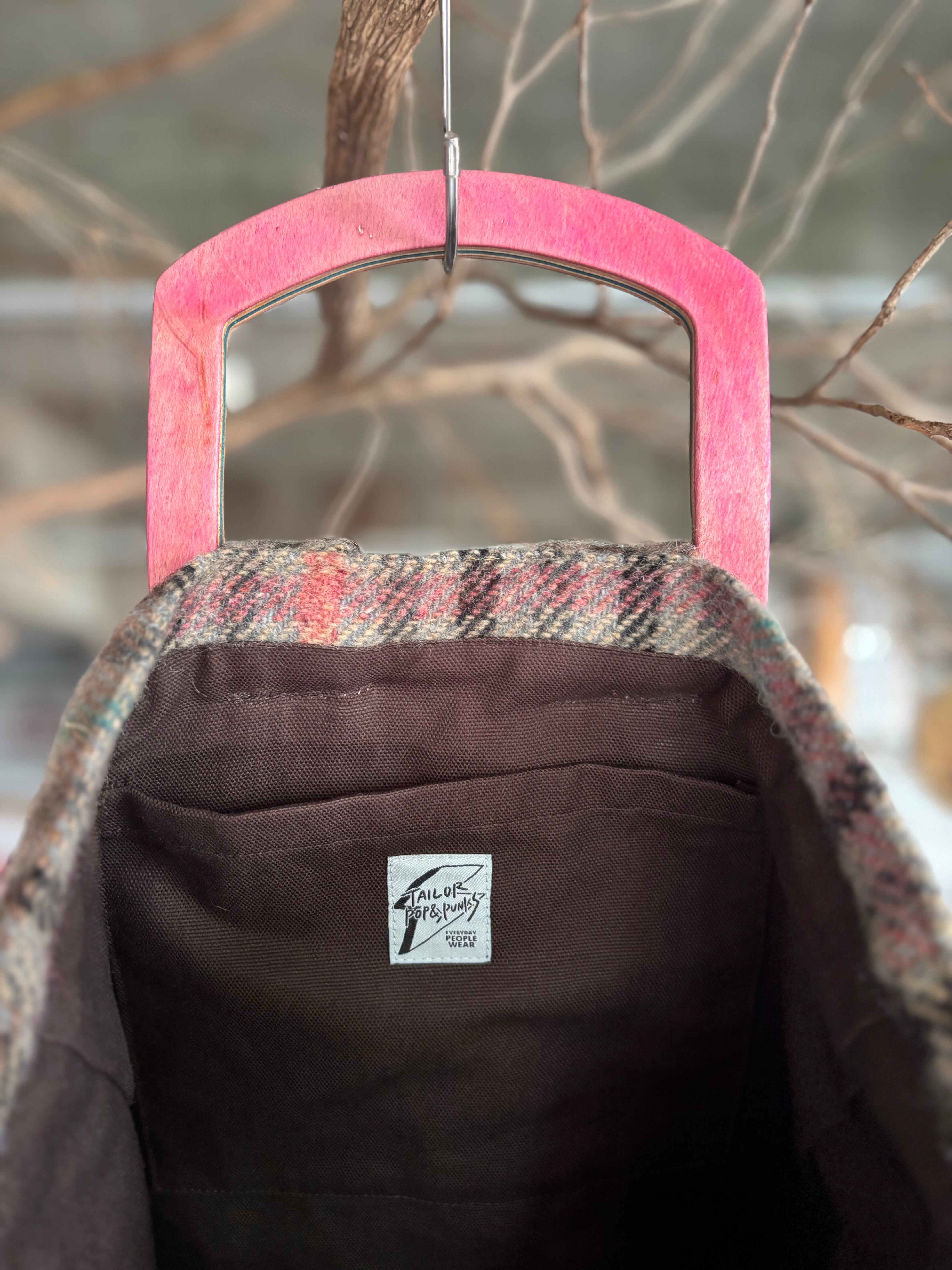 スケートボードデッキを再利用して製作したウッドハンドルに、イギリス製のブランケット生地を用いたオリジナルトートバッグ。ライナーには帆布生地を使用し、内ポケットも備えています。取手の形、ブランケットパターン、ライナーカラーとそれぞれに異なる一点もの仕様。上質なウール生地と、オイル仕上げで磨かれたハンドルの組み合わせは、コーディネートの主役になる存在感があります。重くなりがちな秋冬スタイルのアクセントにいかがでしょうか。