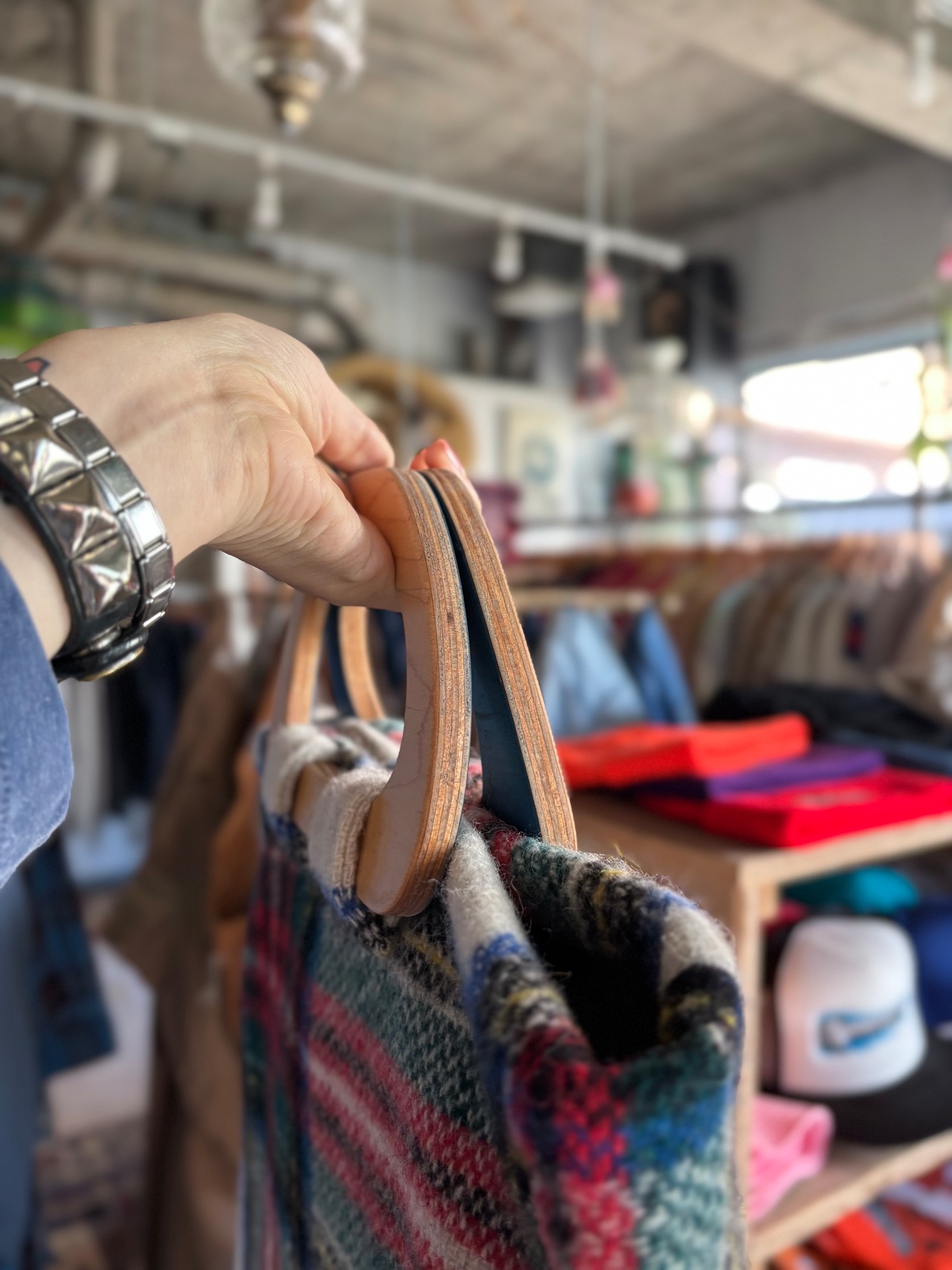 スケートボードデッキを再利用して製作したウッドハンドルに、イギリス製のブランケット生地を用いたオリジナルトートバッグ。ライナーには帆布生地を使用し、内ポケットも備えています。取手の形、ブランケットパターン、ライナーカラーとそれぞれに異なる一点もの仕様。上質なウール生地と、オイル仕上げで磨かれたハンドルの組み合わせは、コーディネートの主役になる存在感があります。重くなりがちな秋冬スタイルのアクセントにいかがでしょうか。