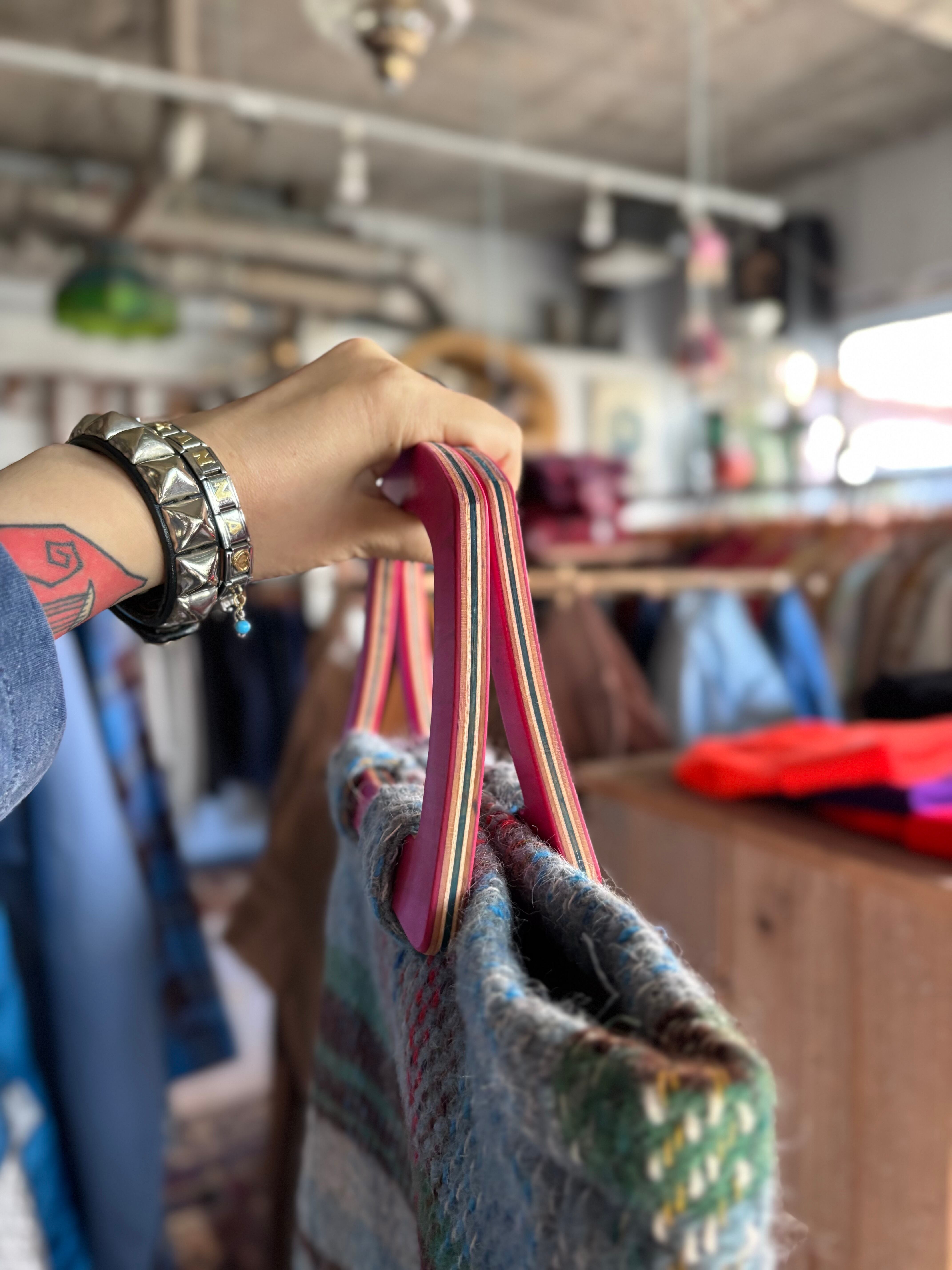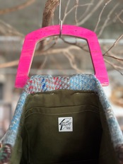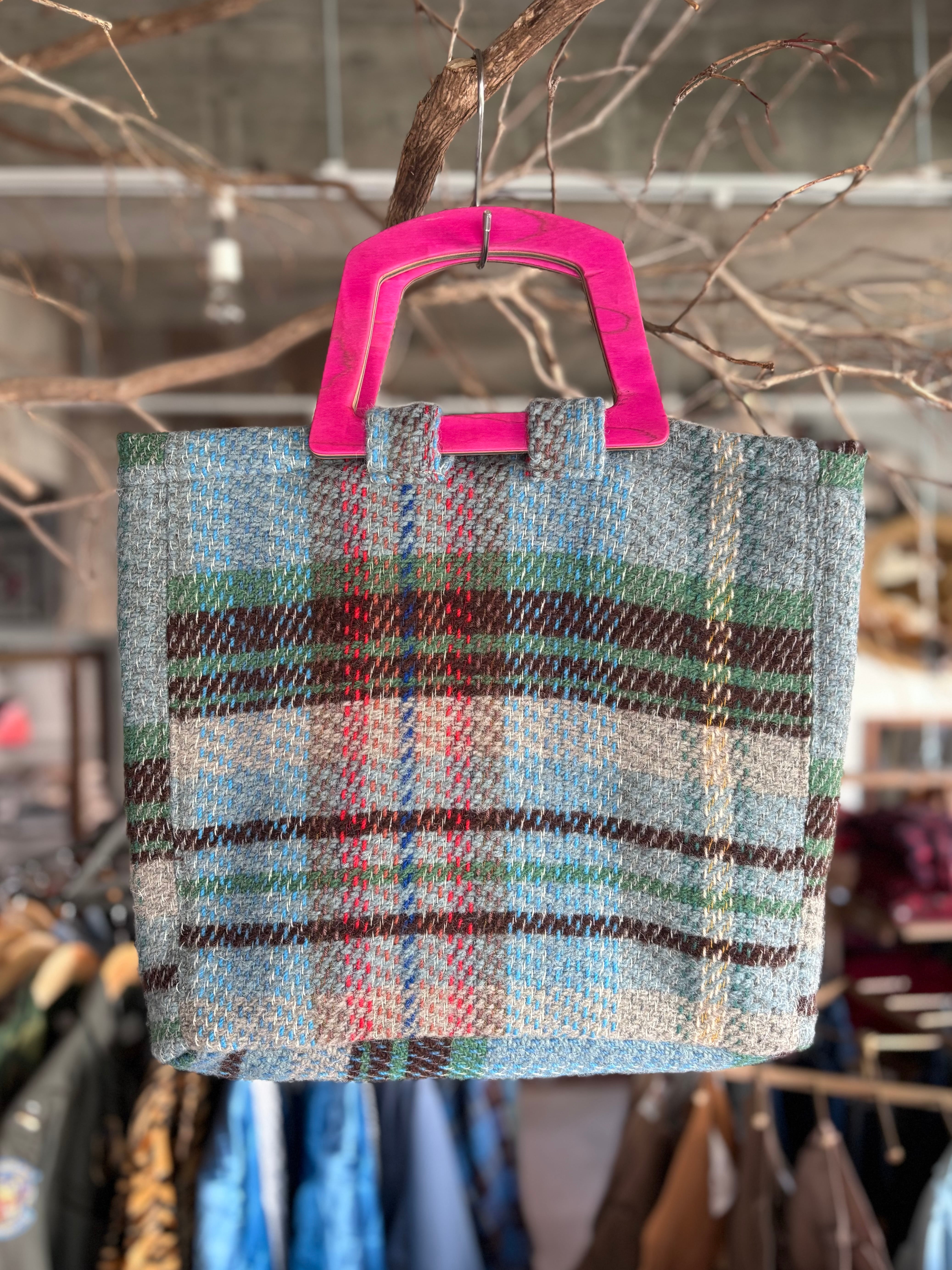スケートボードデッキを再利用して製作したウッドハンドルに、イギリス製のブランケット生地を用いたオリジナルトートバッグ。ライナーには帆布生地を使用し、内ポケットも備えています。取手の形、ブランケットパターン、ライナーカラーとそれぞれに異なる一点もの仕様。上質なウール生地と、オイル仕上げで磨かれたハンドルの組み合わせは、コーディネートの主役になる存在感があります。重くなりがちな秋冬スタイルのアクセントにいかがでしょうか。
