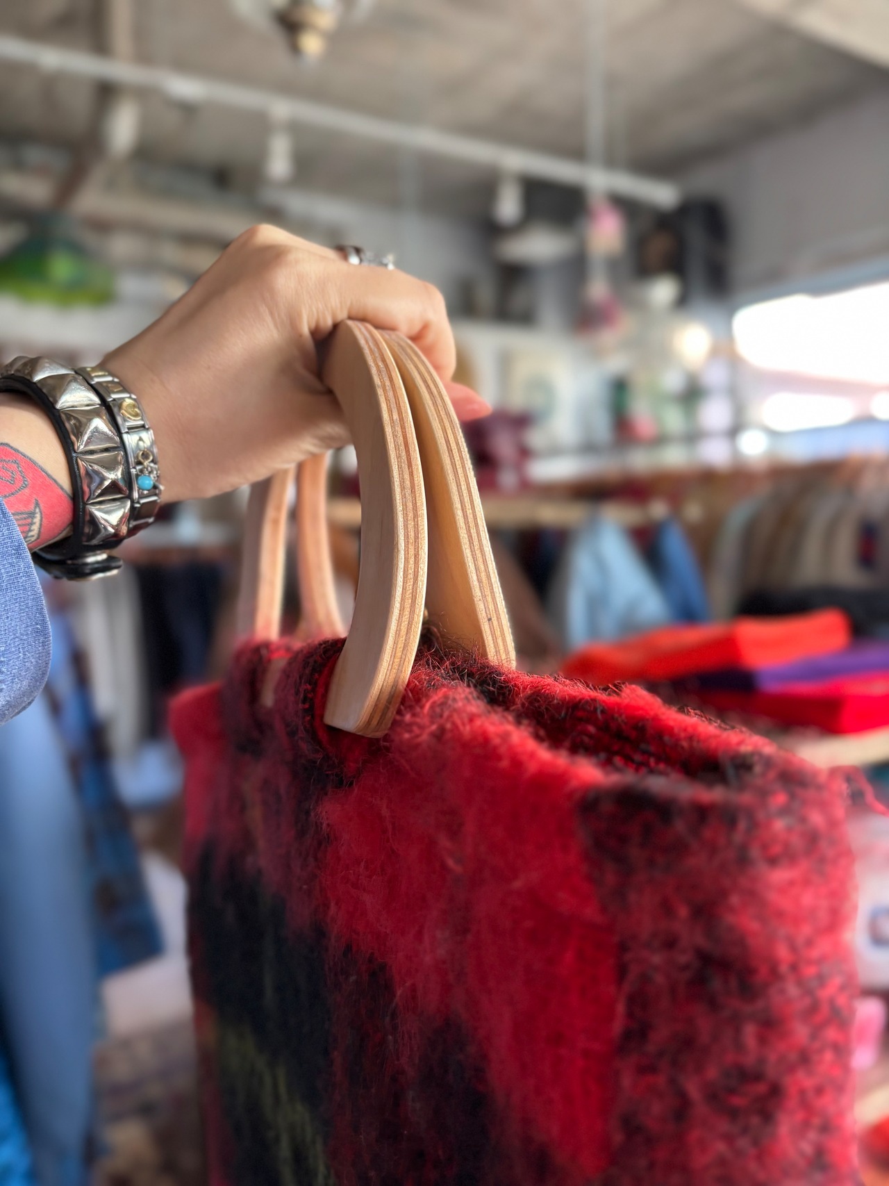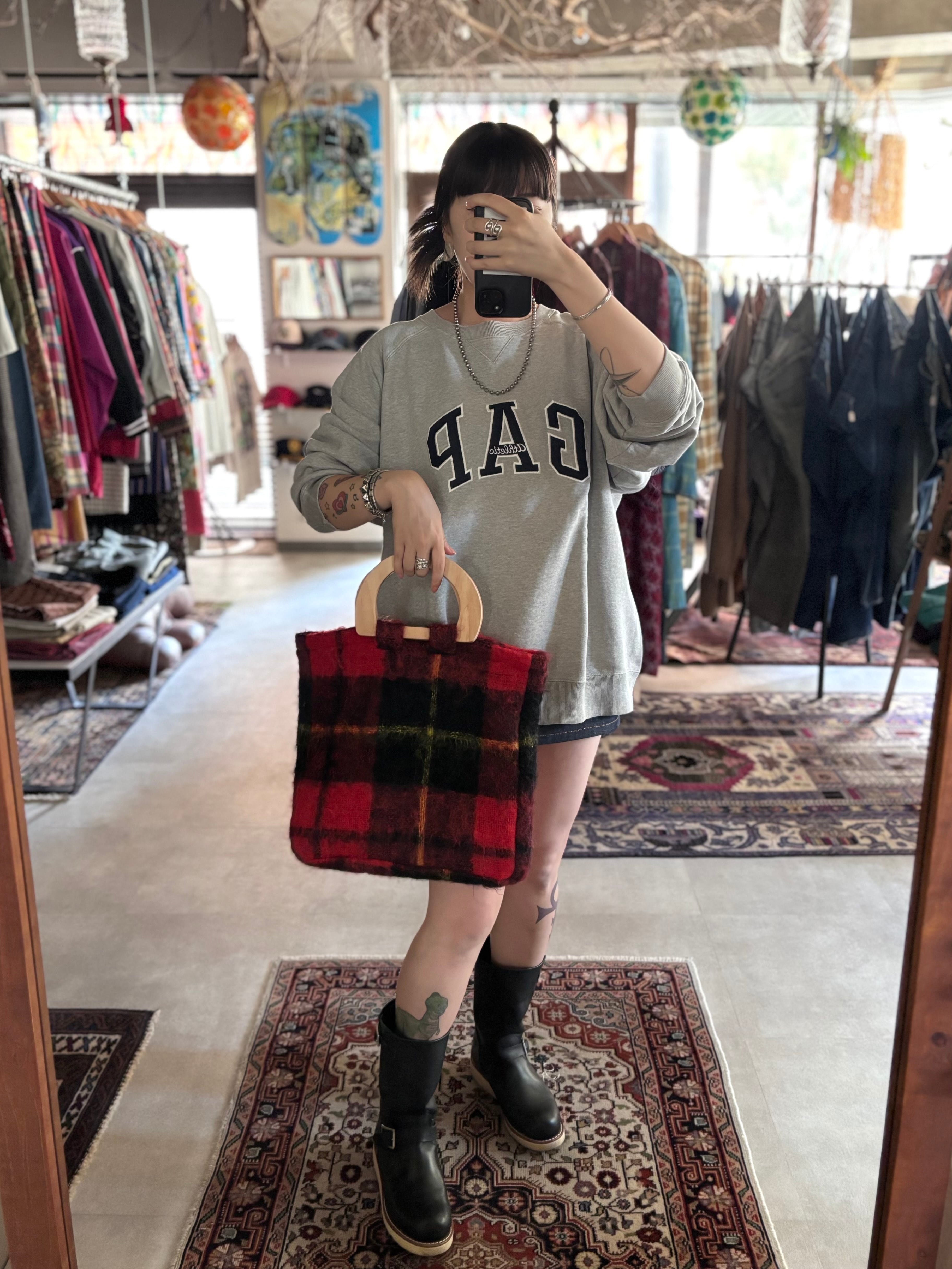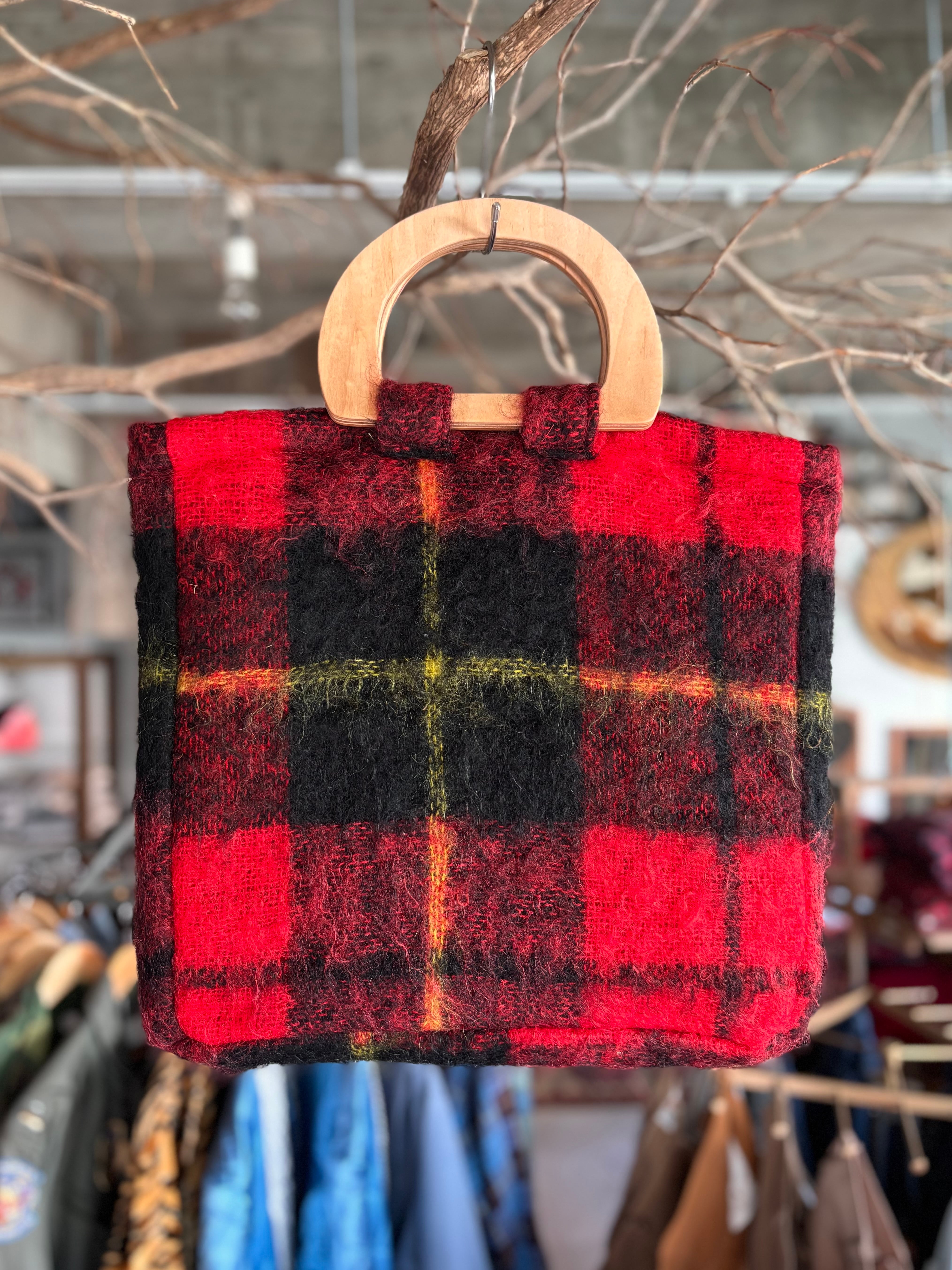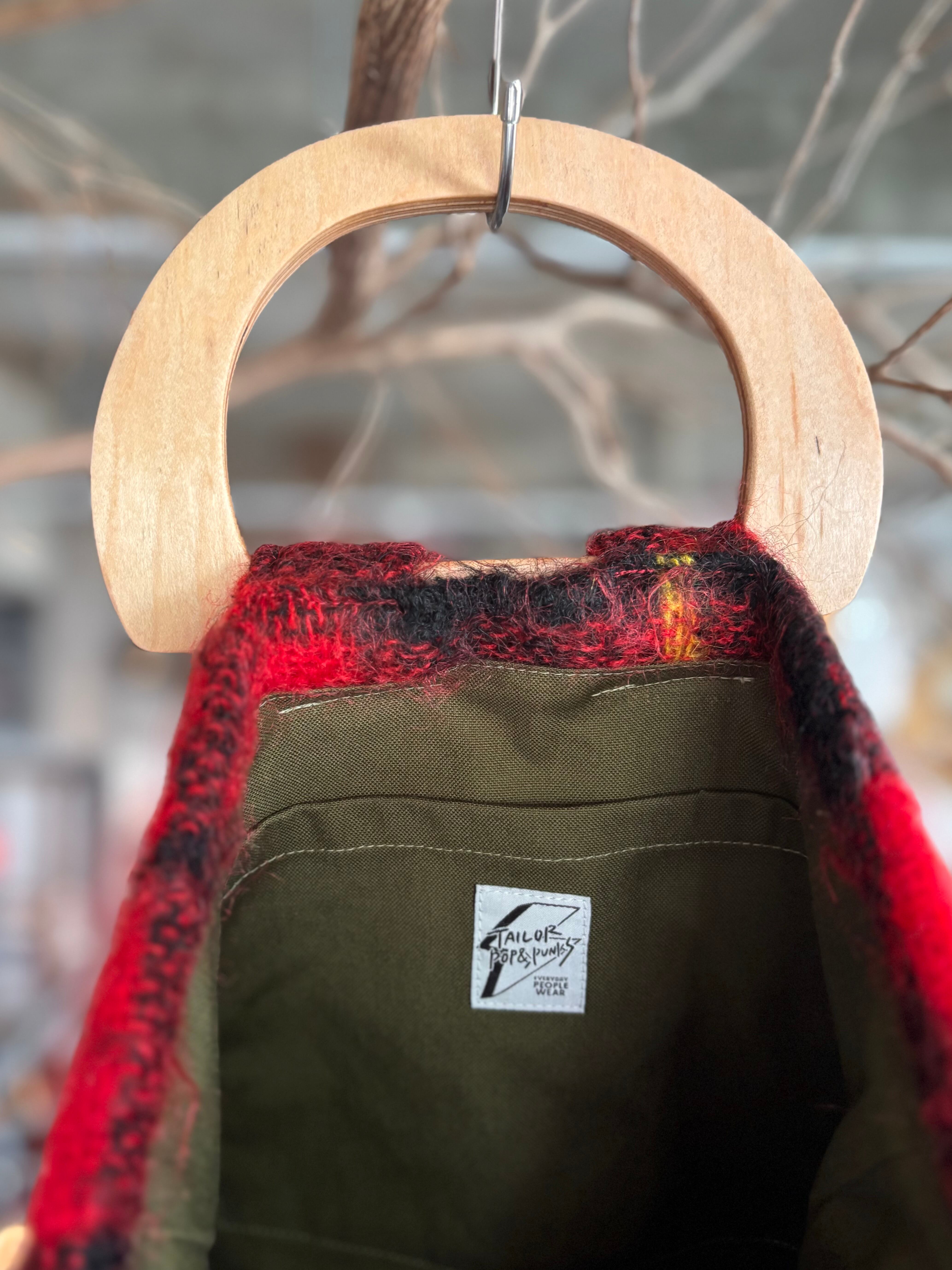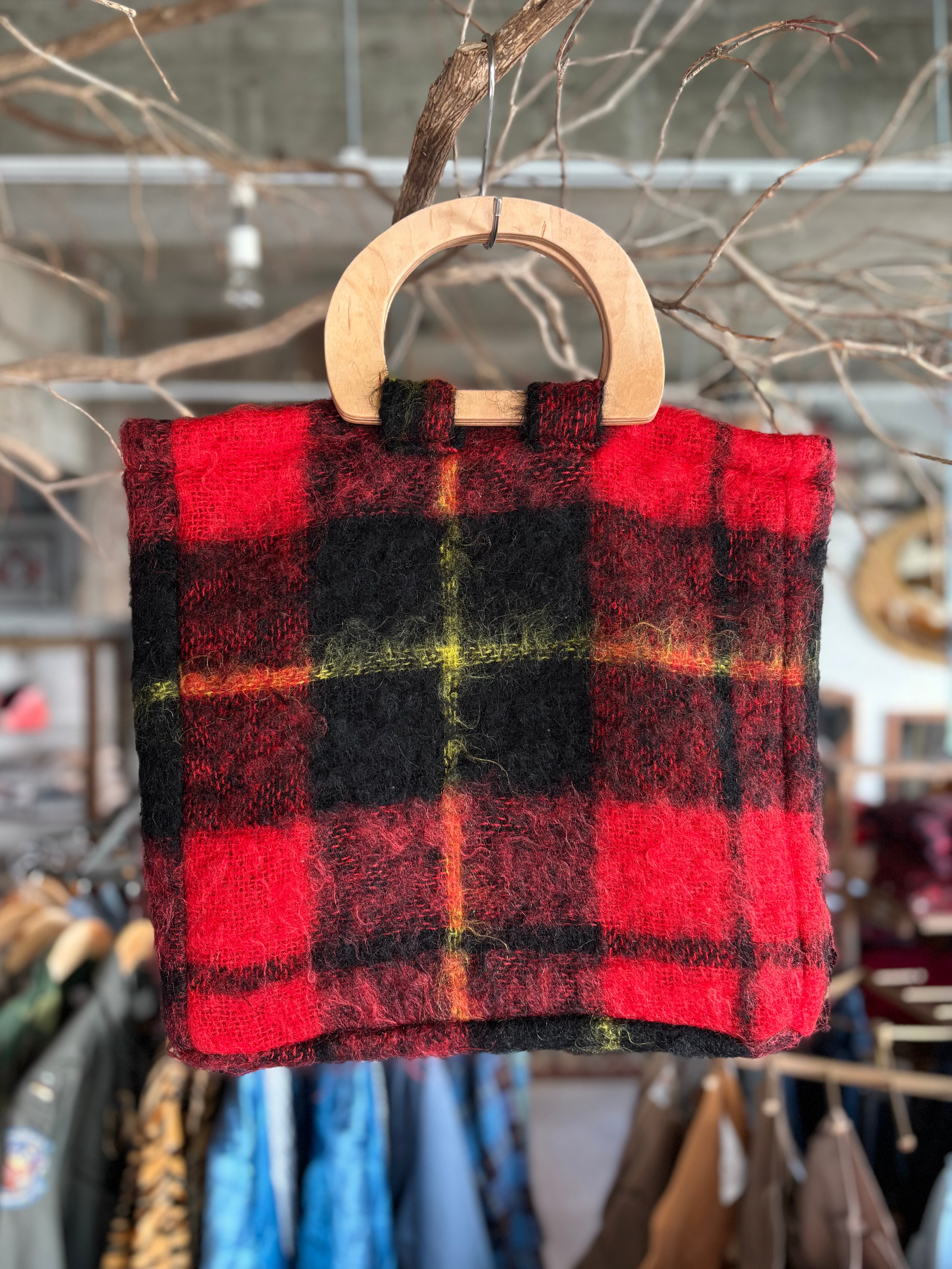 スケートボードデッキを再利用して製作したウッドハンドルに、イギリス製のブランケット生地を用いたオリジナルトートバッグ。ライナーには帆布生地を使用し、内ポケットも備えています。取手の形、ブランケットパターン、ライナーカラーとそれぞれに異なる一点もの仕様。上質なウール生地と、オイル仕上げで磨かれたハンドルの組み合わせは、コーディネートの主役になる存在感があります。重くなりがちな秋冬スタイルのアクセントにいかがでしょうか。
