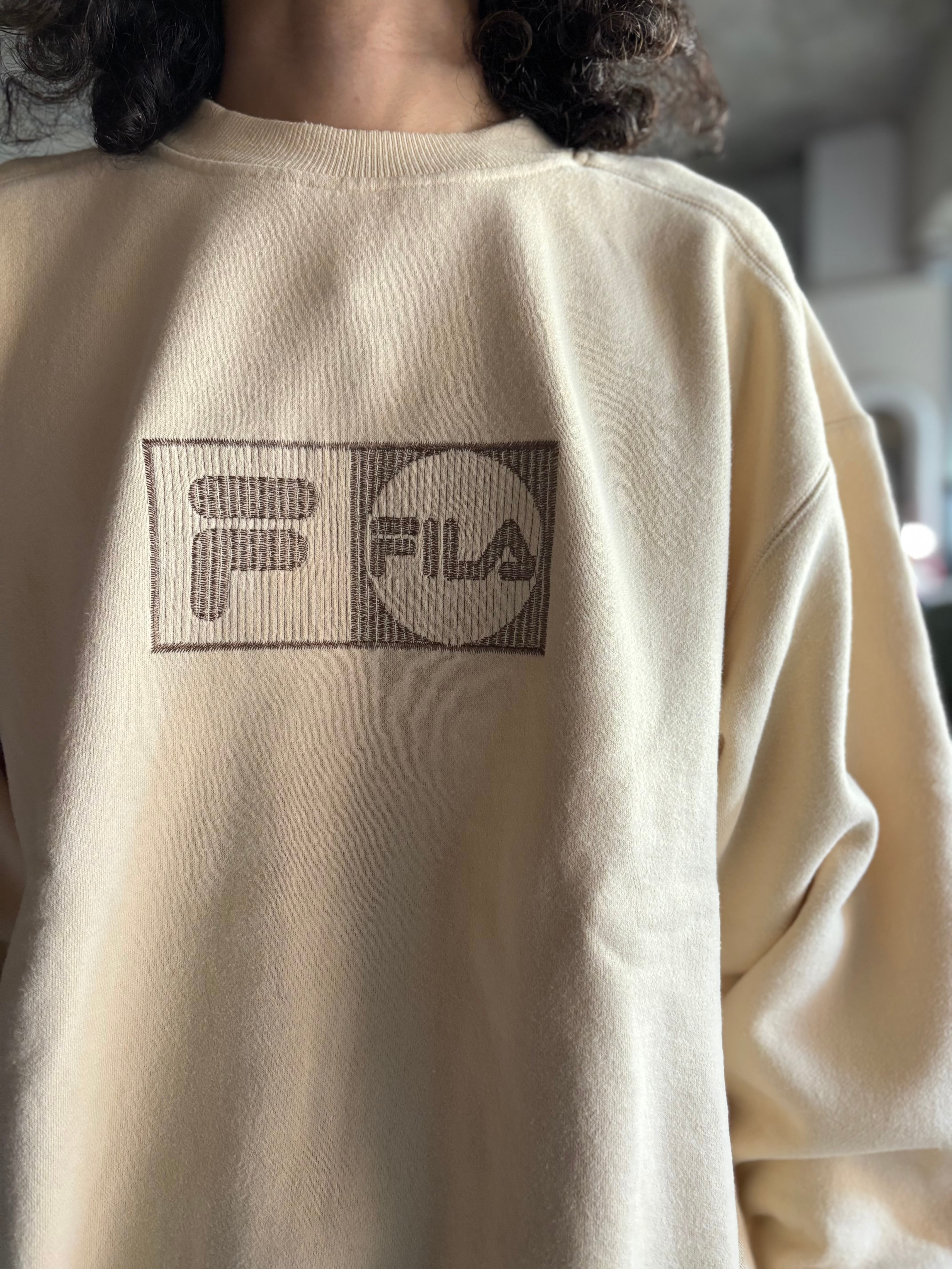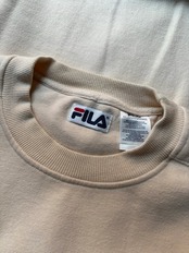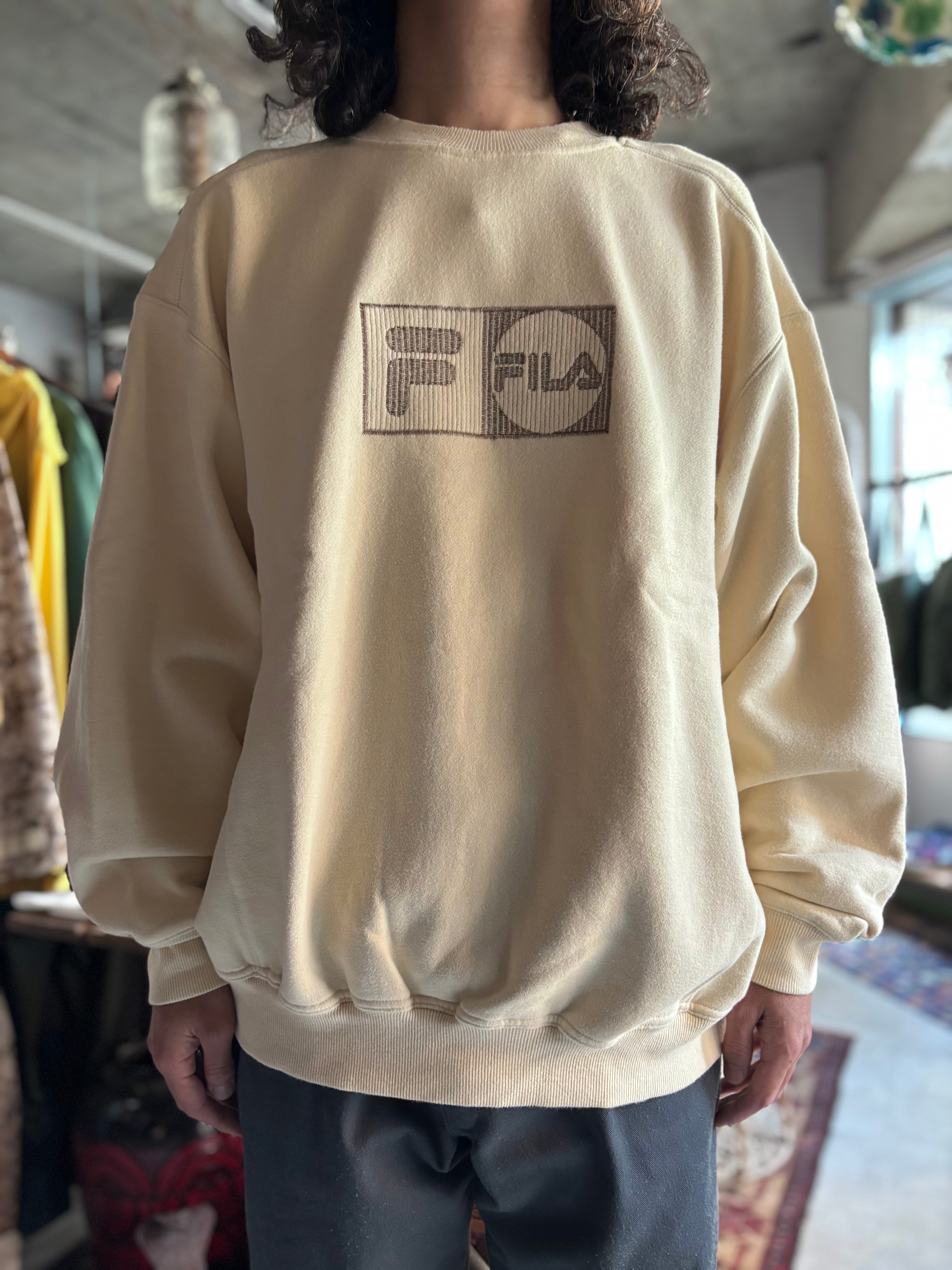 厚手のコットンポリ素材。ルーズフィット。サイドに切り替え、ネック裏に補強パーツ付き。OLD SCHOOLな印象のFILA製。