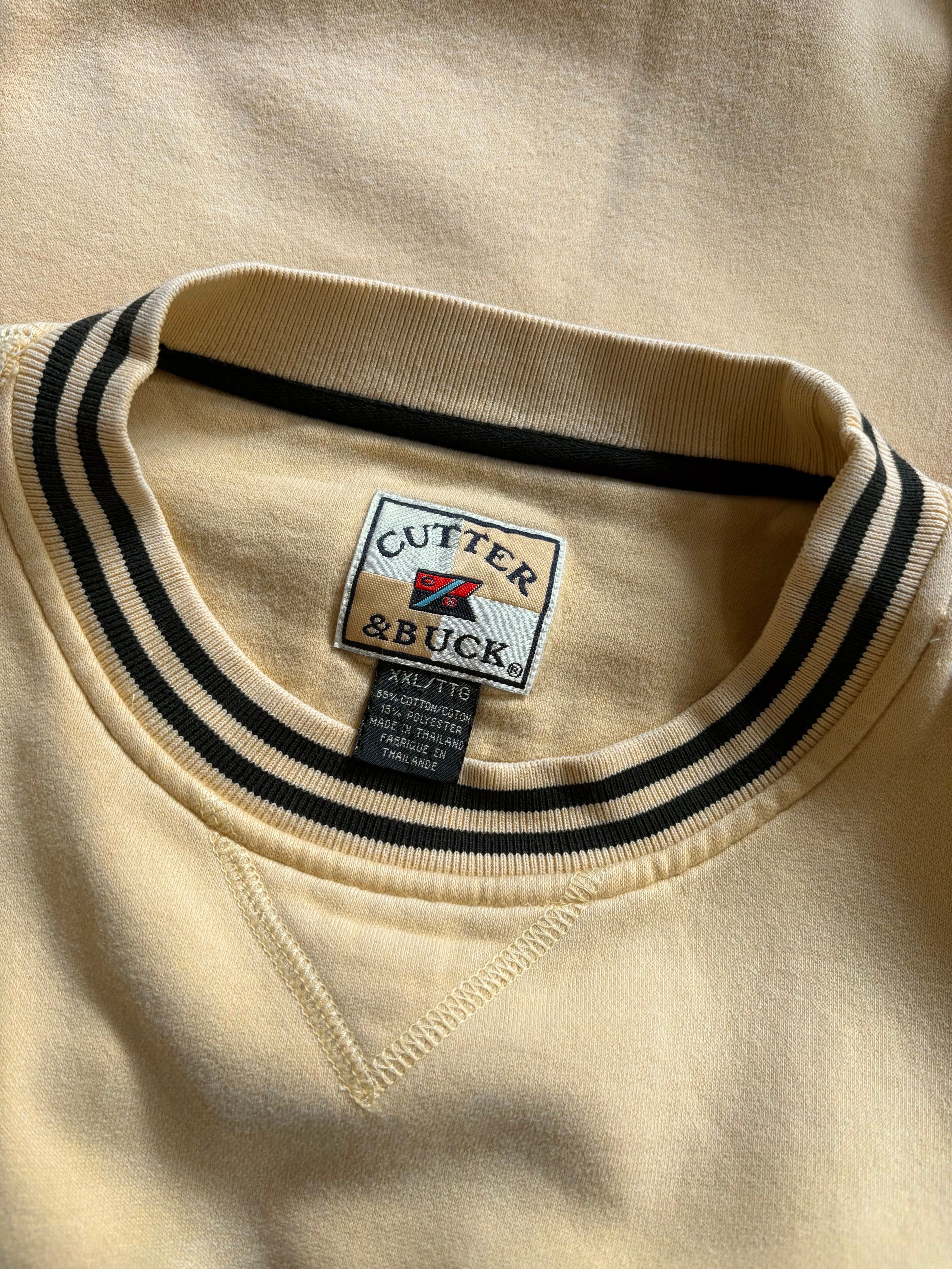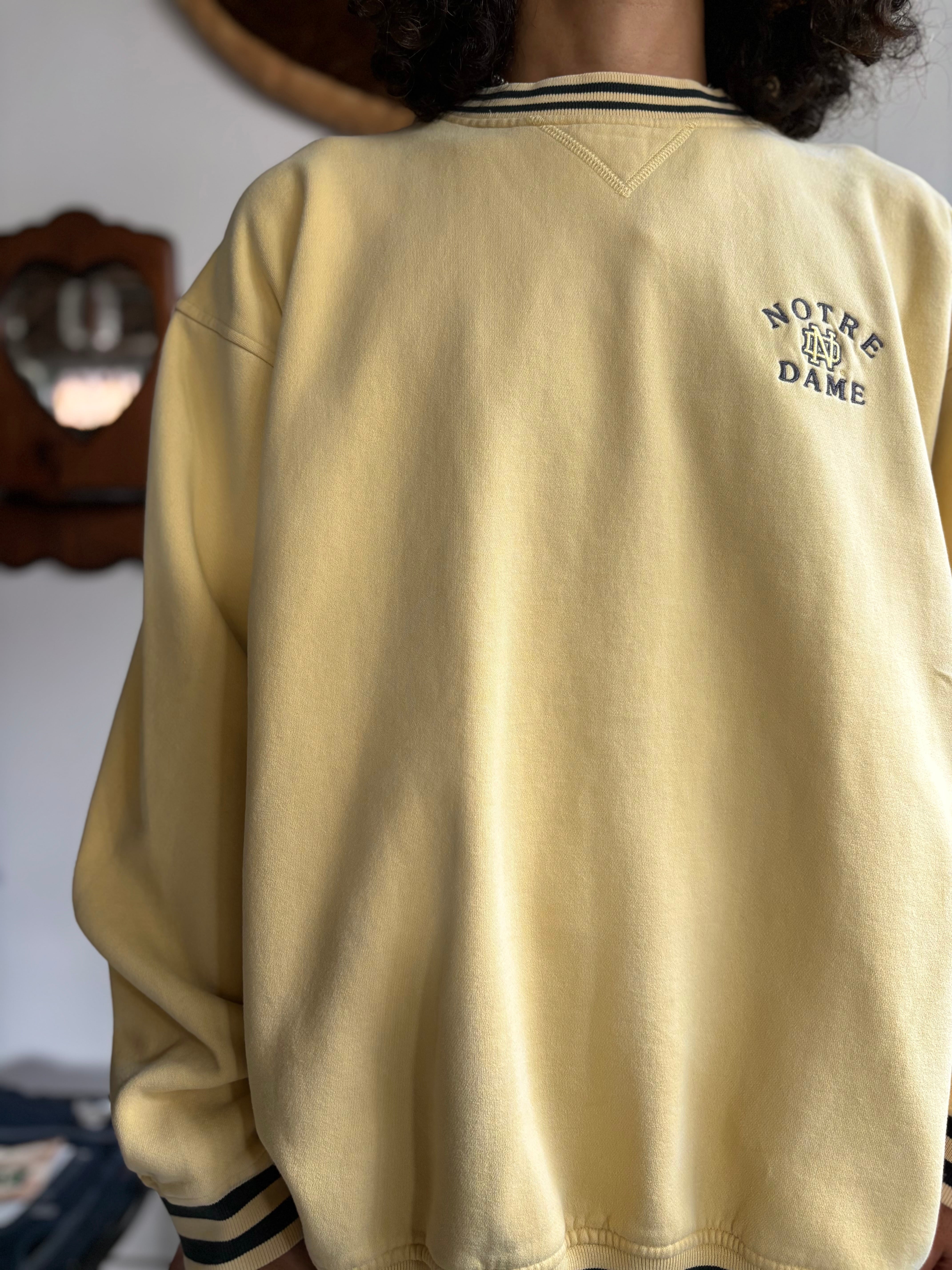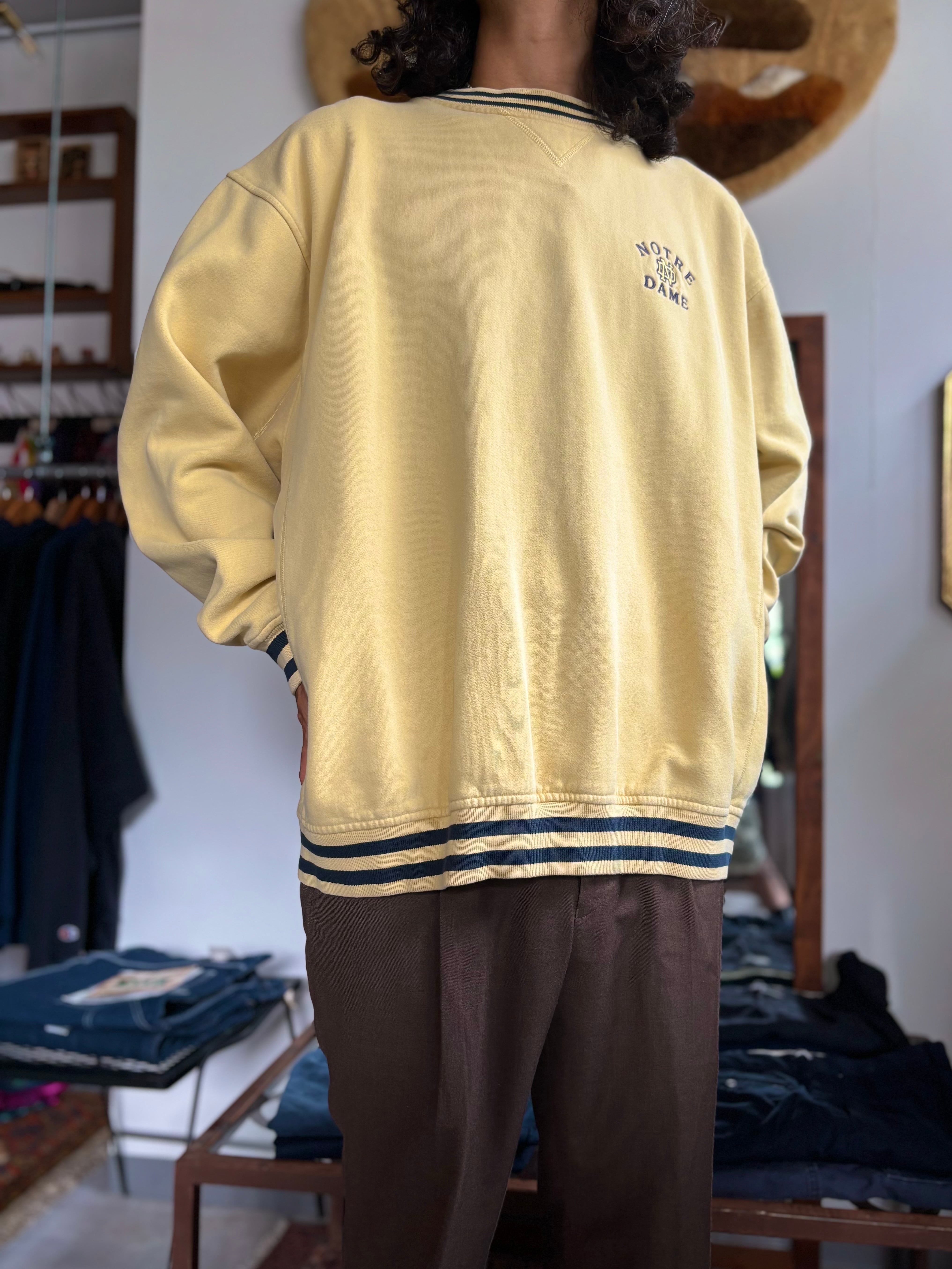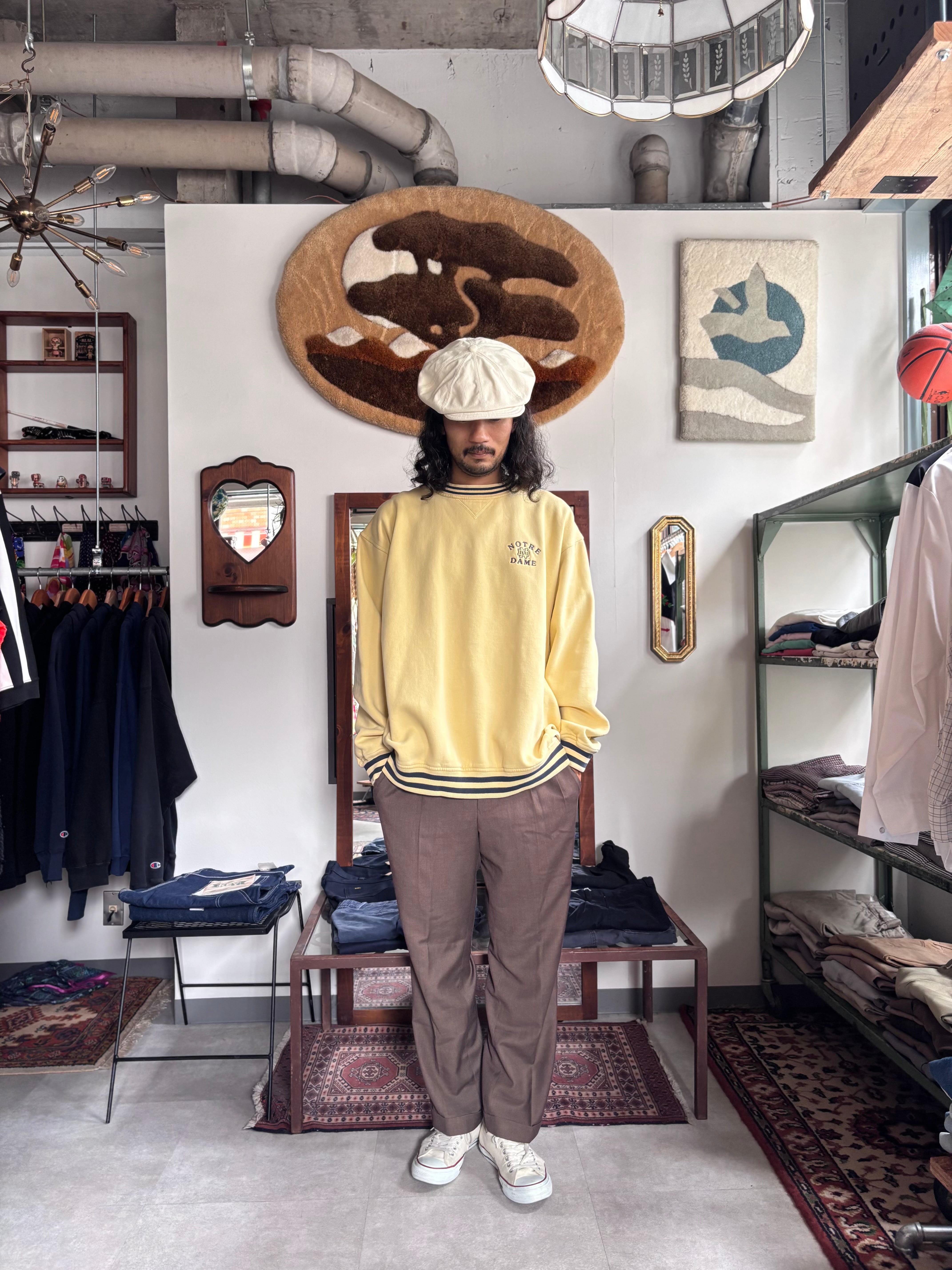 厚手のコットンポリ素材。ルーズフィット。サイドに切り替え、ネック裏に補強パーツ付き、リブライン入り。カレッジの刺繍グラフィック。