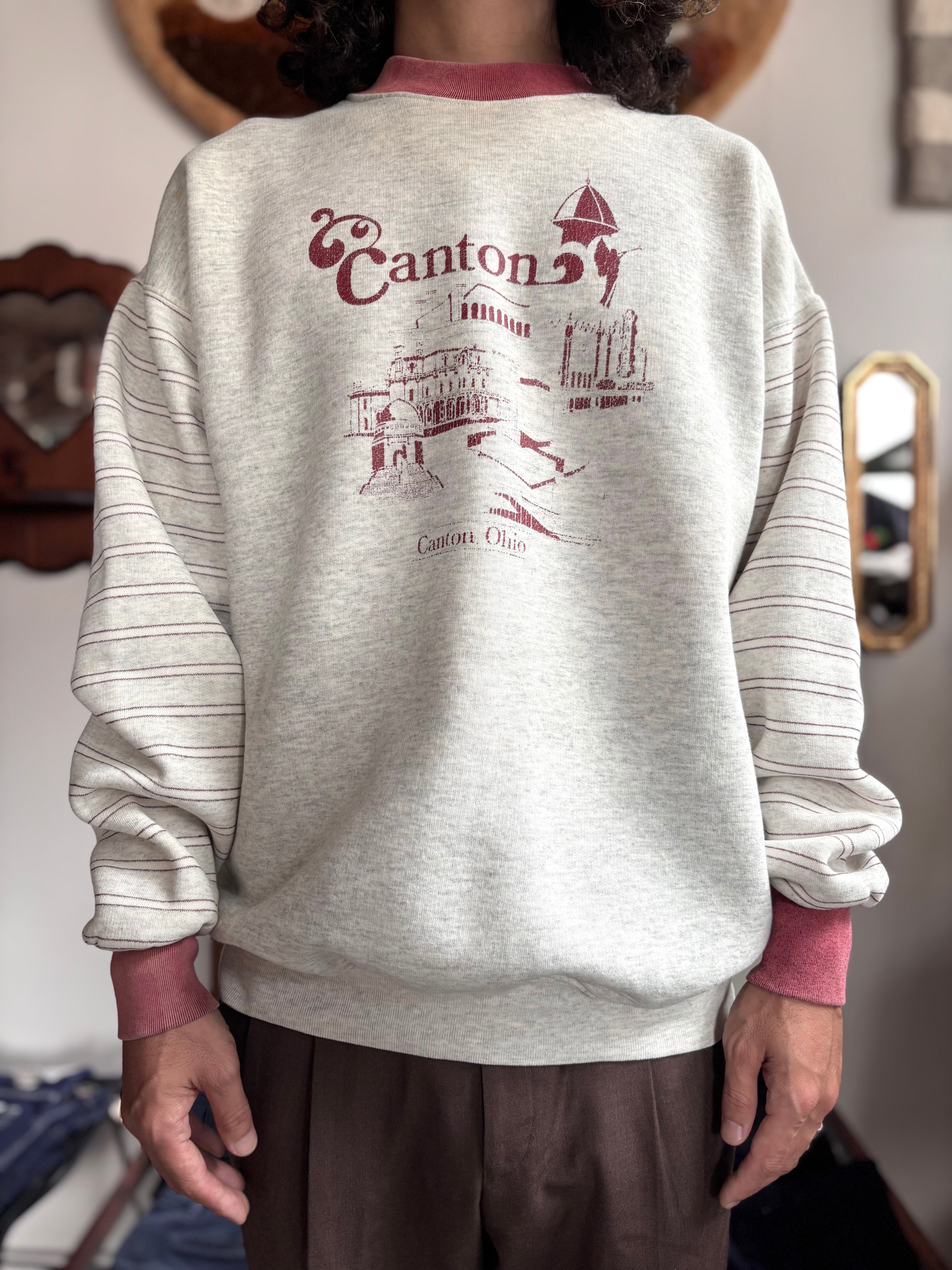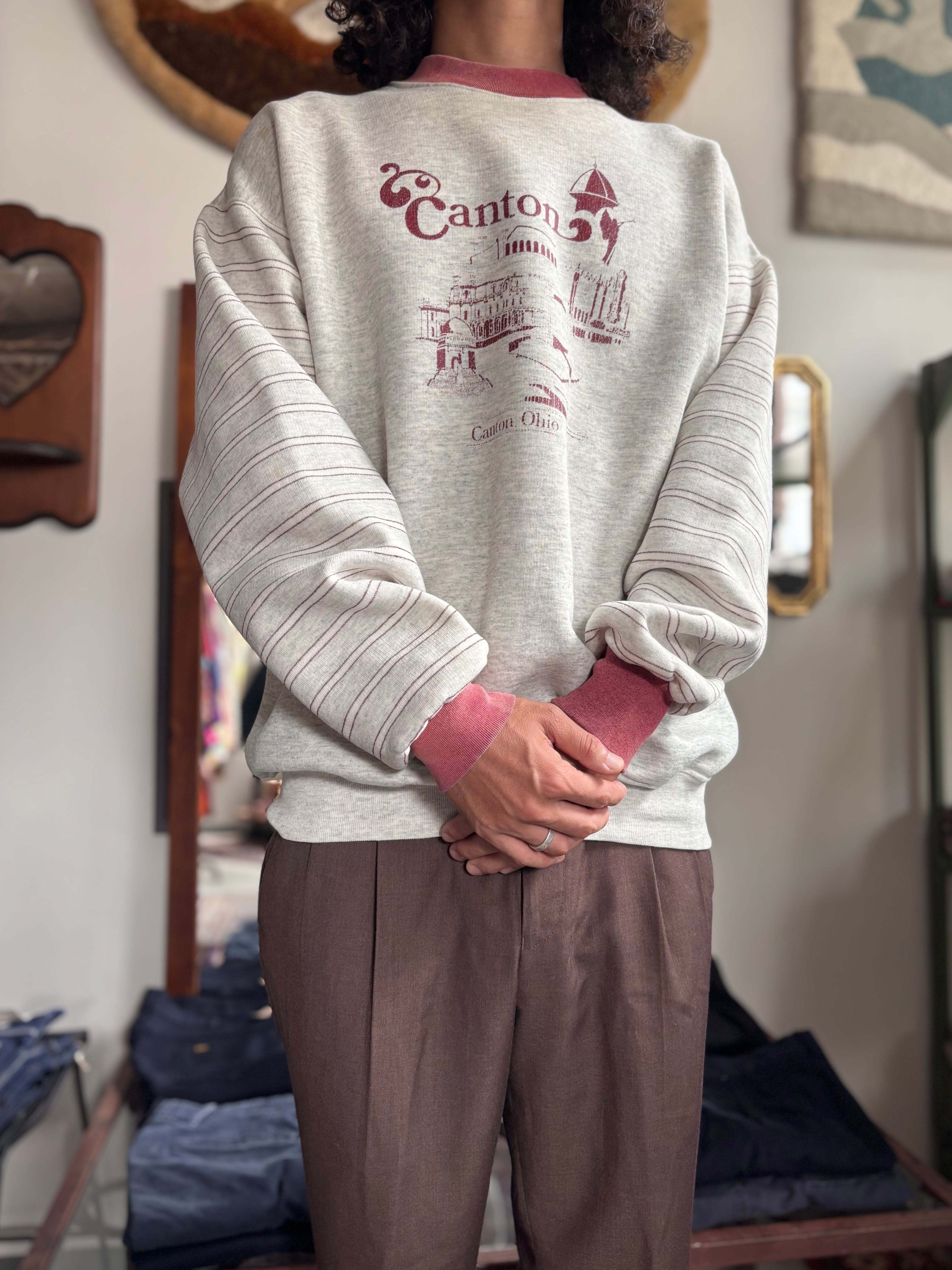 厚手のコットンポリ素材。リラックスフィット。珍しいスリーブのみボーダー切り替え。90s USA製のOLDモデル。OHIO州のスーベニアグラフィック。