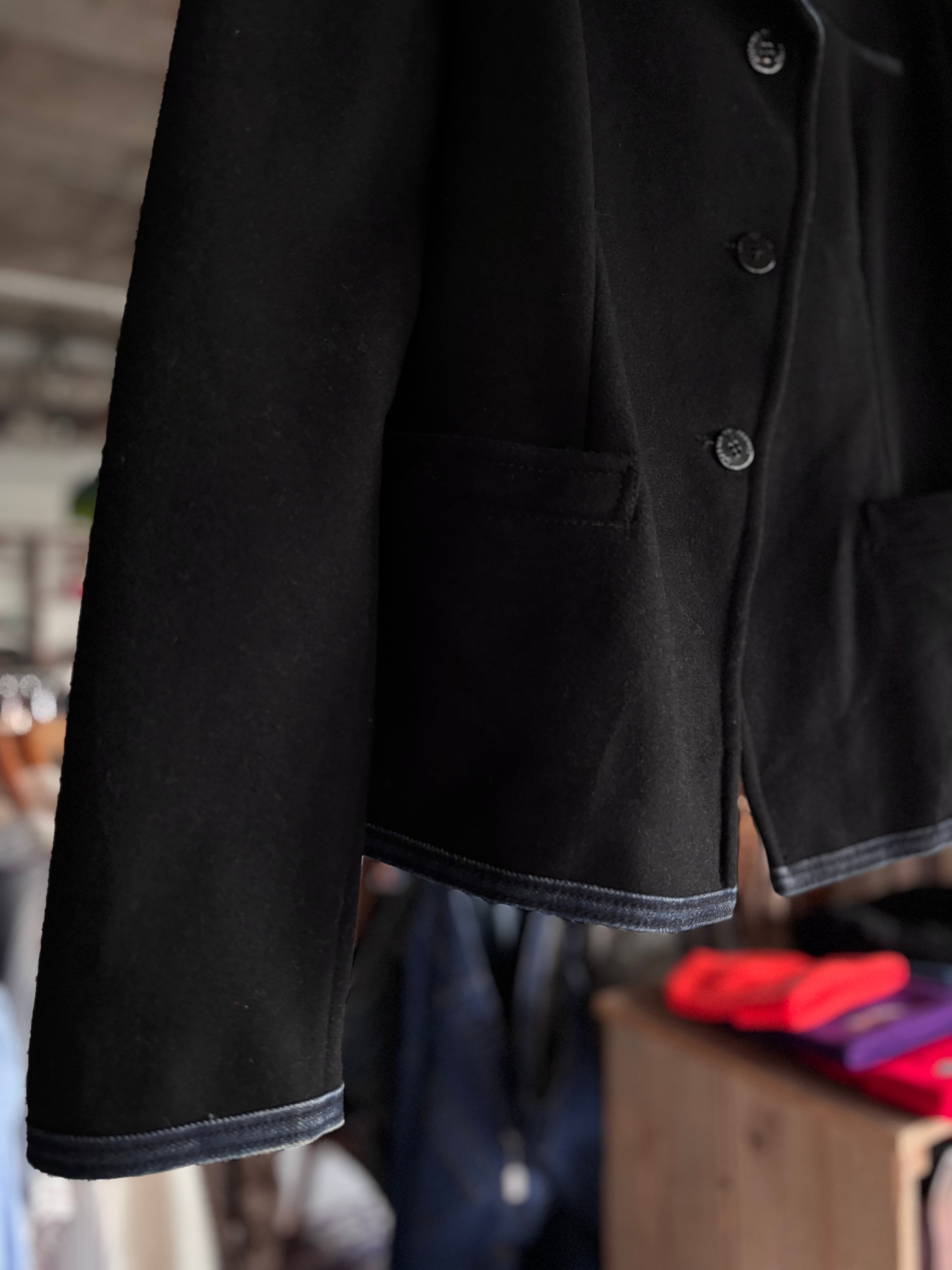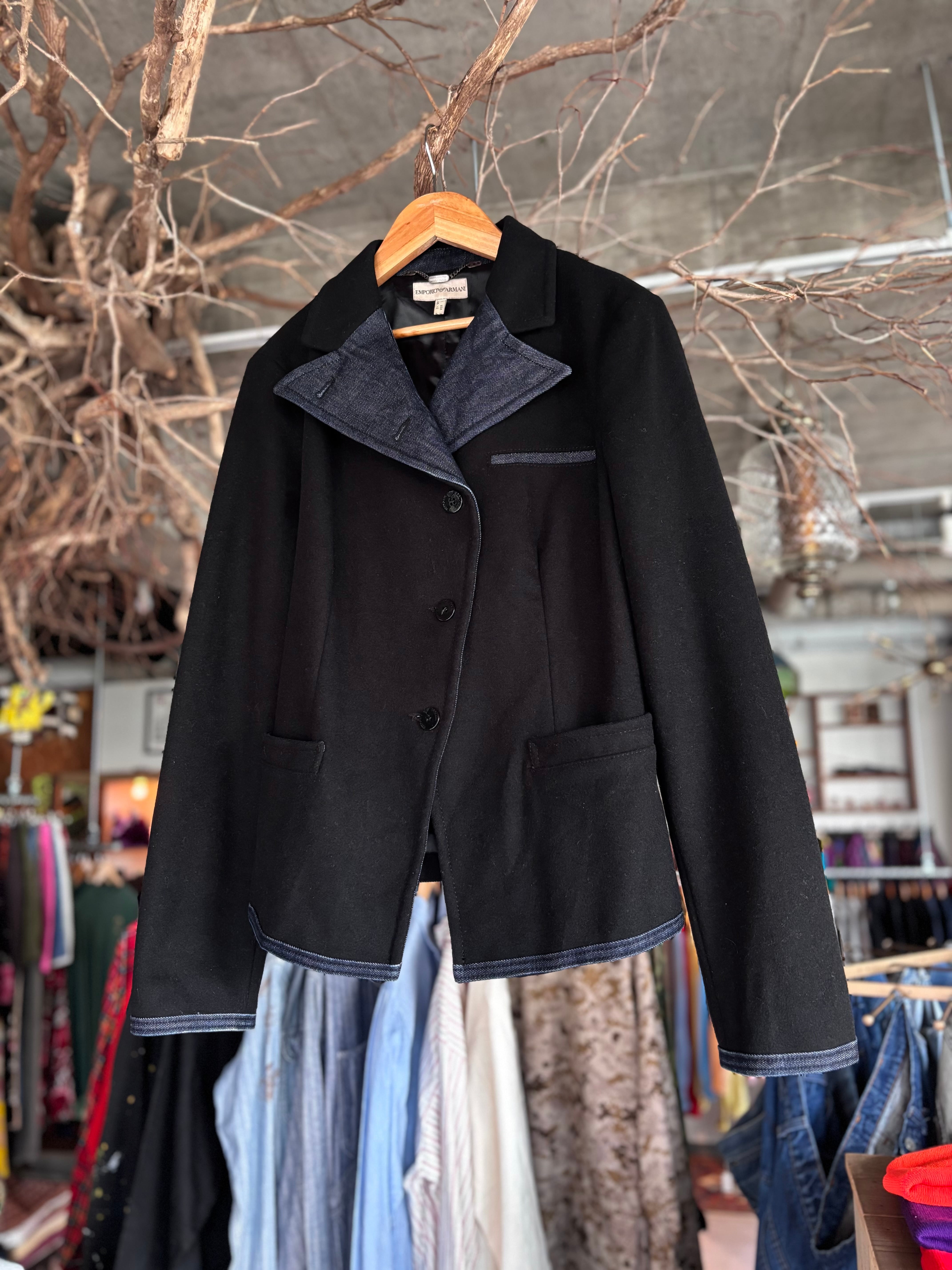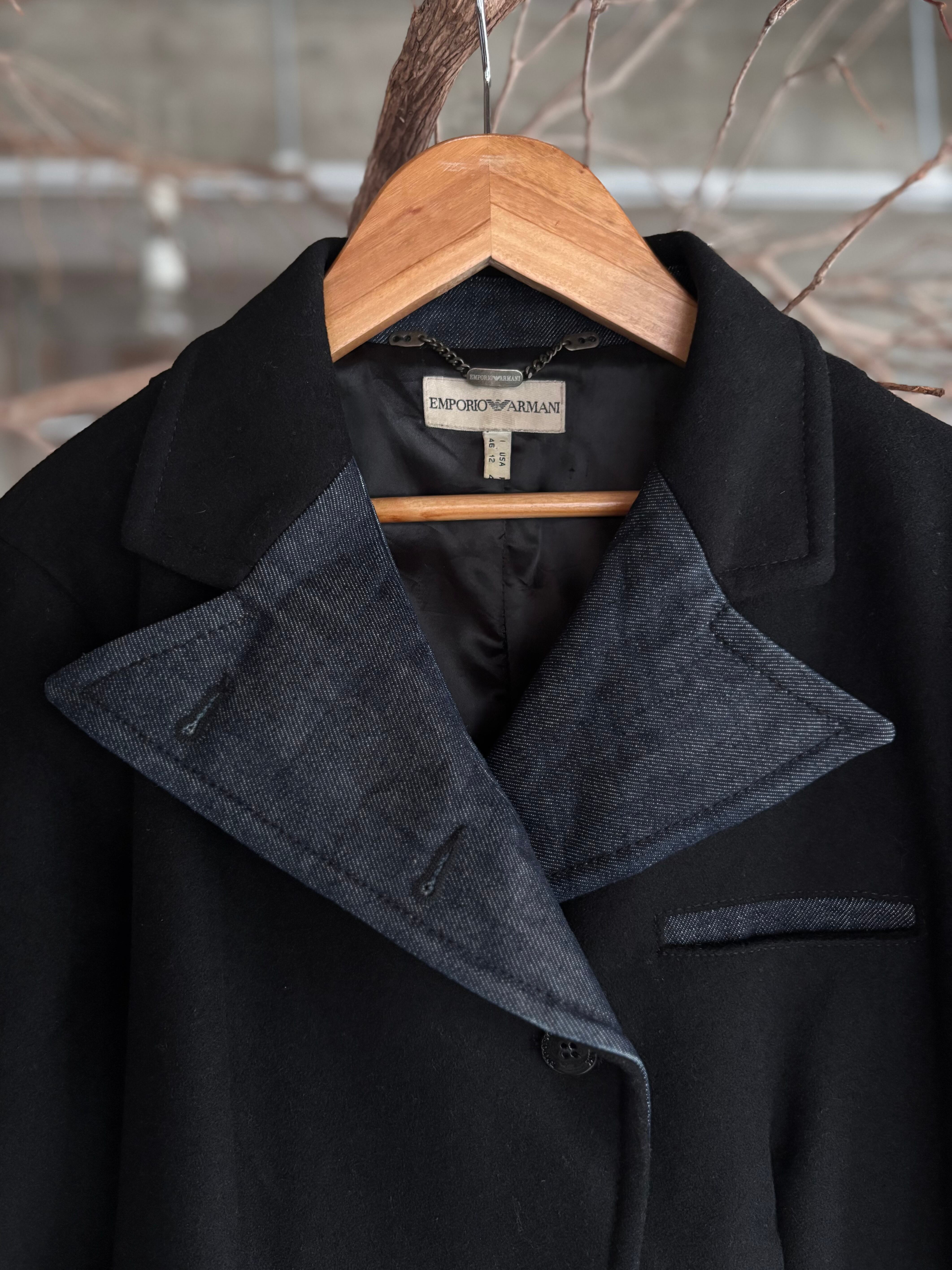 しっかりと厚みのあるウール素材。程良くゆとりのあるシルエット。アルマーニらしい洗練された印象のデザイン。ブラック基調で、襟や裾・袖口にはデニム生地の切り替えを施したユニークなデザイン。シンプルながらディティールに個性が光る1着です◎