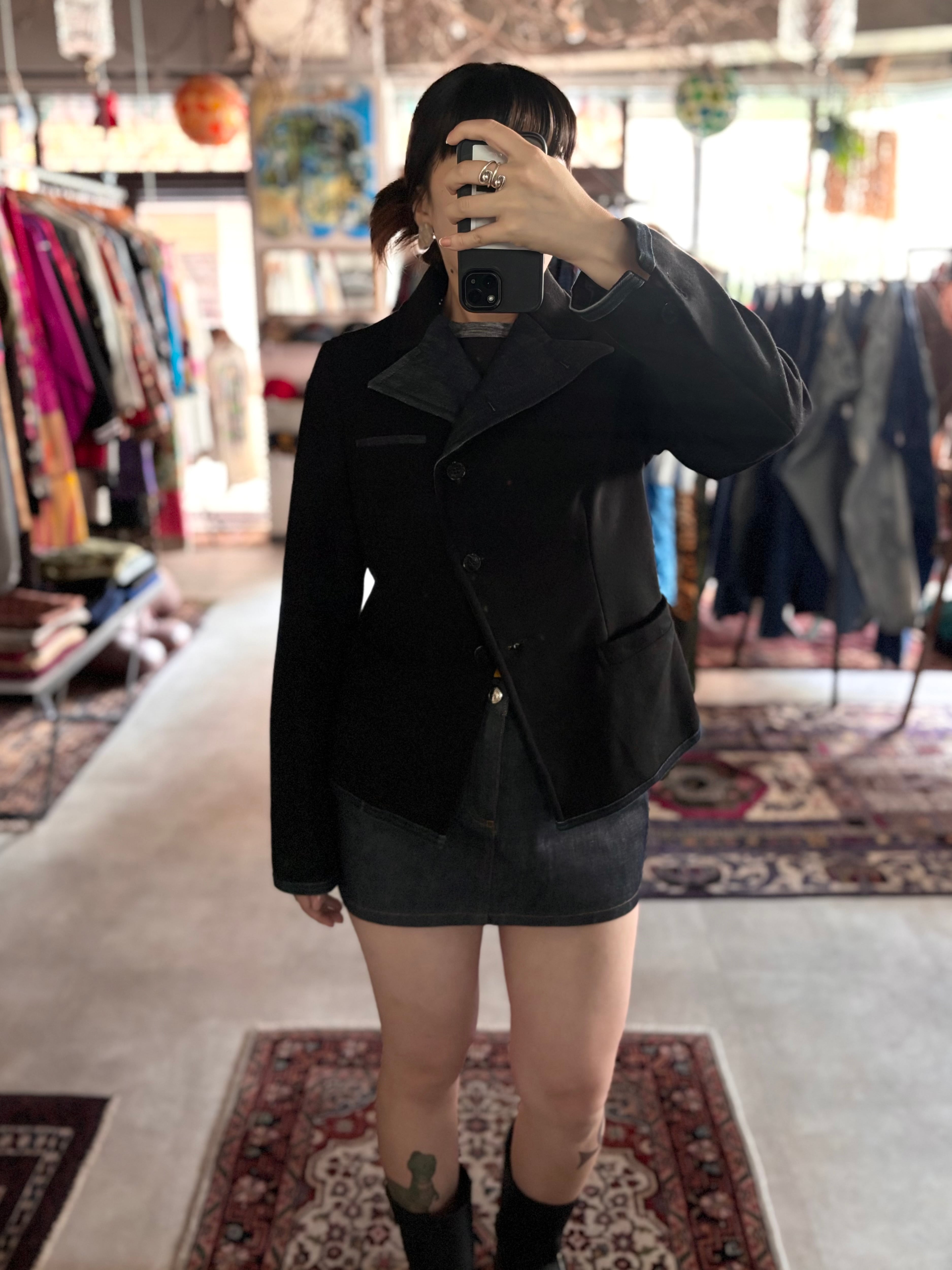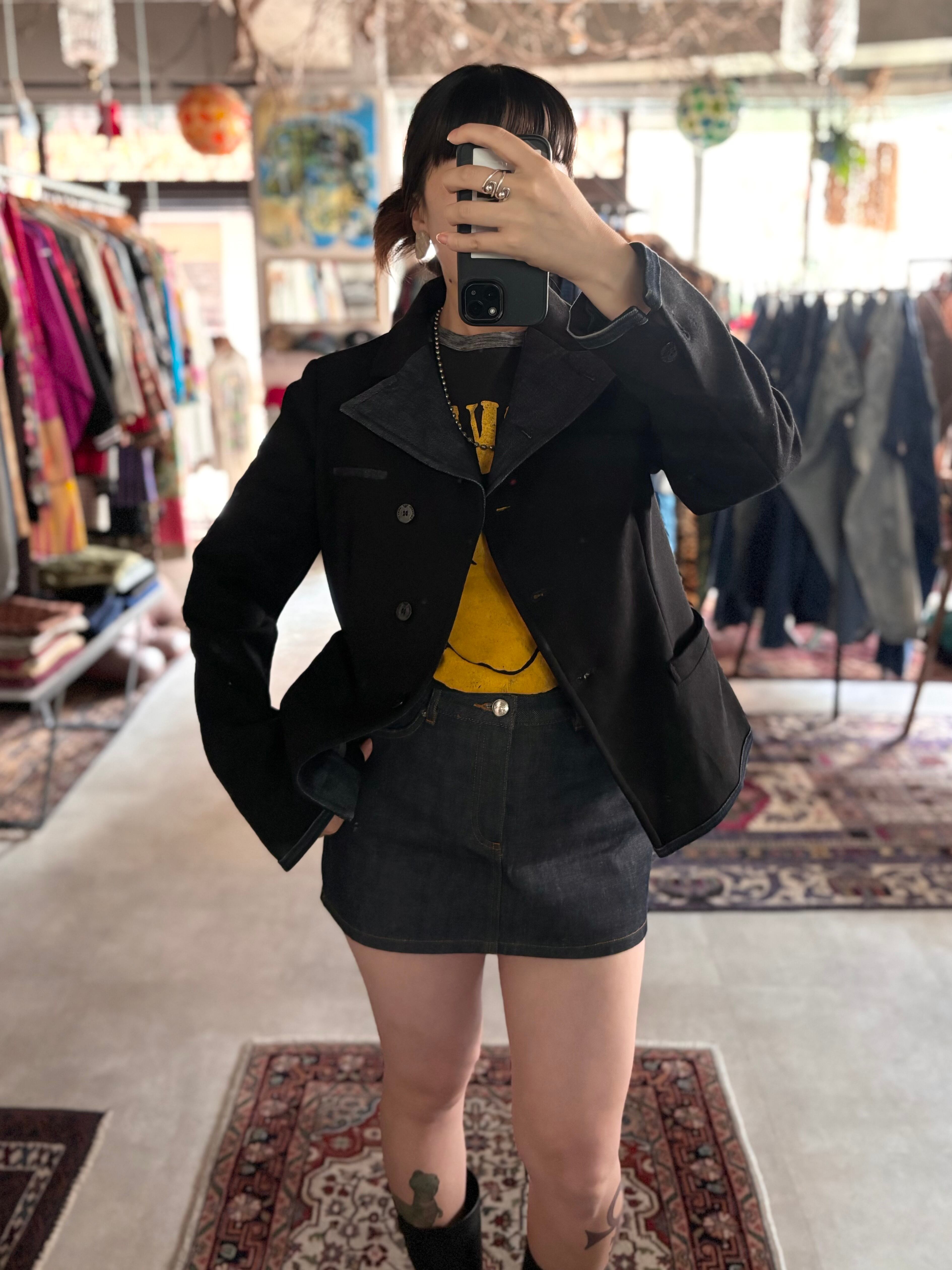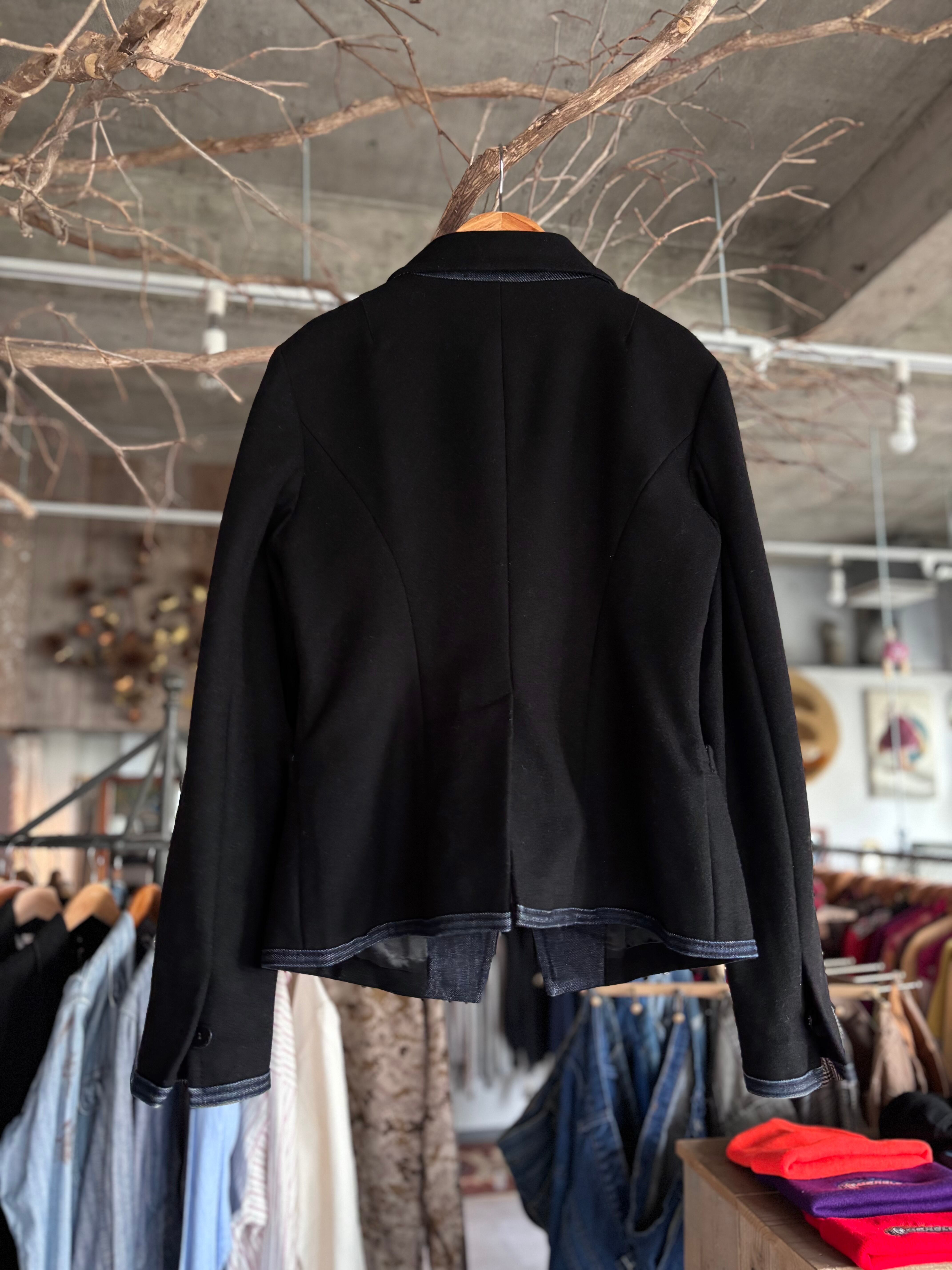 しっかりと厚みのあるウール素材。程良くゆとりのあるシルエット。アルマーニらしい洗練された印象のデザイン。ブラック基調で、襟や裾・袖口にはデニム生地の切り替えを施したユニークなデザイン。シンプルながらディティールに個性が光る1着です◎