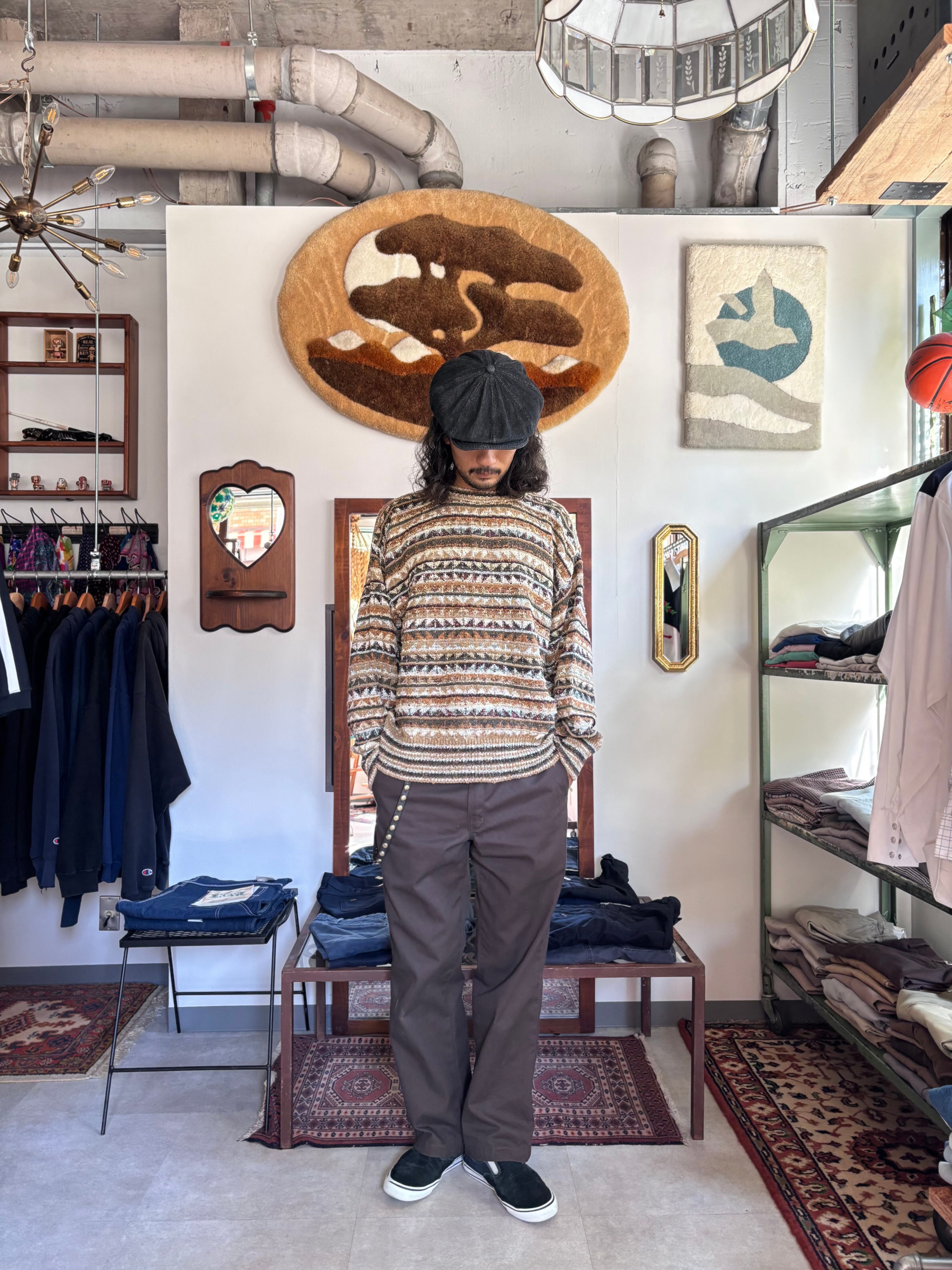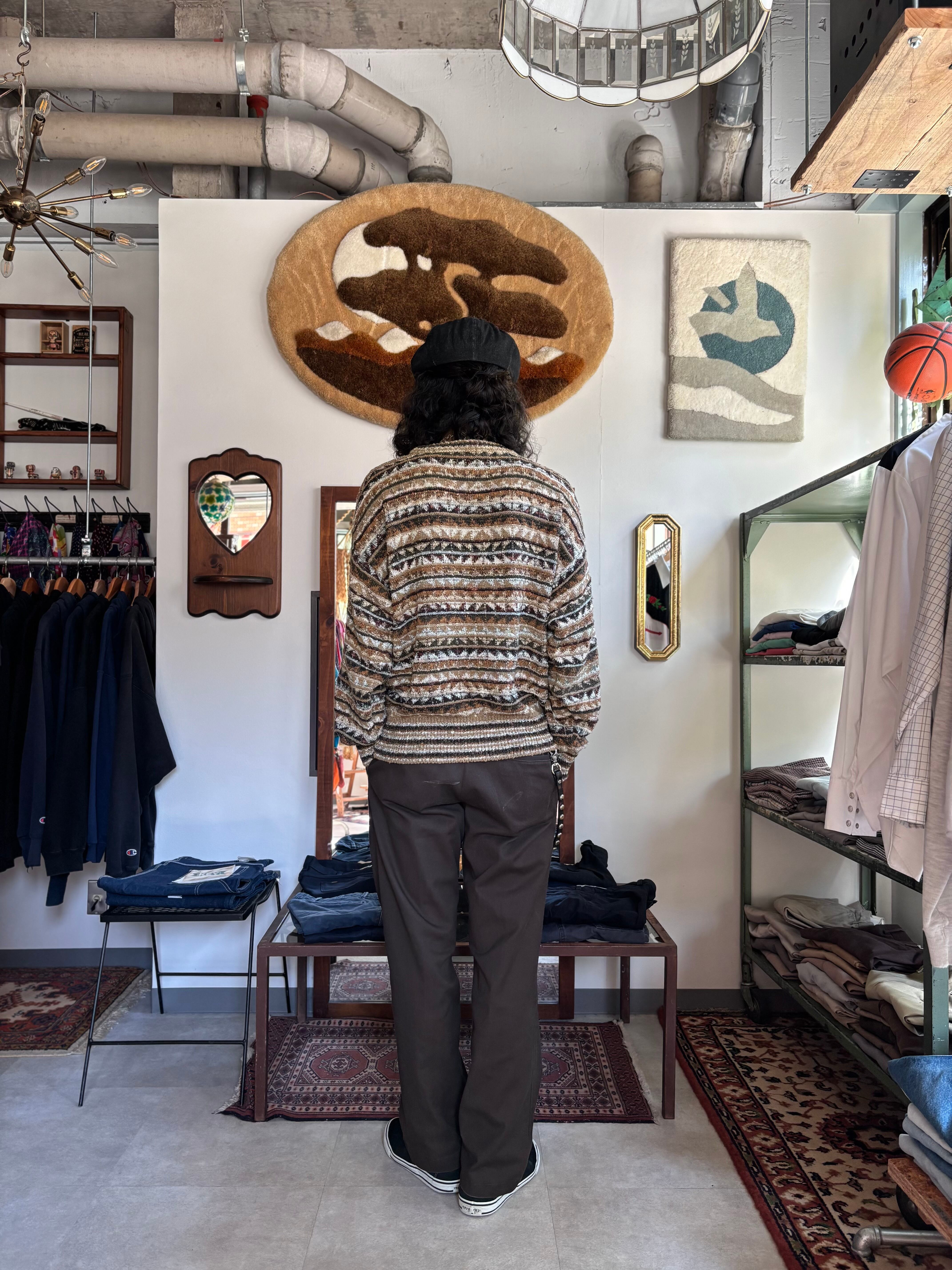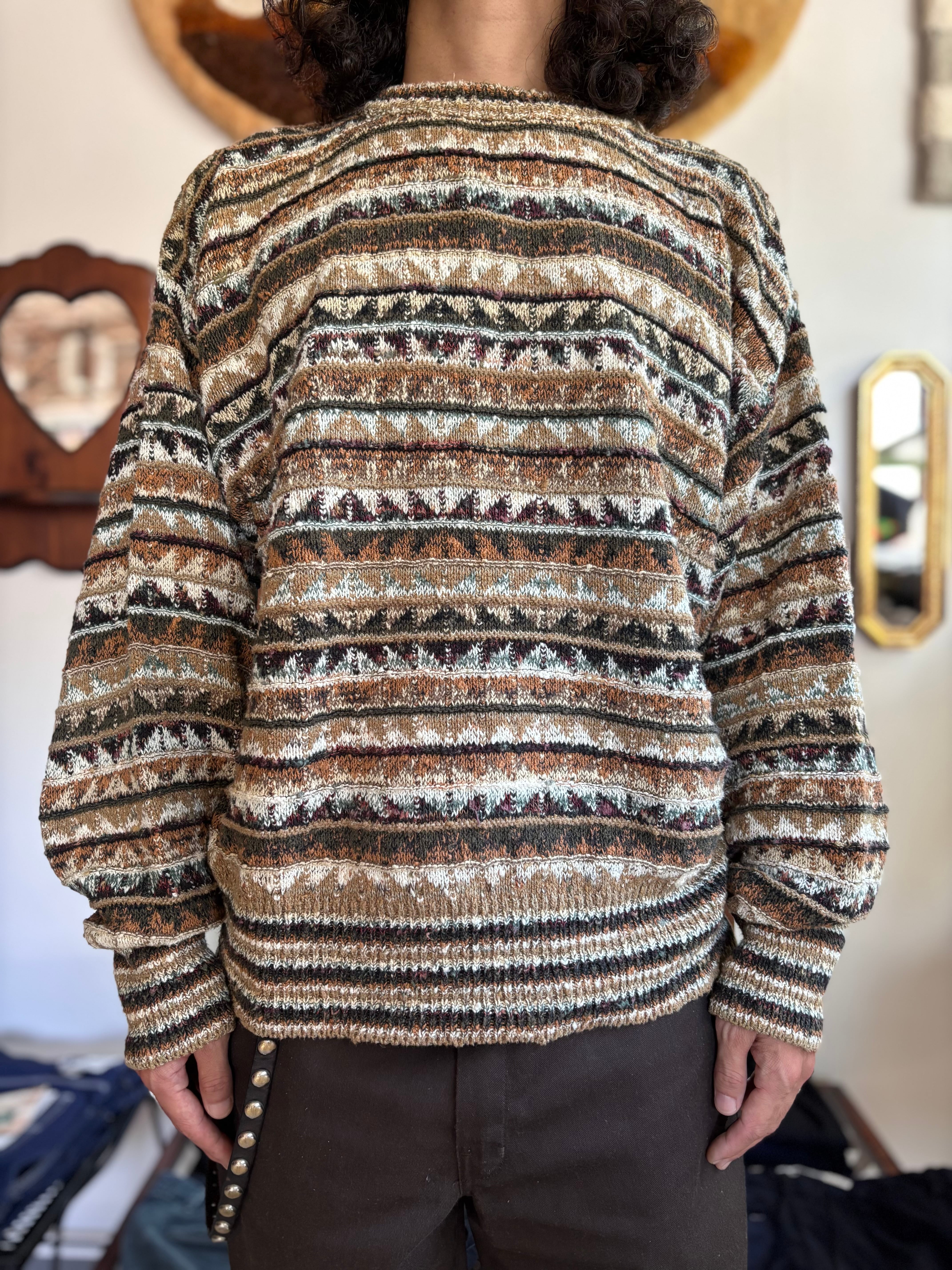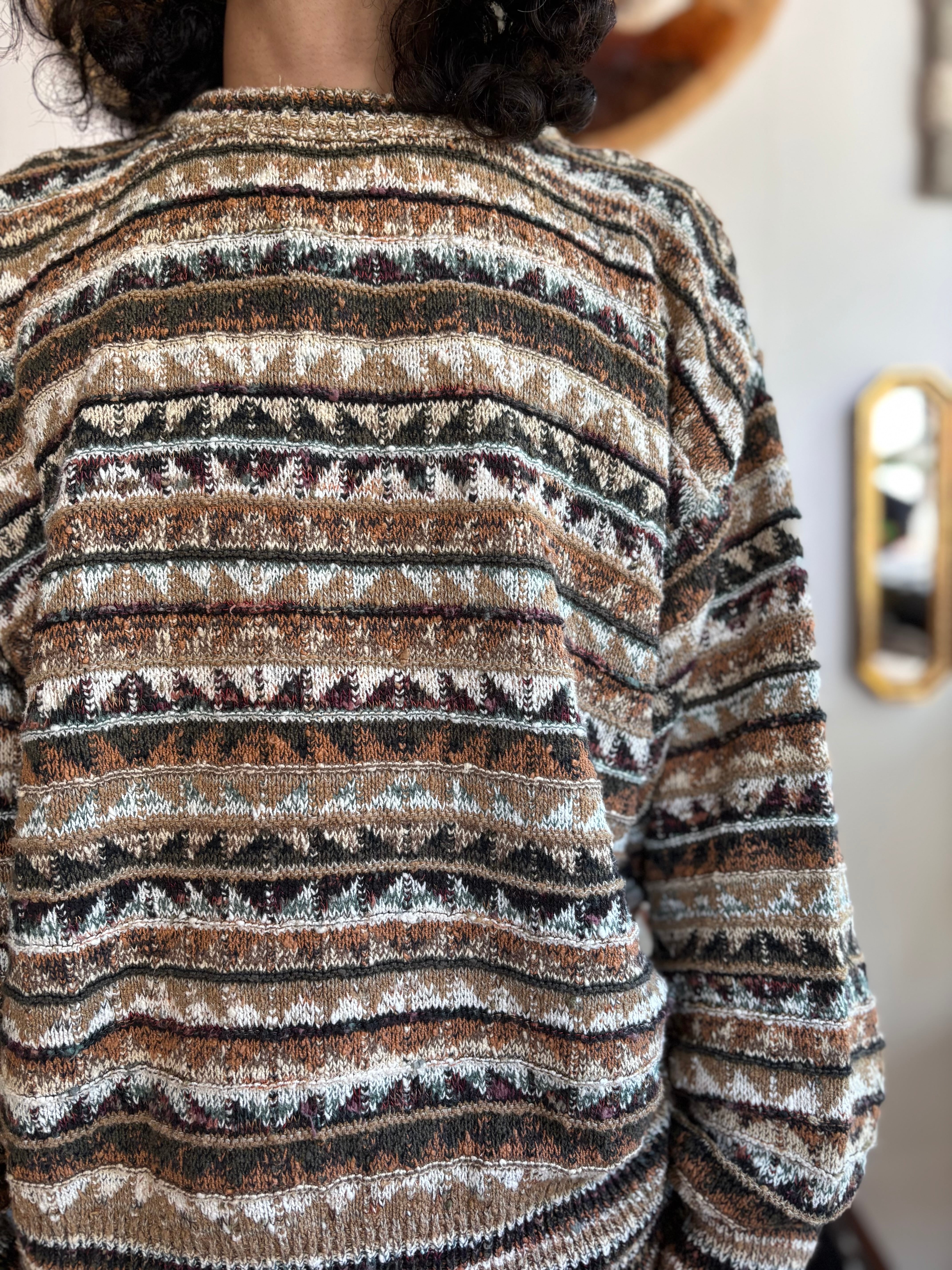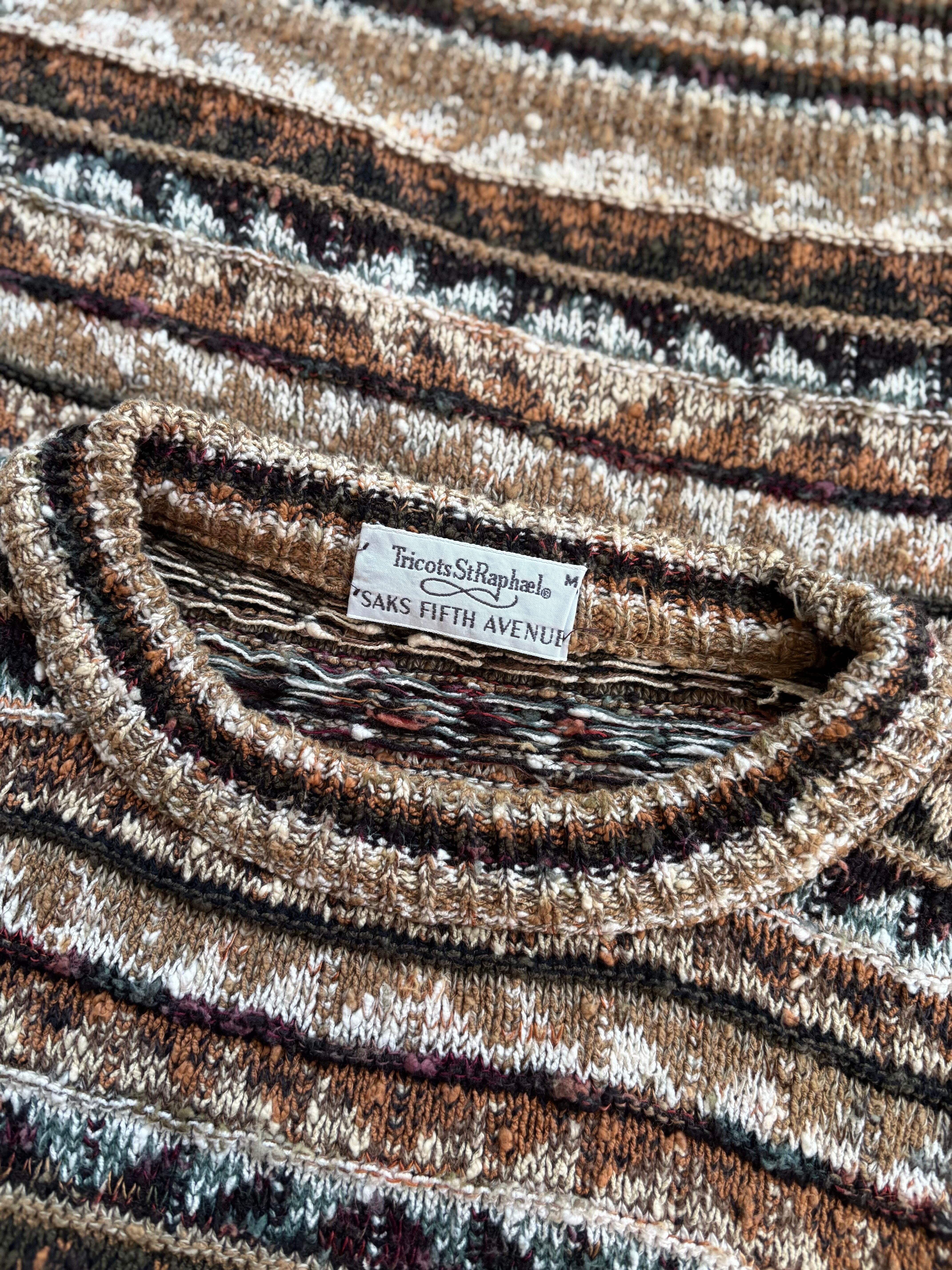 中厚のコットンニット素材。リラックスフィット。トライバル調のパターンに、リブはボーダー切り替え。百貨店 SAKS FIFTH AVENUE製。 90s USAのOLDモデル。