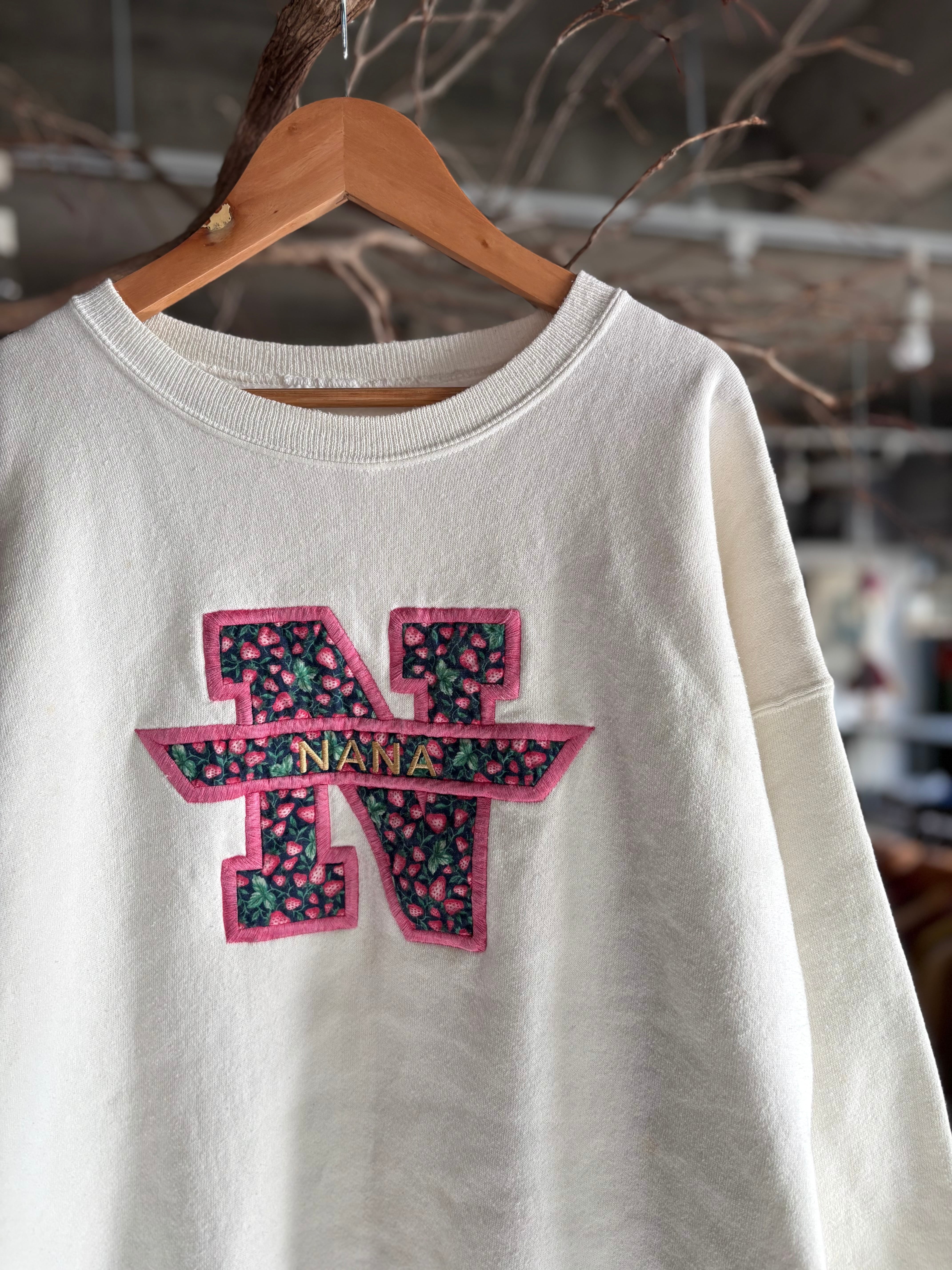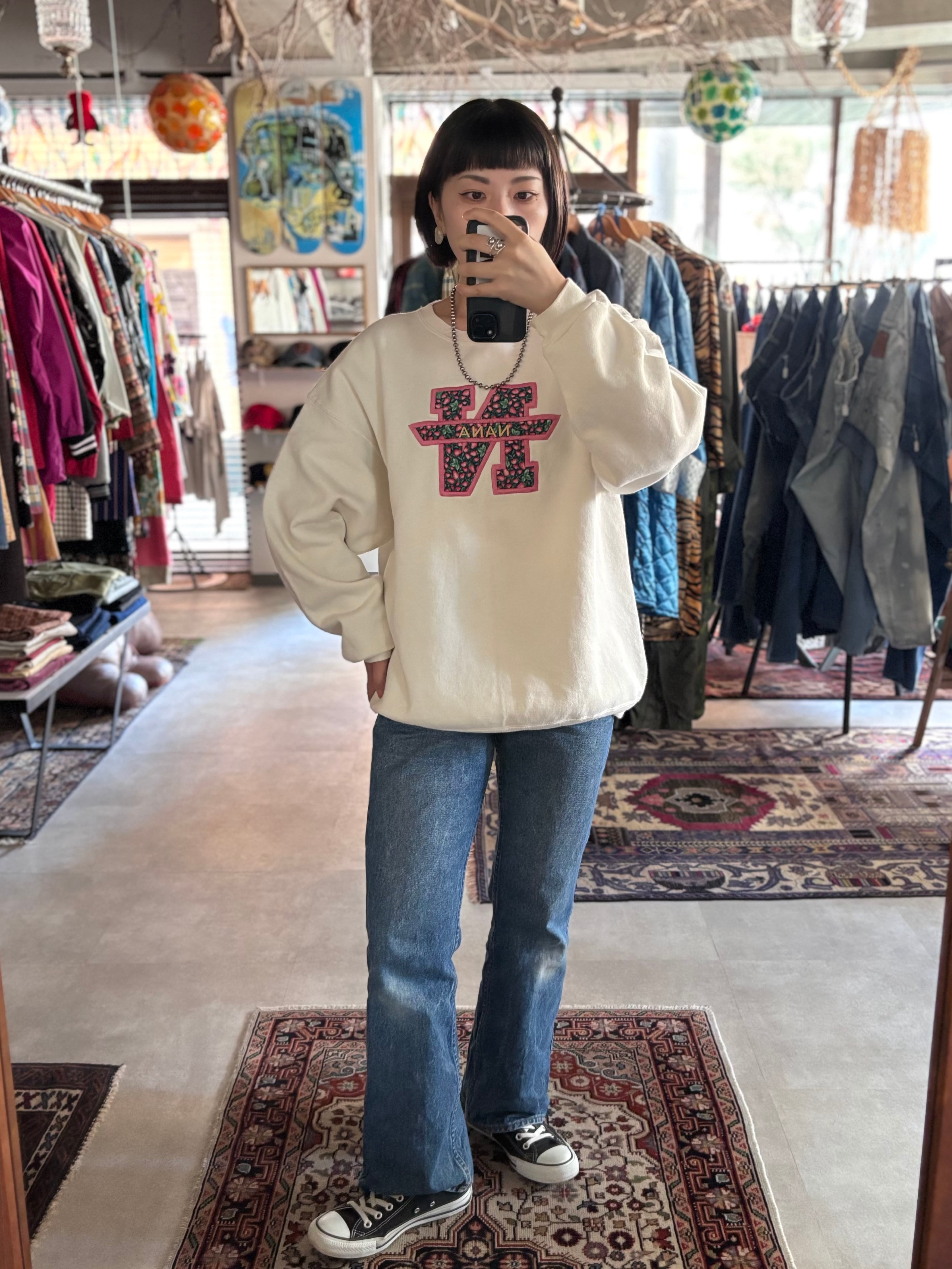 しっかりとした厚みのスウェット。ピンク基調で目を引く華やかなデザイン。デニムやスラックス、ロングスカートと合わせたデイリーコーデにおすすめです◎