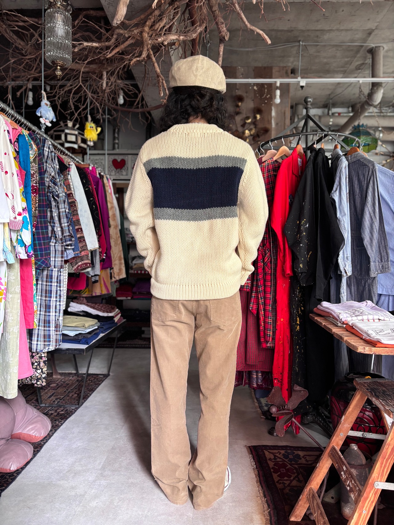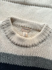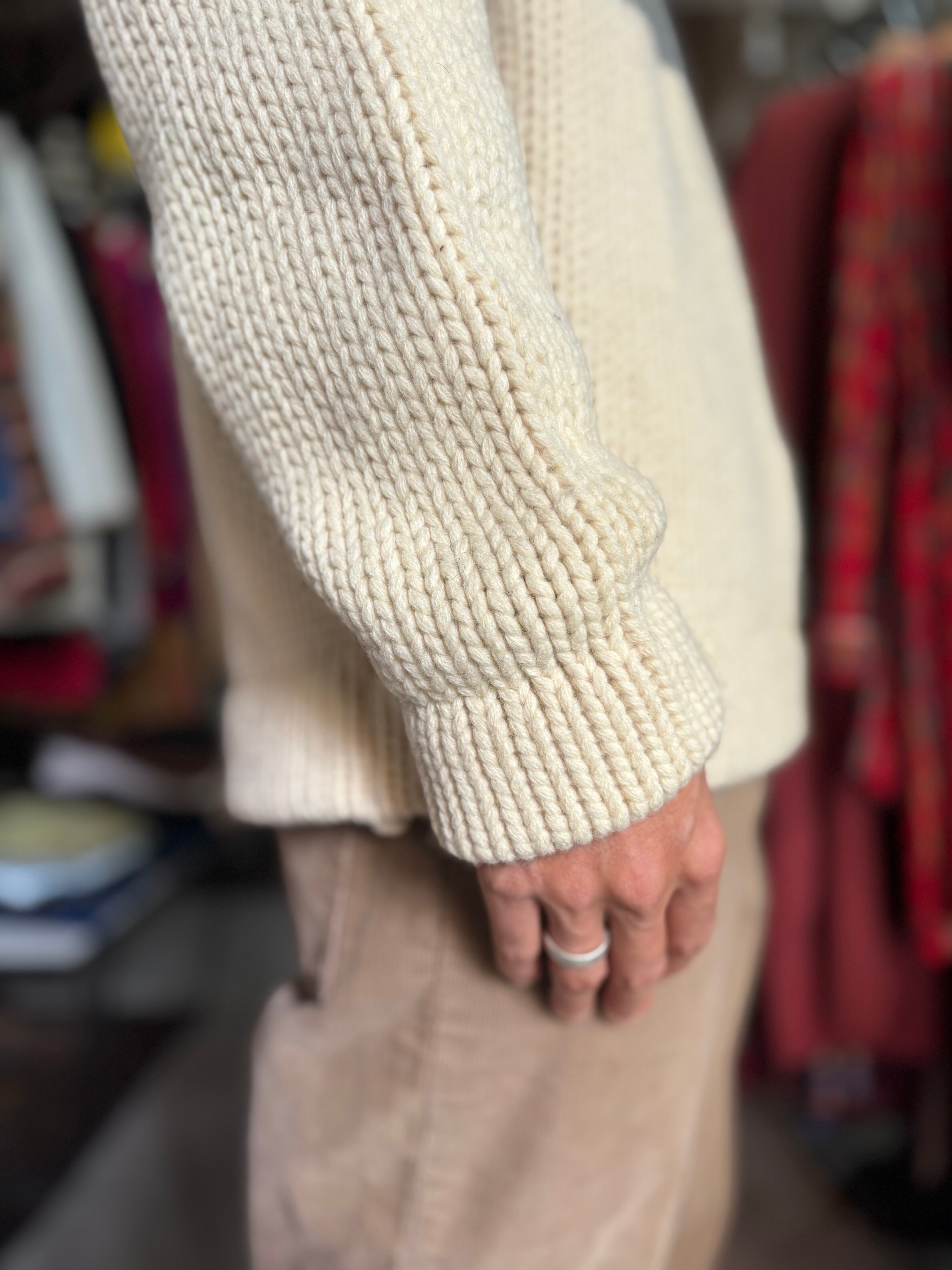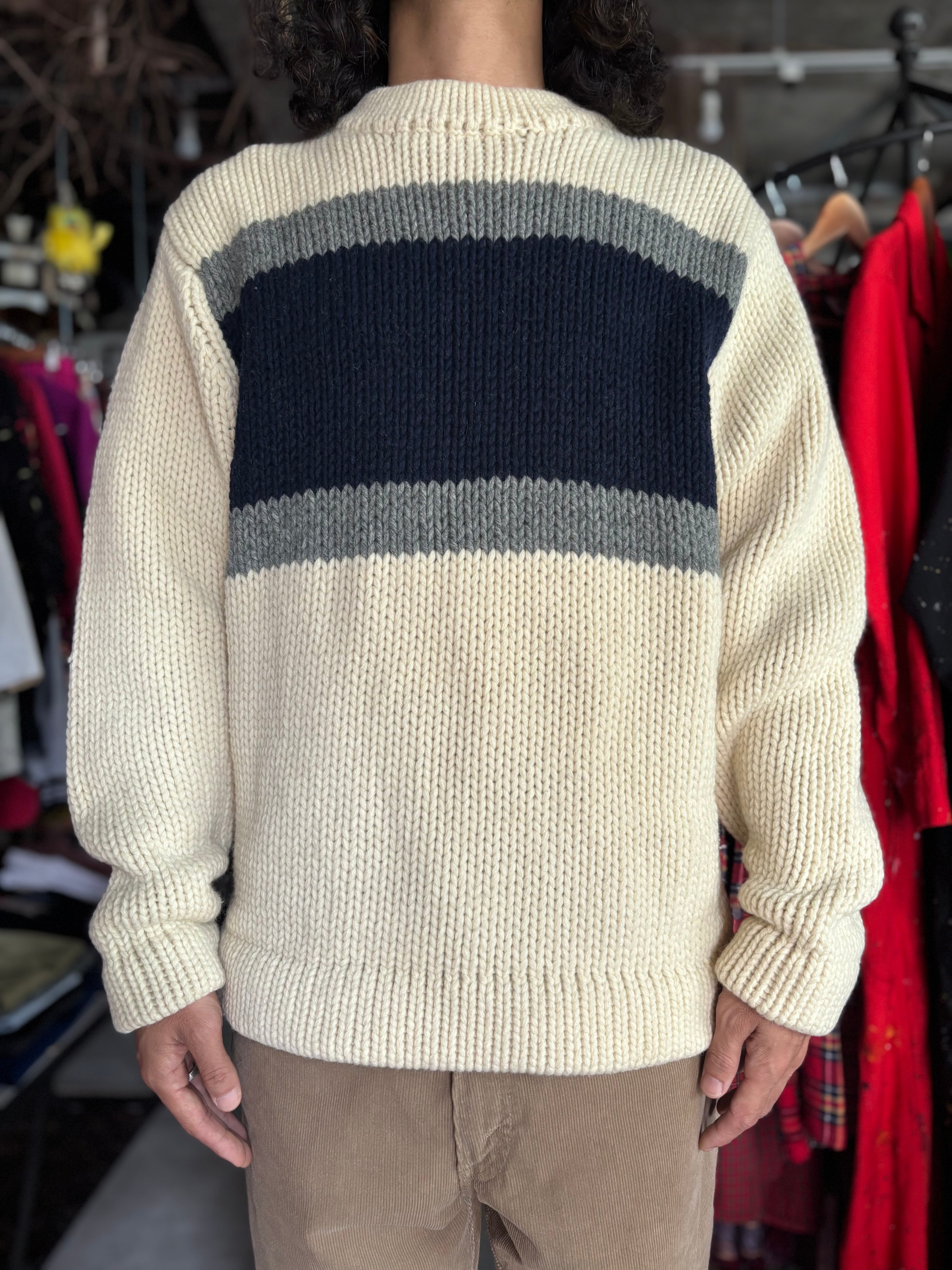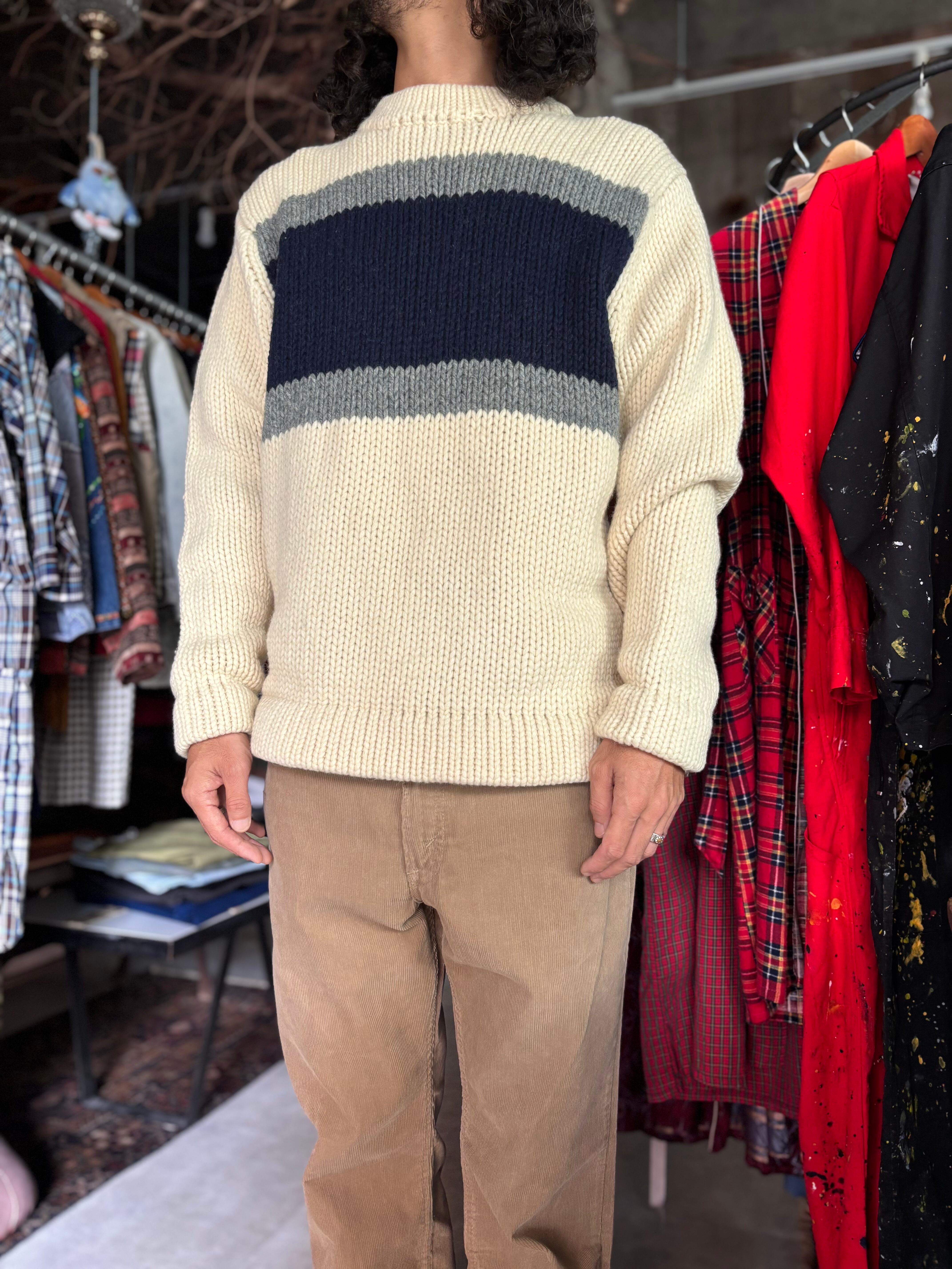 厚手のローゲージニット。柔らかく肌触りの良いラムウール生地。リラックスフィット。オフホワイトベースに、前後に切り返しが入るシンプルなデザイン。厚みのあるリブが可愛いです。