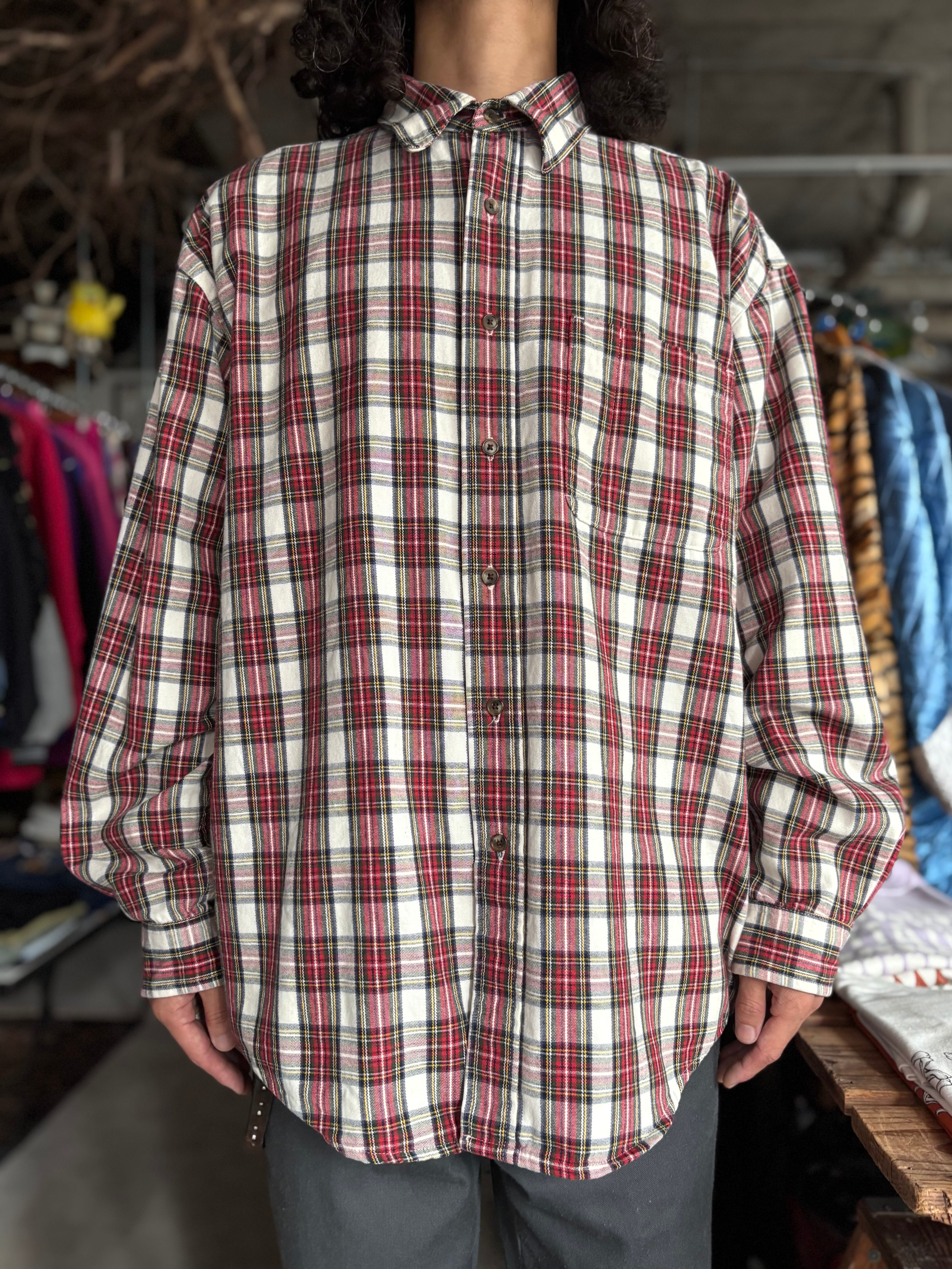 厚手のコットン素材。身幅たっぷりのルーズフィット。UKテイストのトラディショナルパターン。00s 白タグのOLDエディバウアー製。