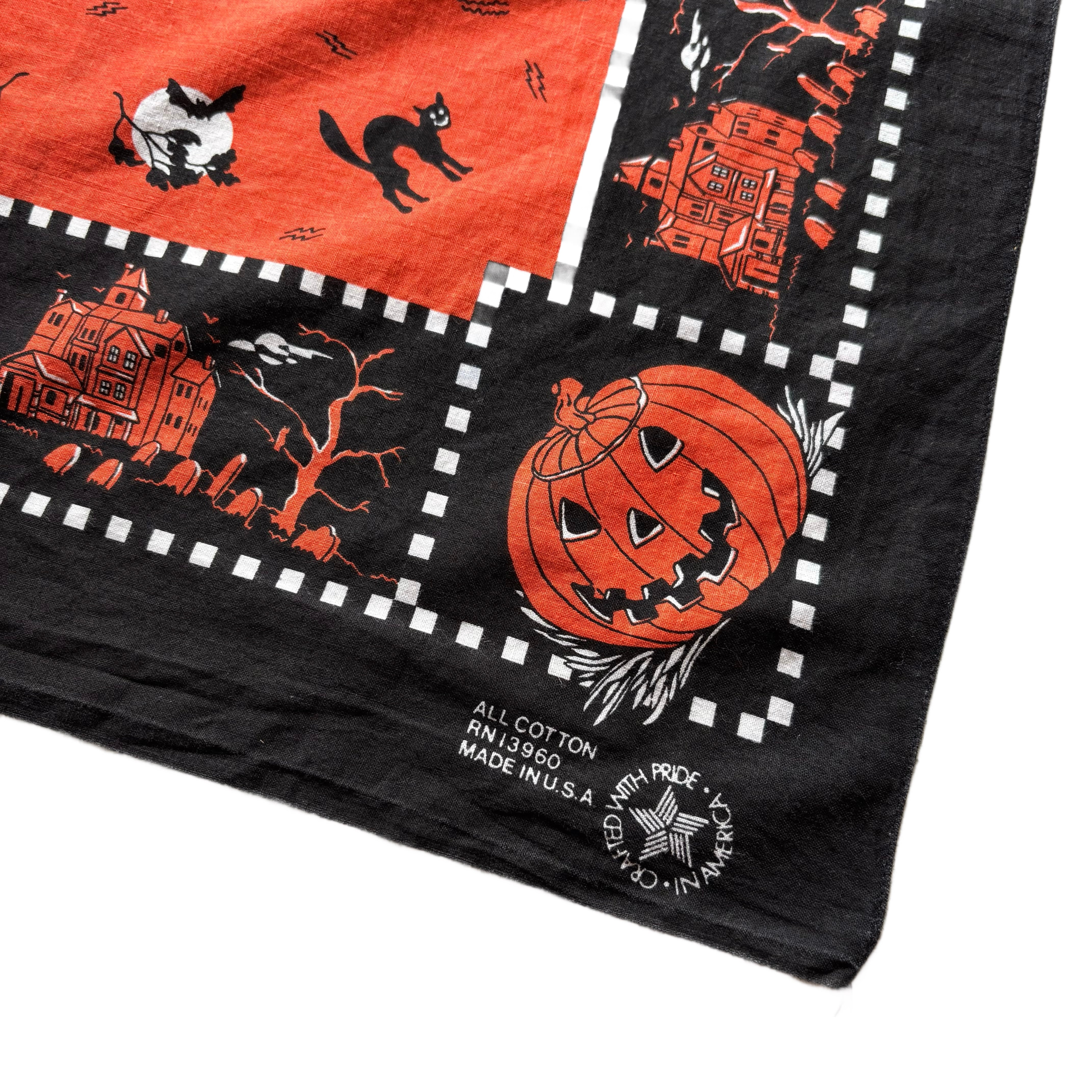 オレンジ×ブラックのコントラストが印象的なハロフィンモチーフバンダナ。しっかりとしたコットン生地で、アメリカらしい遊び心が詰まったデザイン。頭やバッグ、ボトムスのベルトループに巻くなどコーデのアクセントに◎