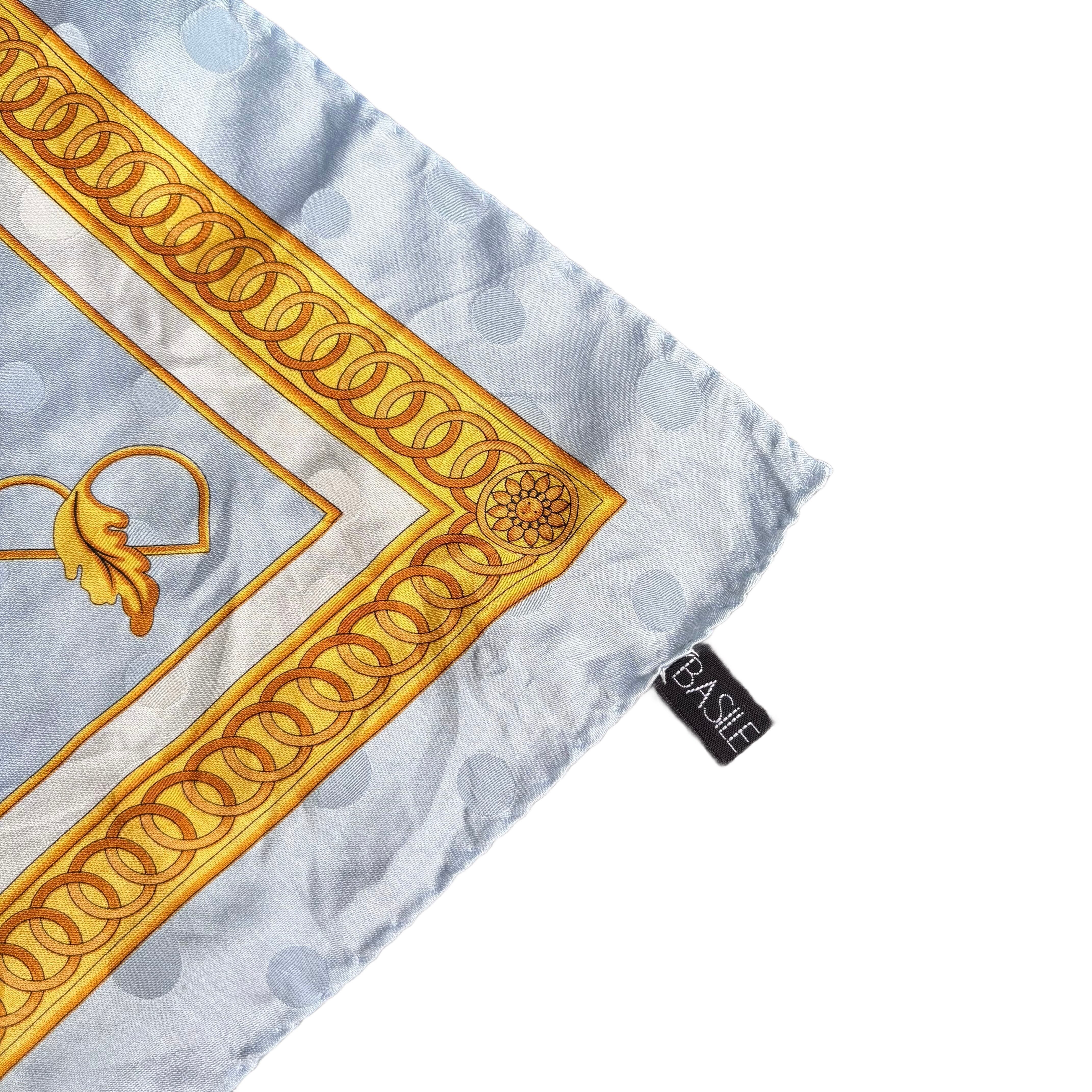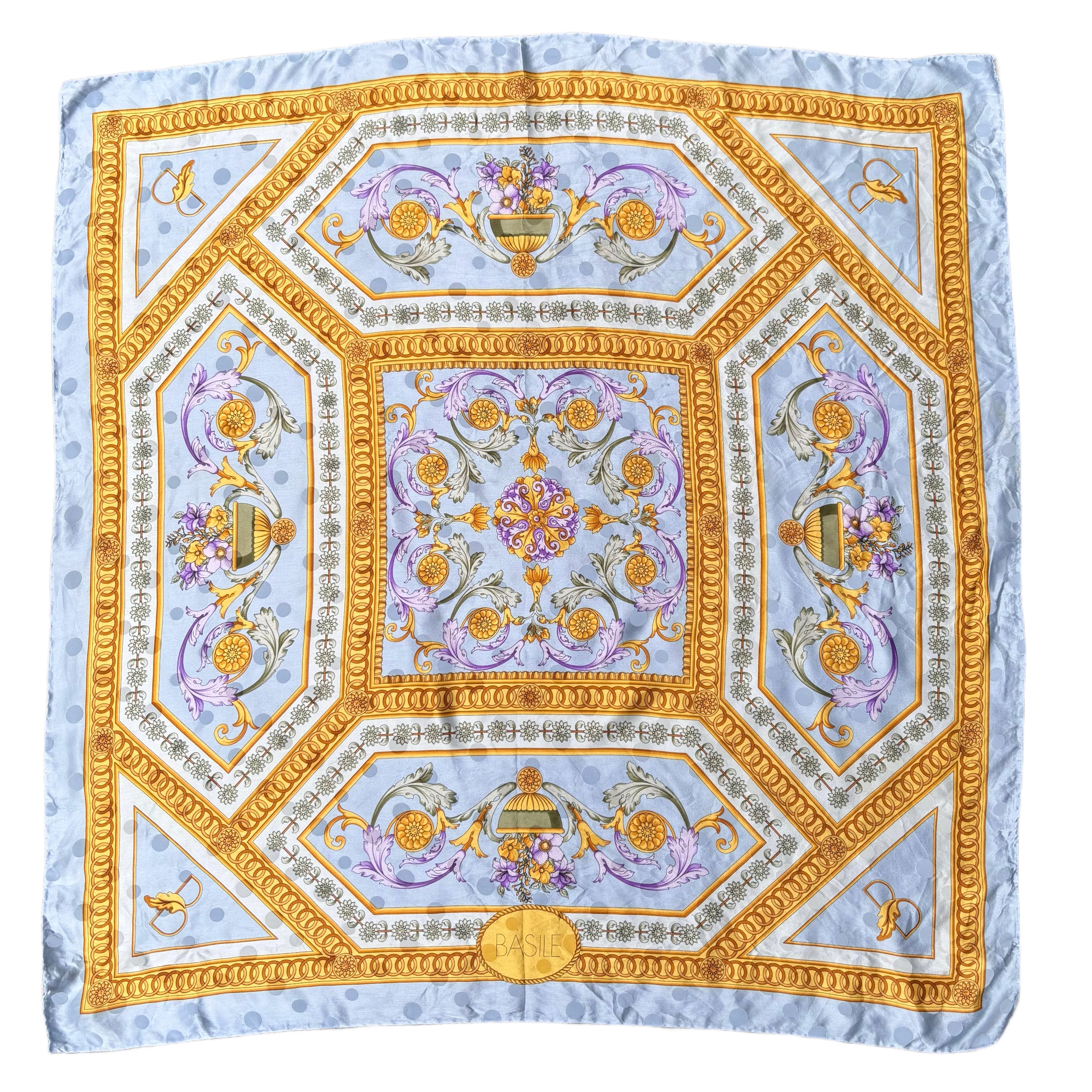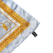 シルク素材の大判スカーフ。淡いブルーベースにゴールドやパープルが映える素敵なカラーリング。クラシカルかつエレガンスなデザイン。首もとやバッグに巻くなどちょうどいいアクセントに◎