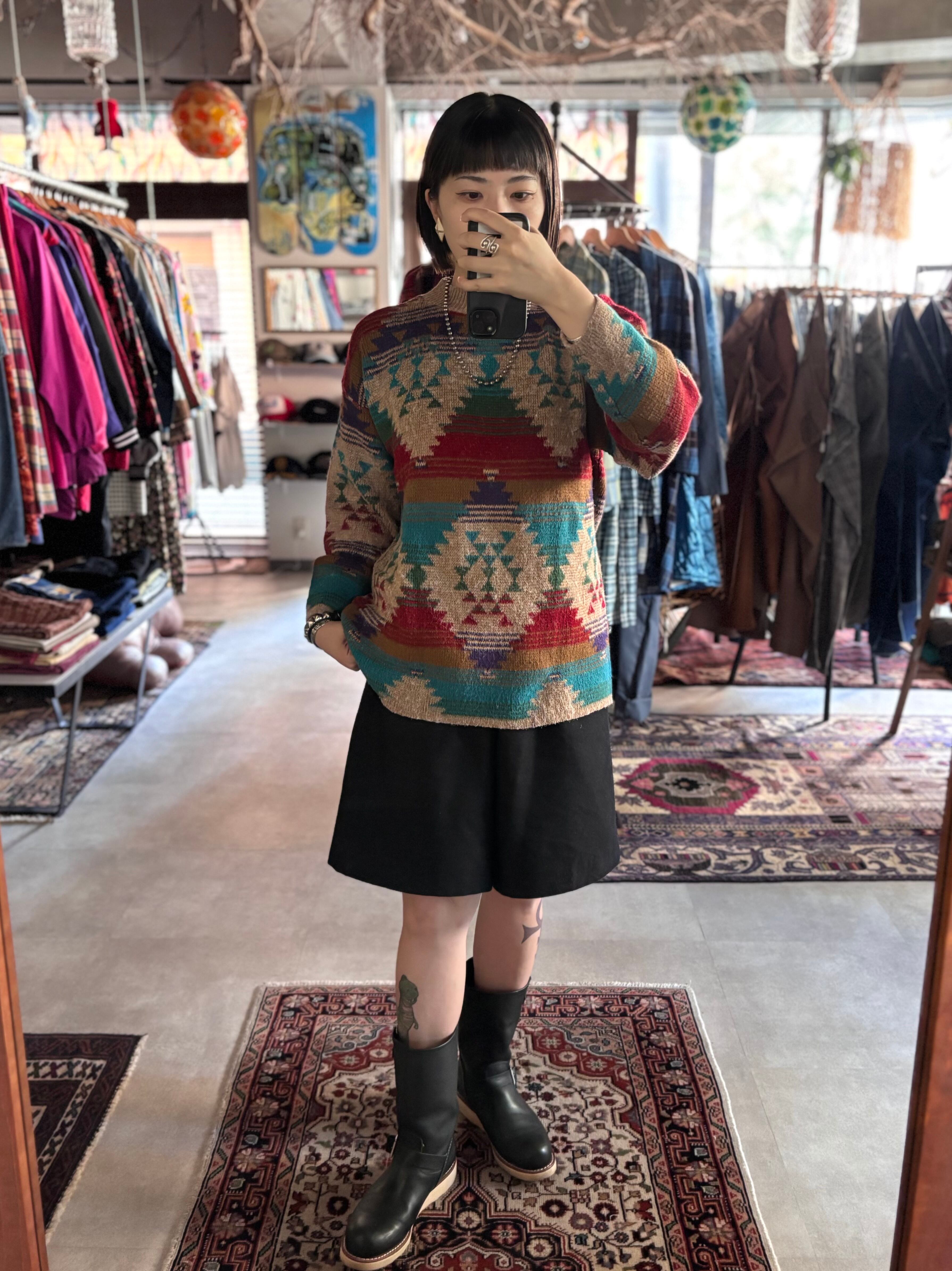 アクリル×ナイロン混紡素材。リラックスシルエット。目を引く発色のネイティブデザイン。インナーにも映えるおすすめニットです◎