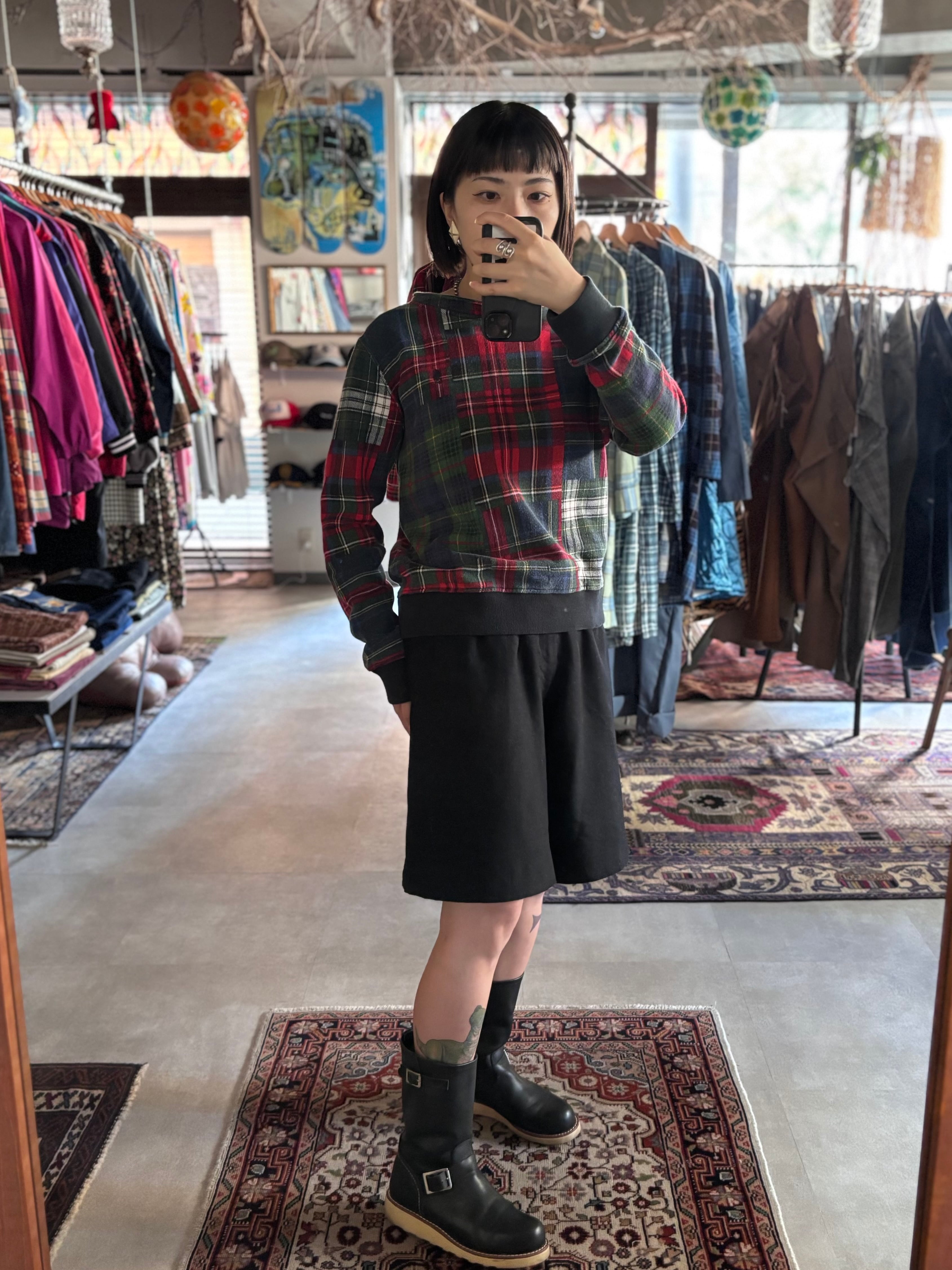 しっかりとしたコットン×ポリエステル素材。程よくゆとりのある身幅にコンパクトな着丈。カットソーとスウェットの中間のような軽めの着心地。リブ仕様、ボートネックのようにやや横に広がったネックラインなどGOODディティール。パッチワークデザインも可愛いです。