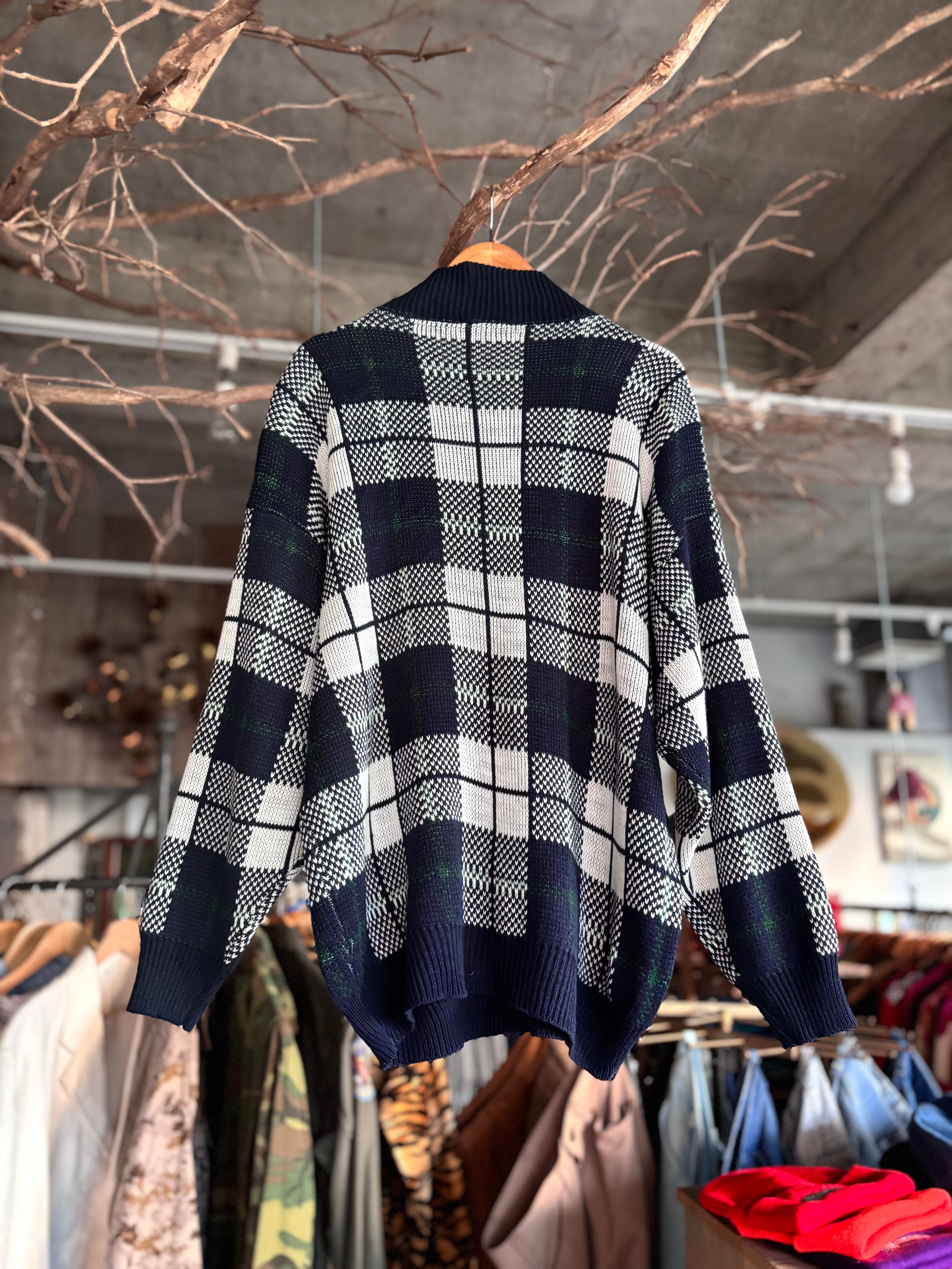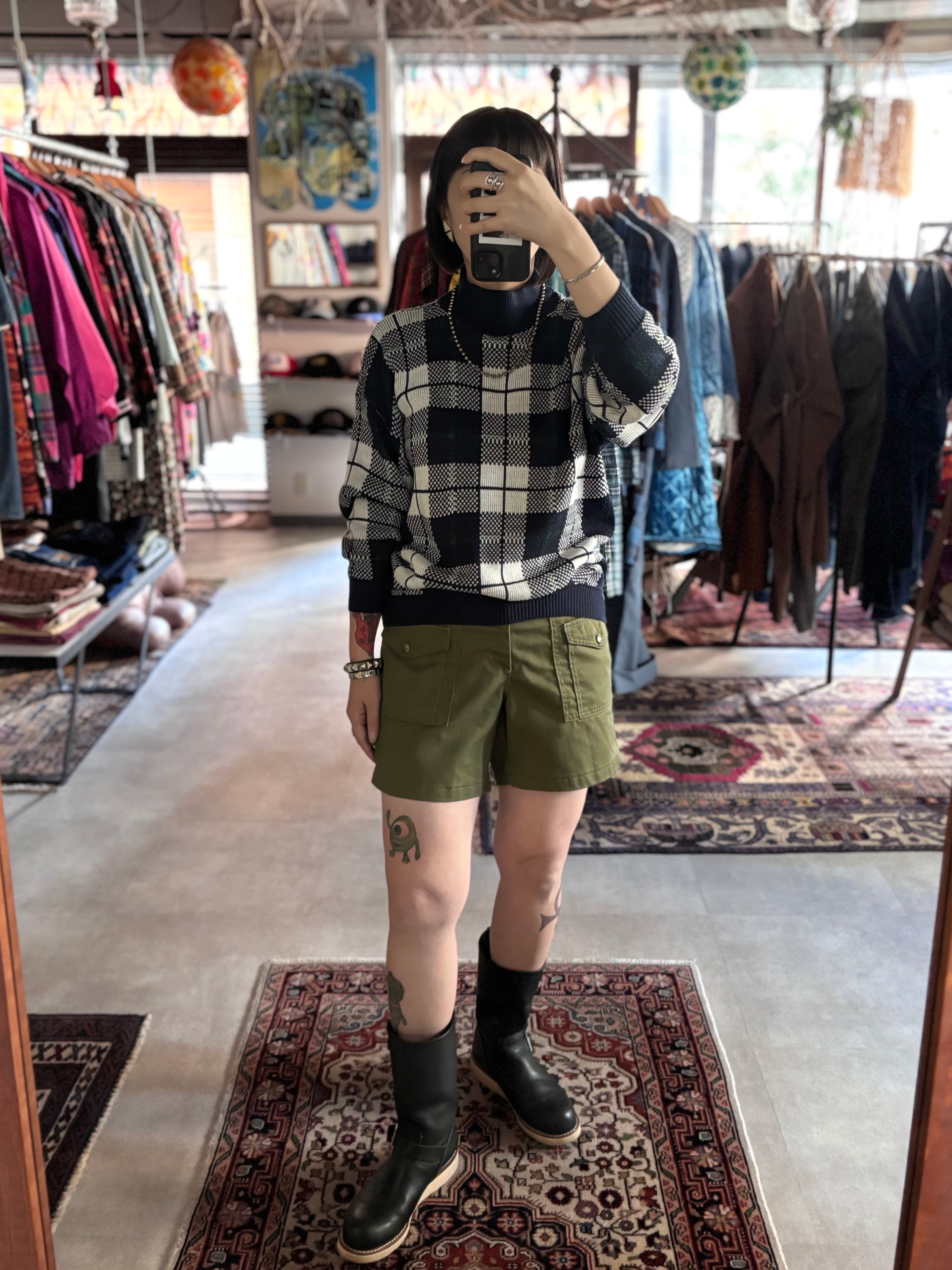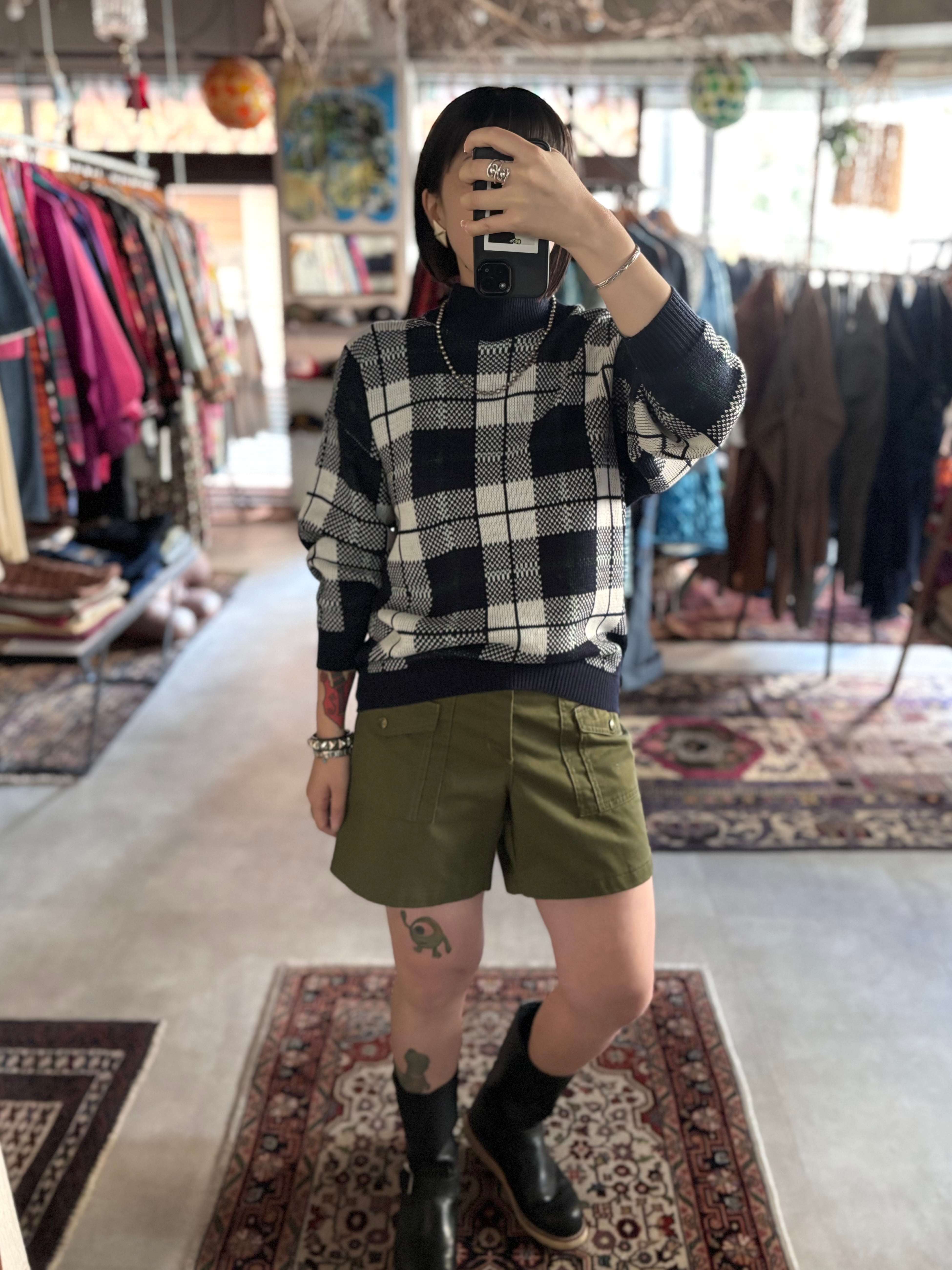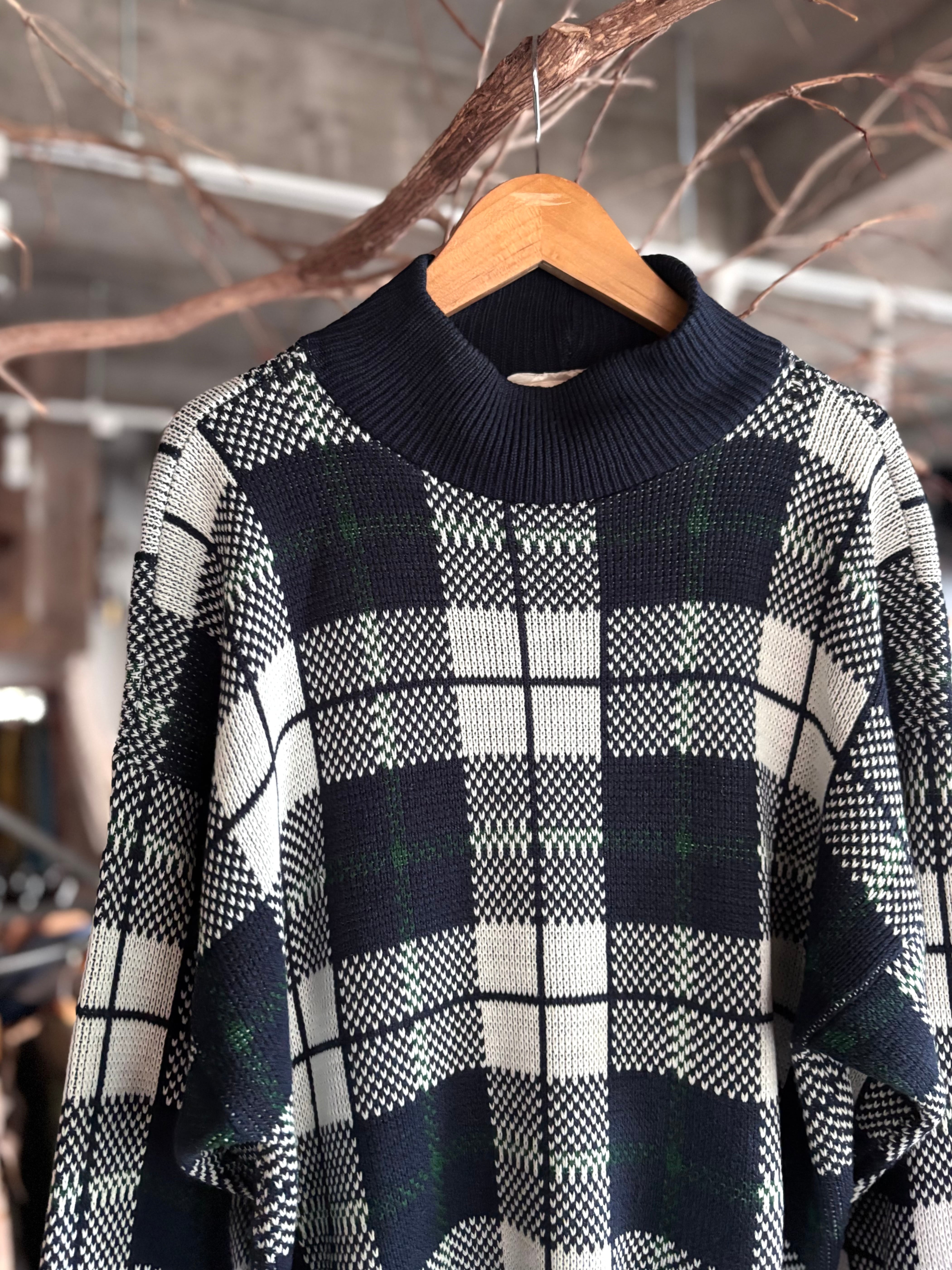 カナダ製のアクリルニット。軽い着心地で、程よくゆとりのあるシルエット。ネイビーベースの大柄チェック。モックネック仕様+コンパクトな袖丈でレディライクな印象。インナーにも映えるおすすめニットです◎