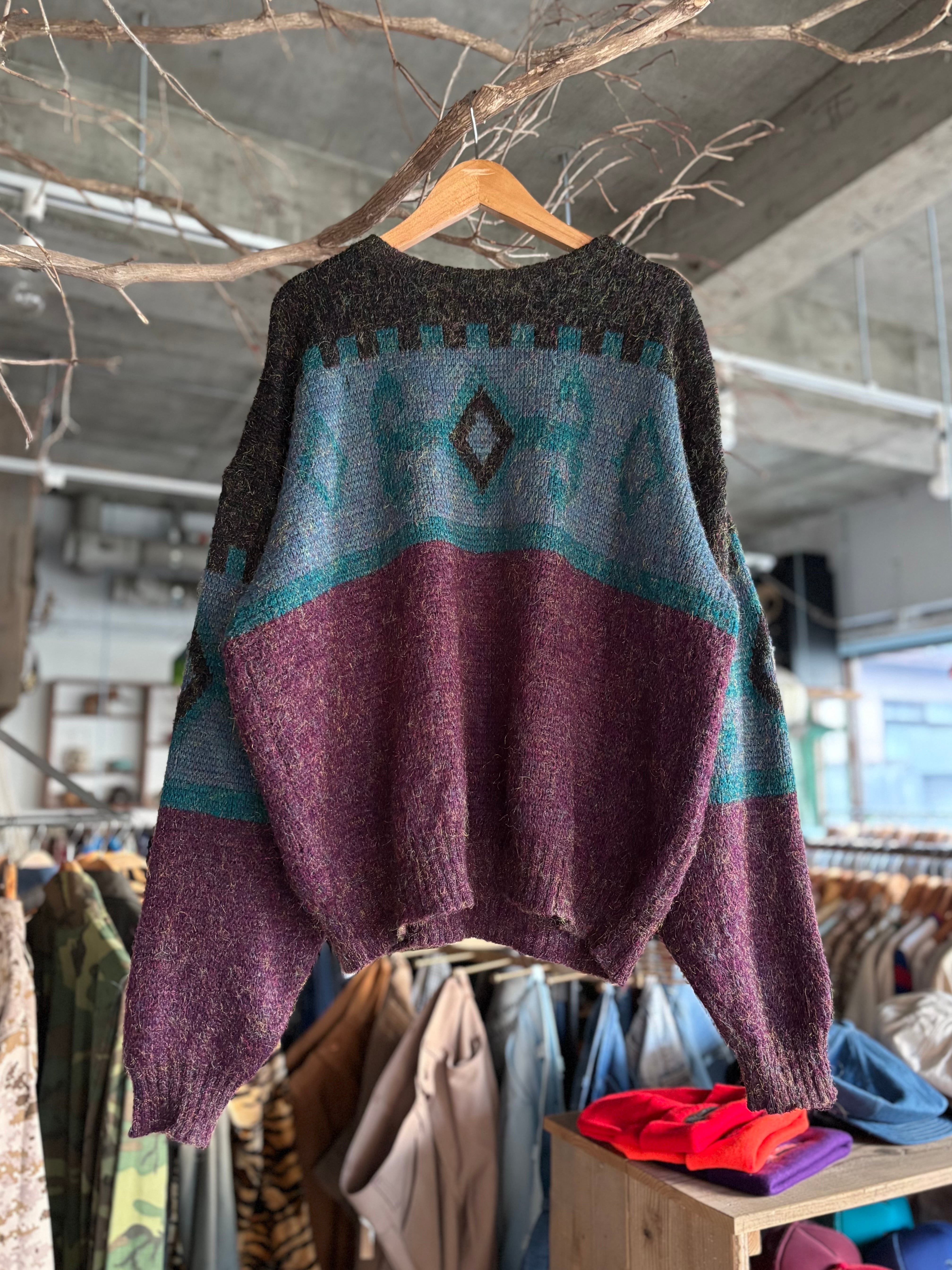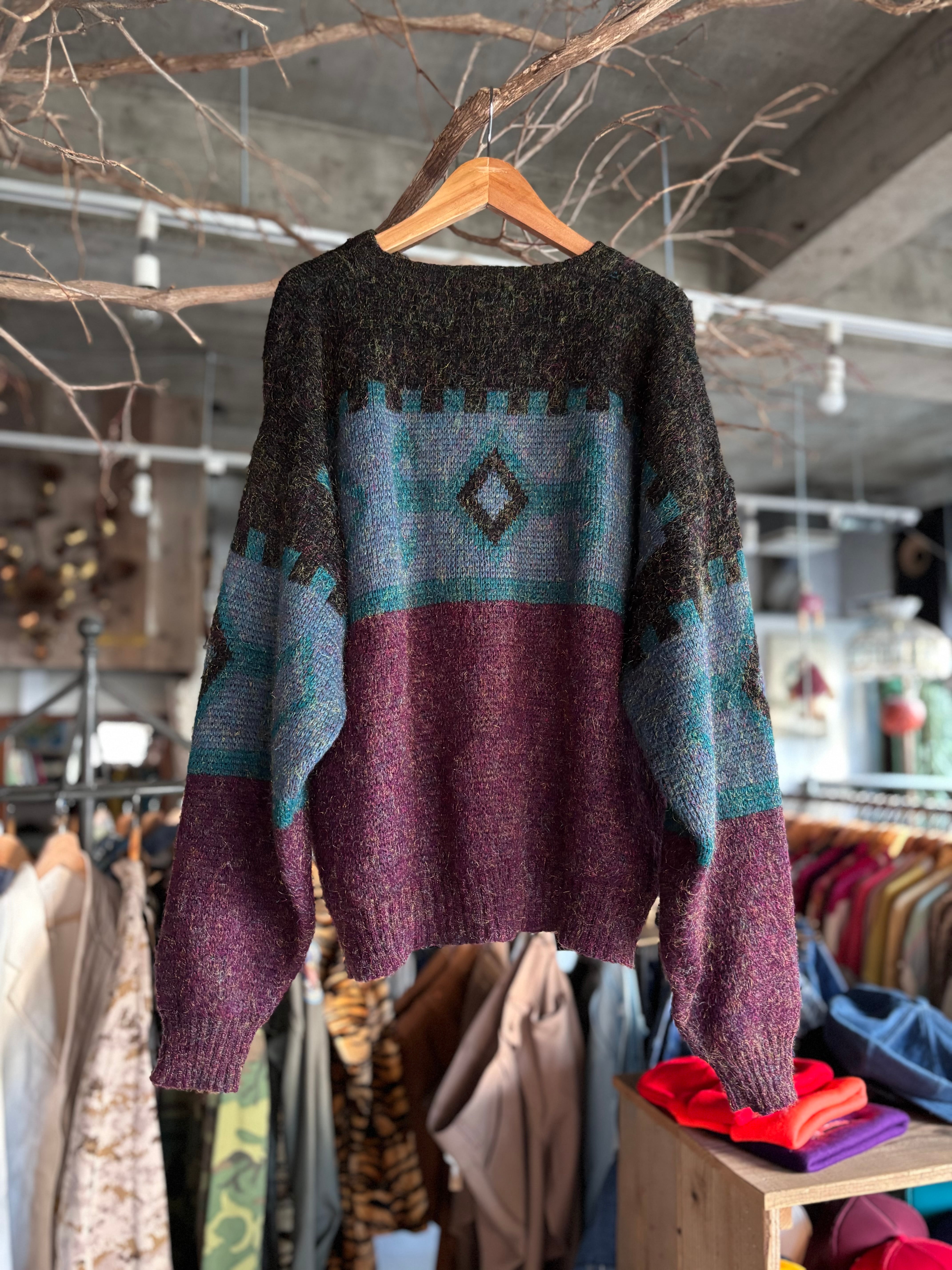 軽い着心地のアクリル×ナイロン混紡ニット。キラッと光沢のある糸が使用されています。コンパクトな着丈で、身幅にはゆとりがあるリラックスシルエット。ターコイズとマルーンの対比が洒落たカラーリング。主張しすぎないネイティブデザインで普段使いにもおすすめのニットです◎