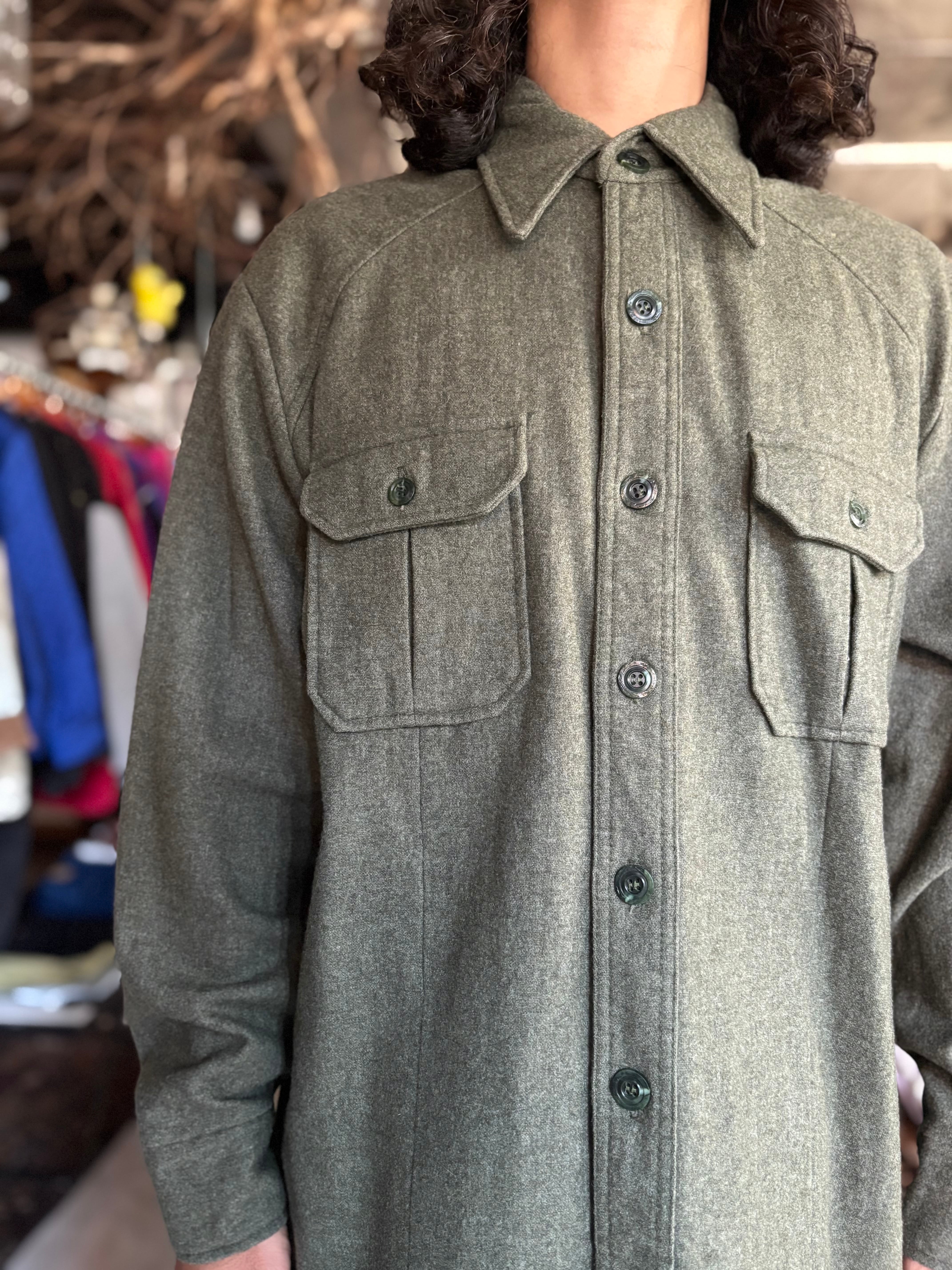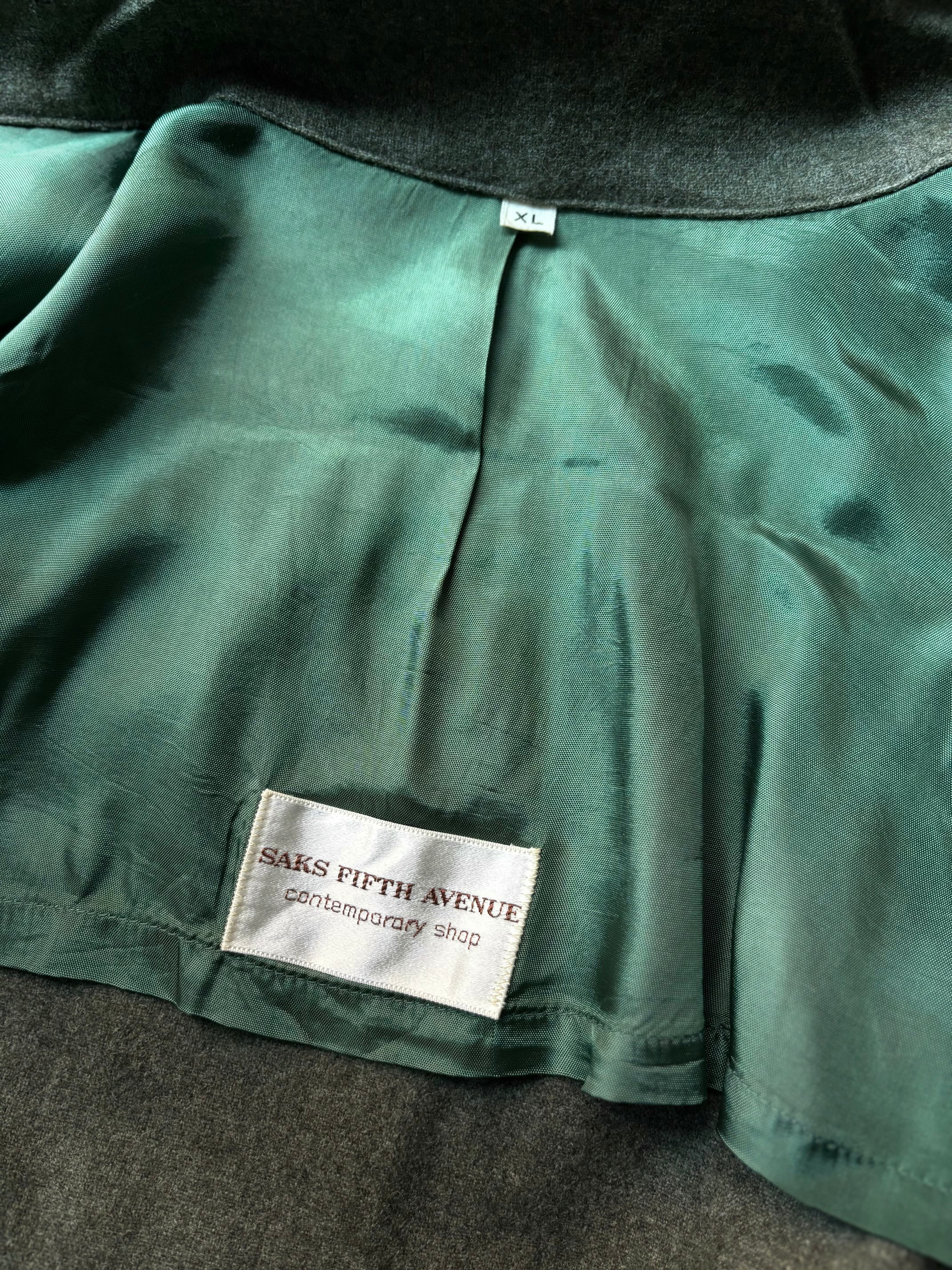 中厚のウール素材。リラックスフィット。オリーブカラー。丸くラウンドしたヨークに、背面のダーツ、サイドスリットなどディテールが盛り込まれた仕様。百貨店ブランドのSAKS FIFTH AVENUE製。上質感があり大人っぽく着こなせる1着です。