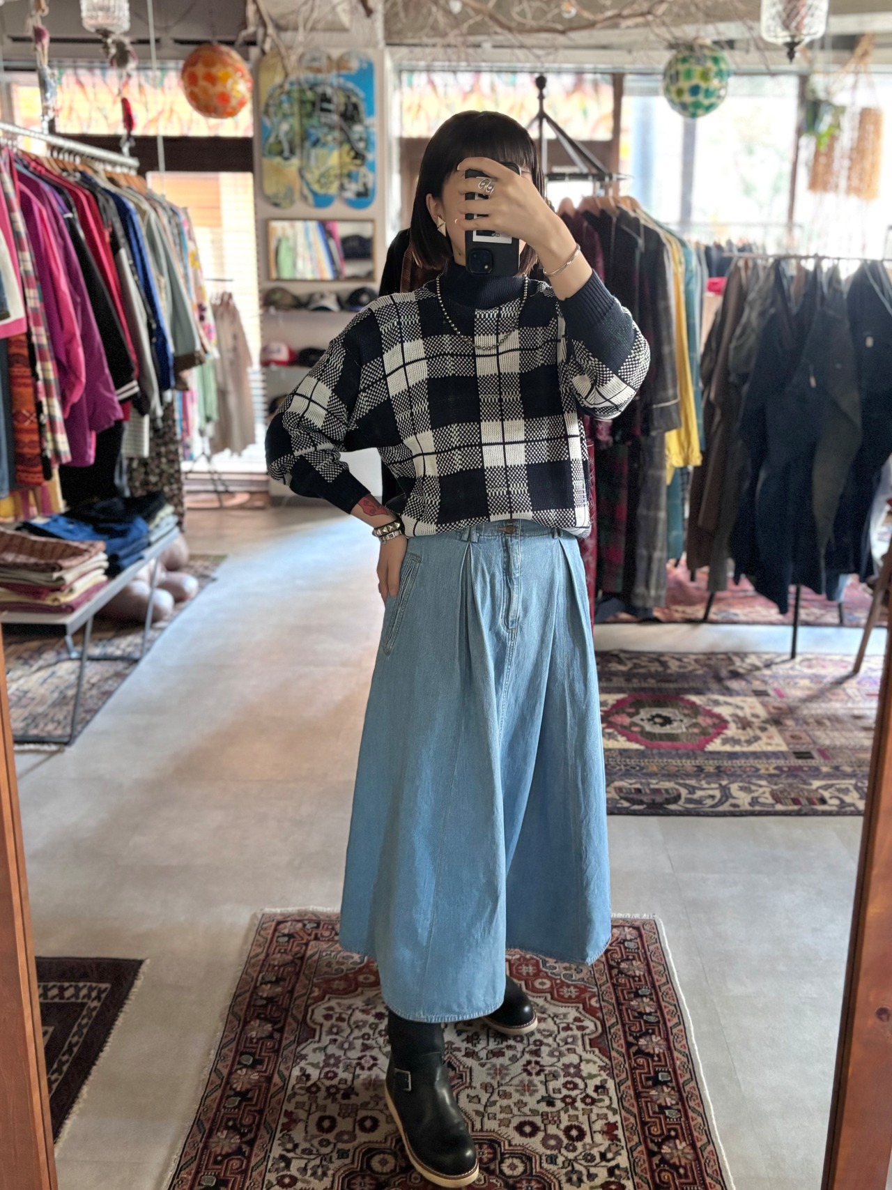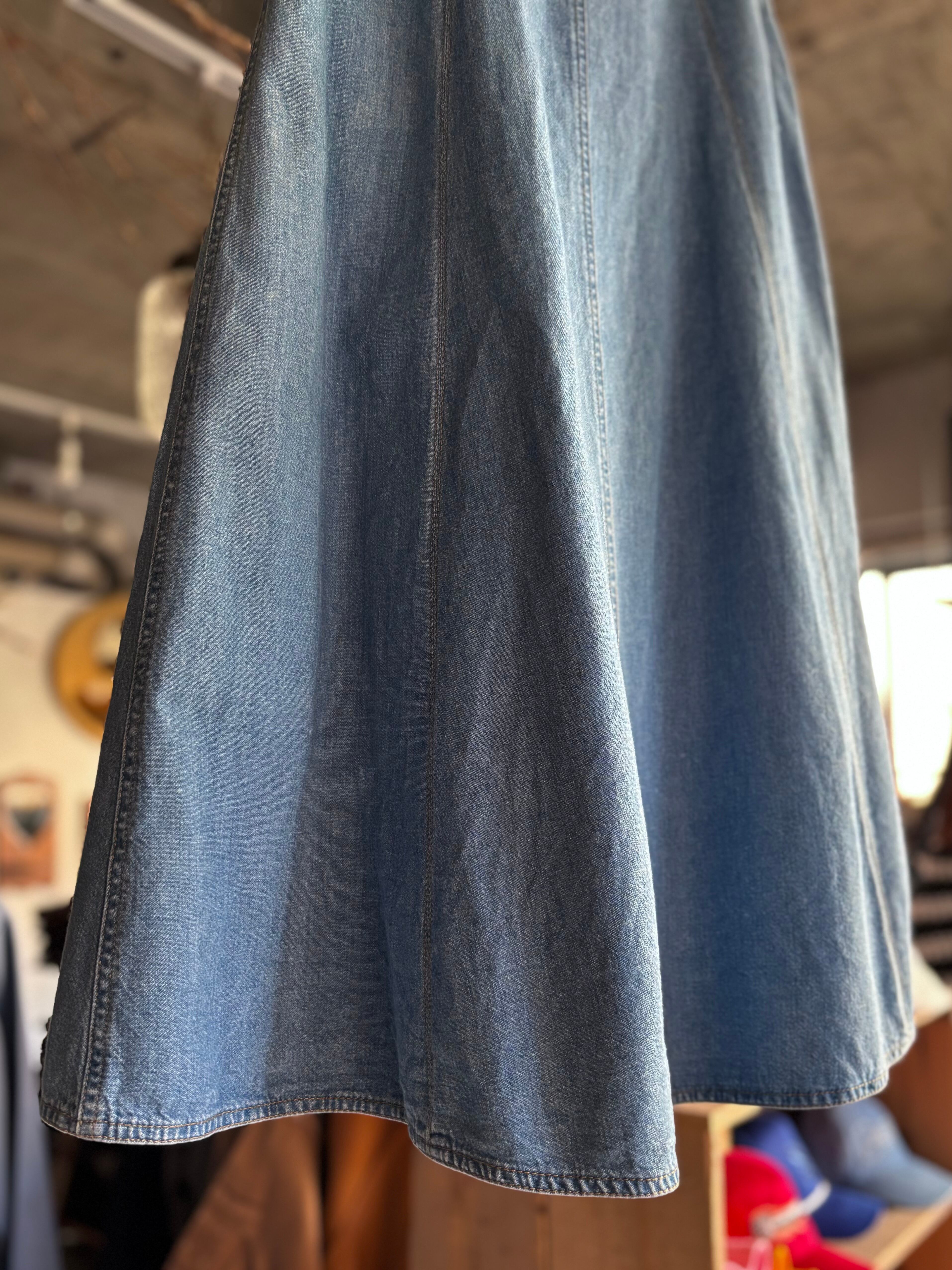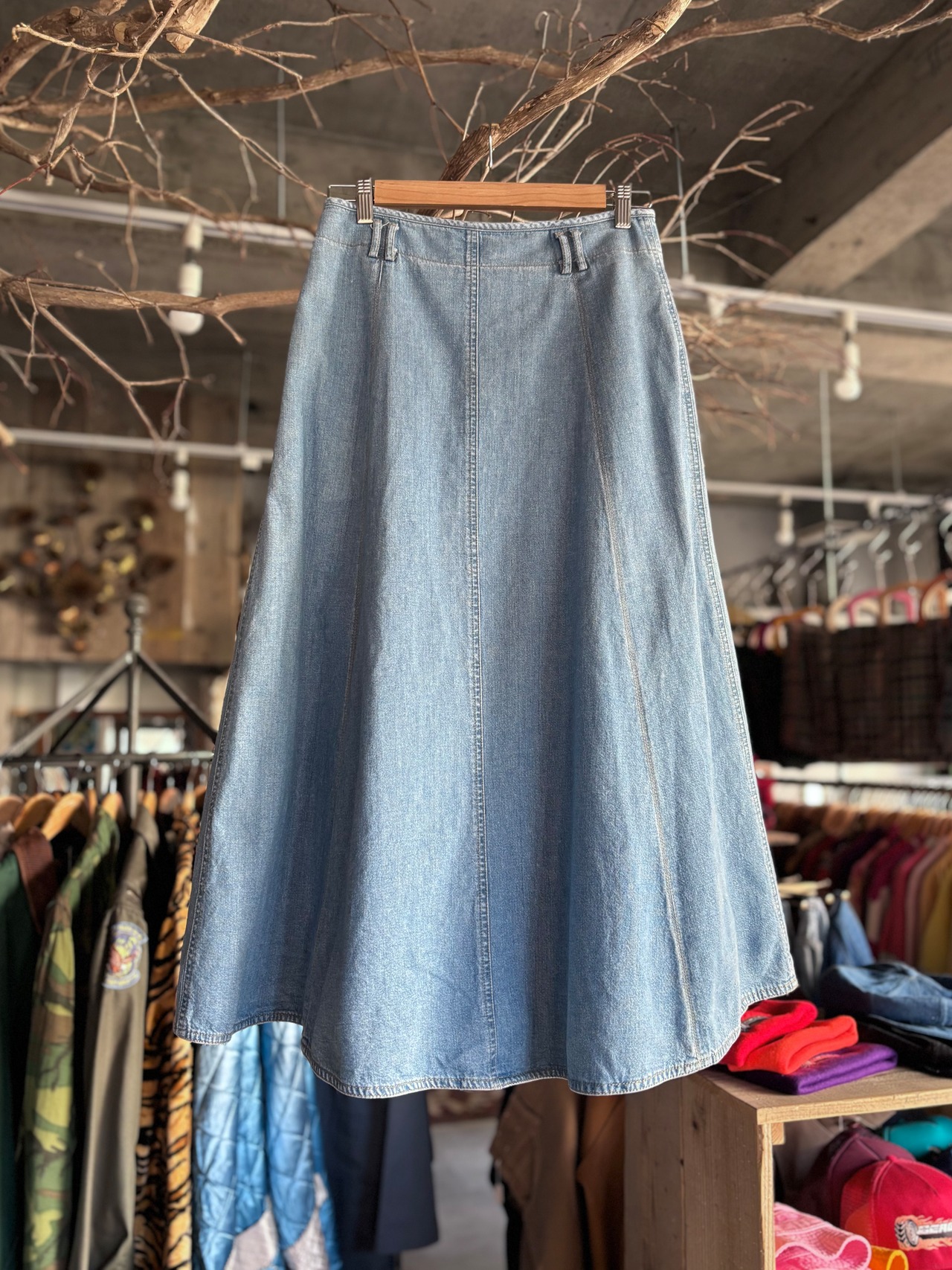 しっかりとしたデニム生地のロングスカート。フロントジップ仕様、ポケット付き。ベルトループが付くのである程度の調節が可能。スウェットやニットと合わせて大人な秋冬コーデにぜひ◎