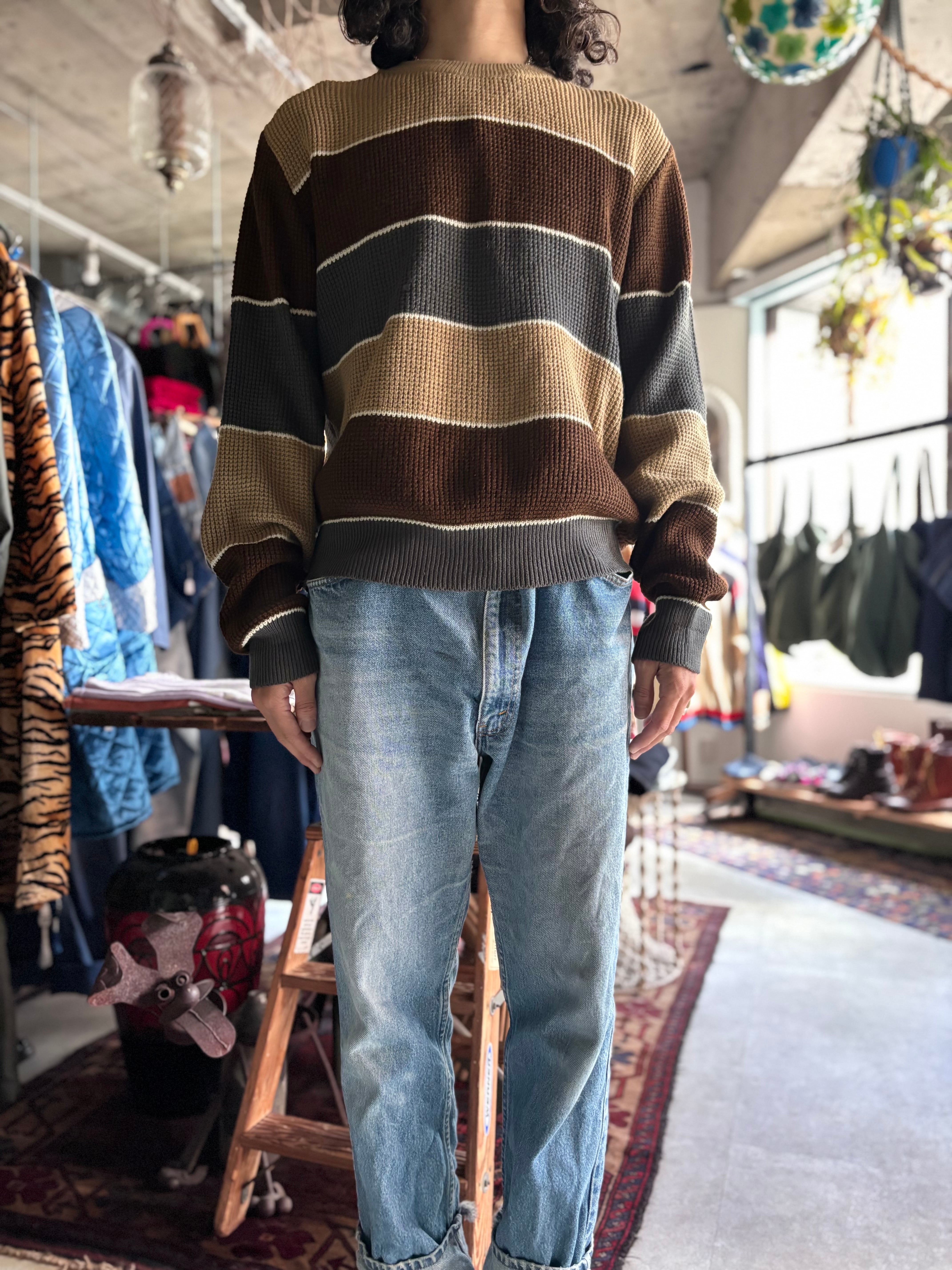 軽い着心地のアクリルニット。コンパクトな着丈のリラックスフィット。落ち着いた色味のワイドボーダーはインナーにも映えるデザイン。スウェット感覚で着用できるニットをお探しの方におすすめです。