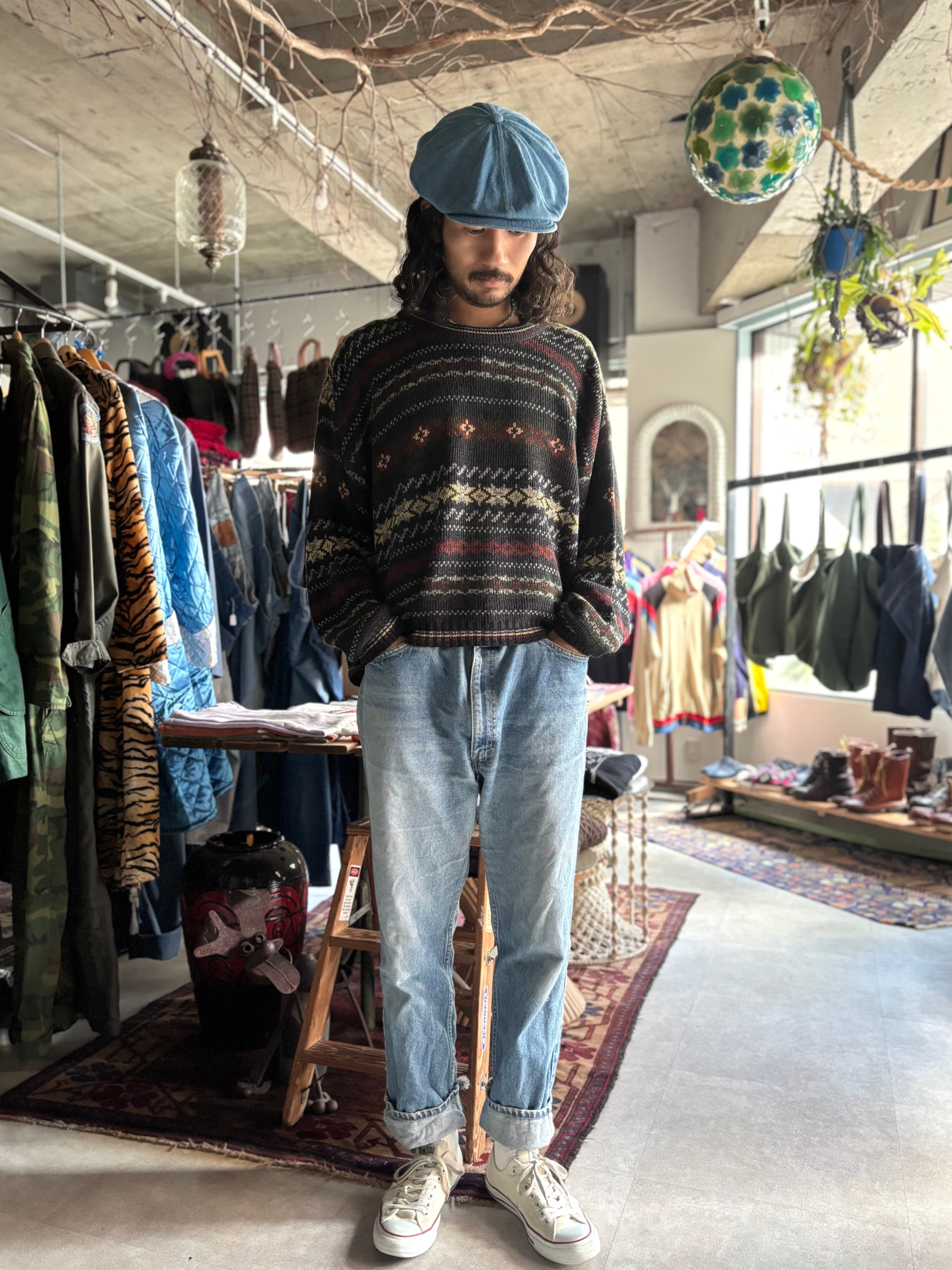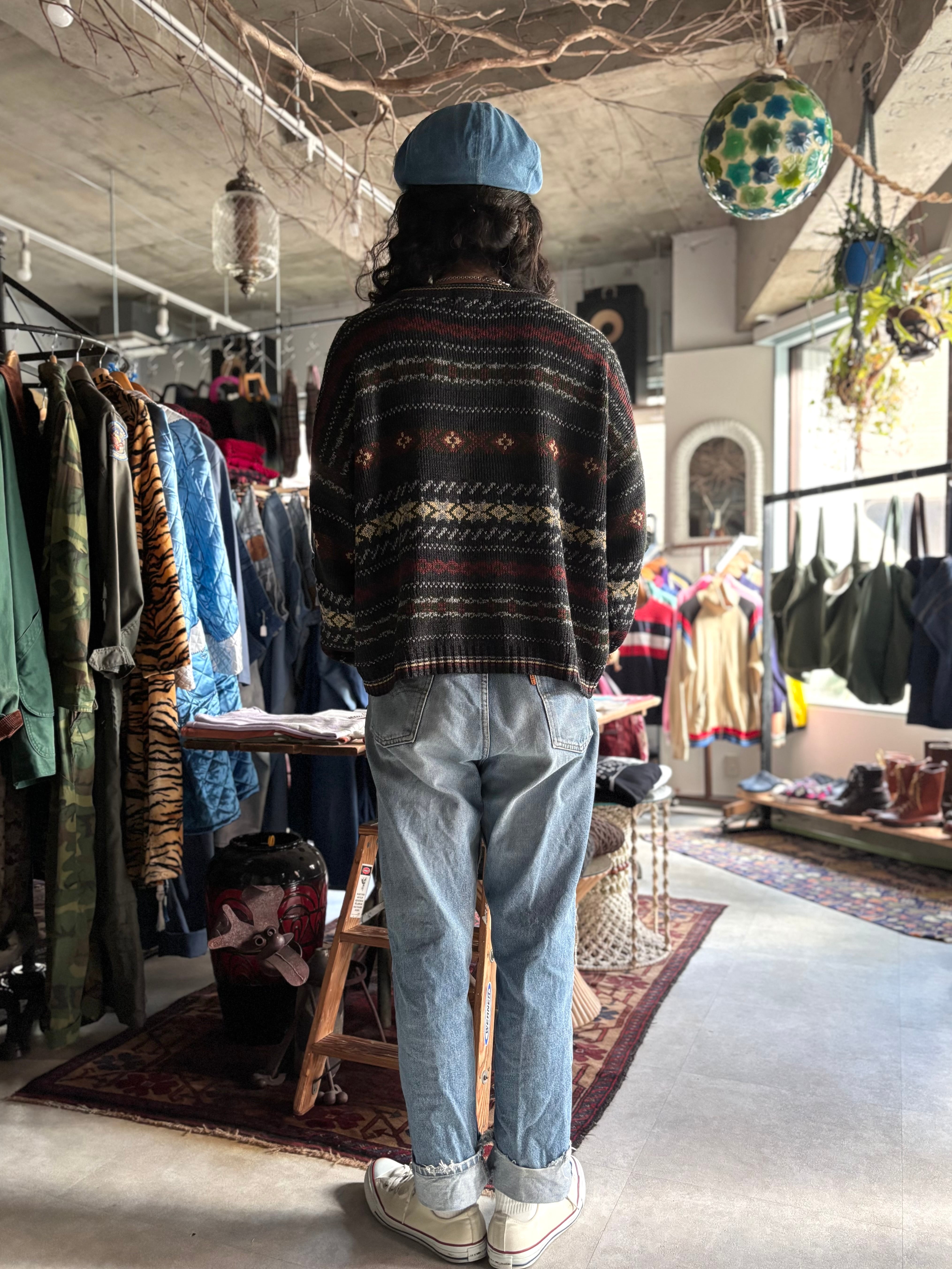 軽い着心地のアクリルニット。ゆとりのある身幅×短丈が絶妙にかわいいサイズバランス。USA製。落ち着いたチャコールベースにフェアアイル柄。