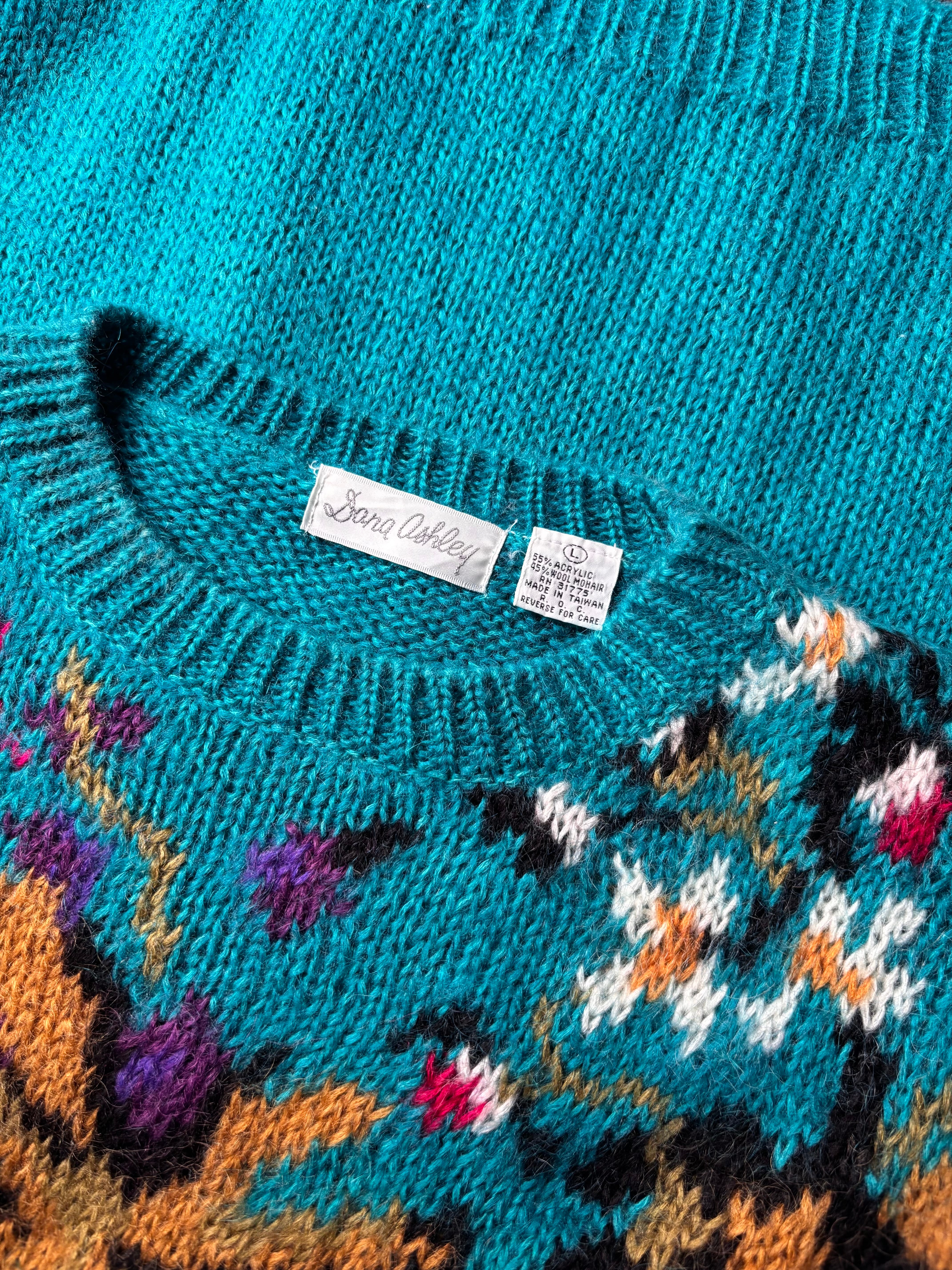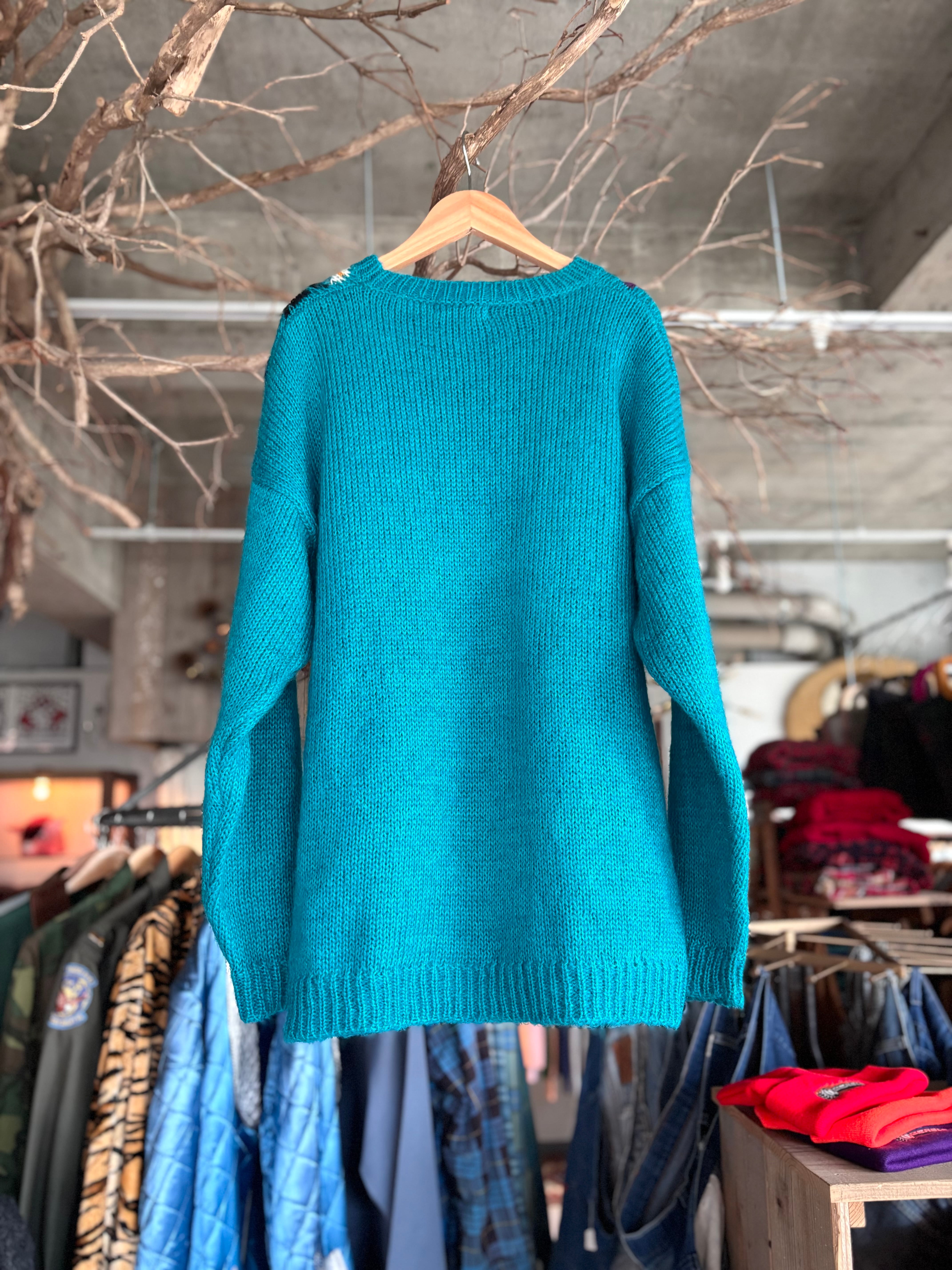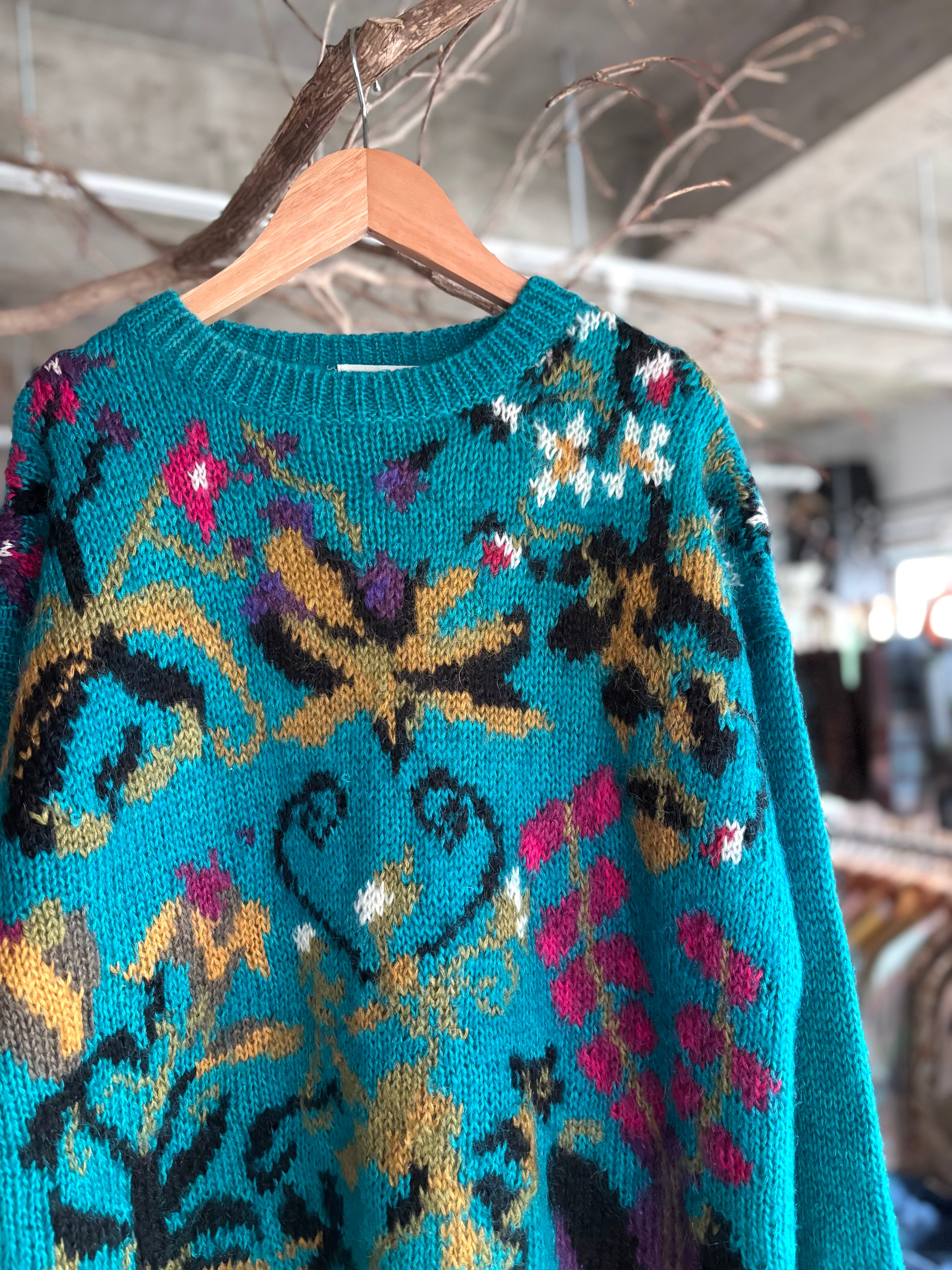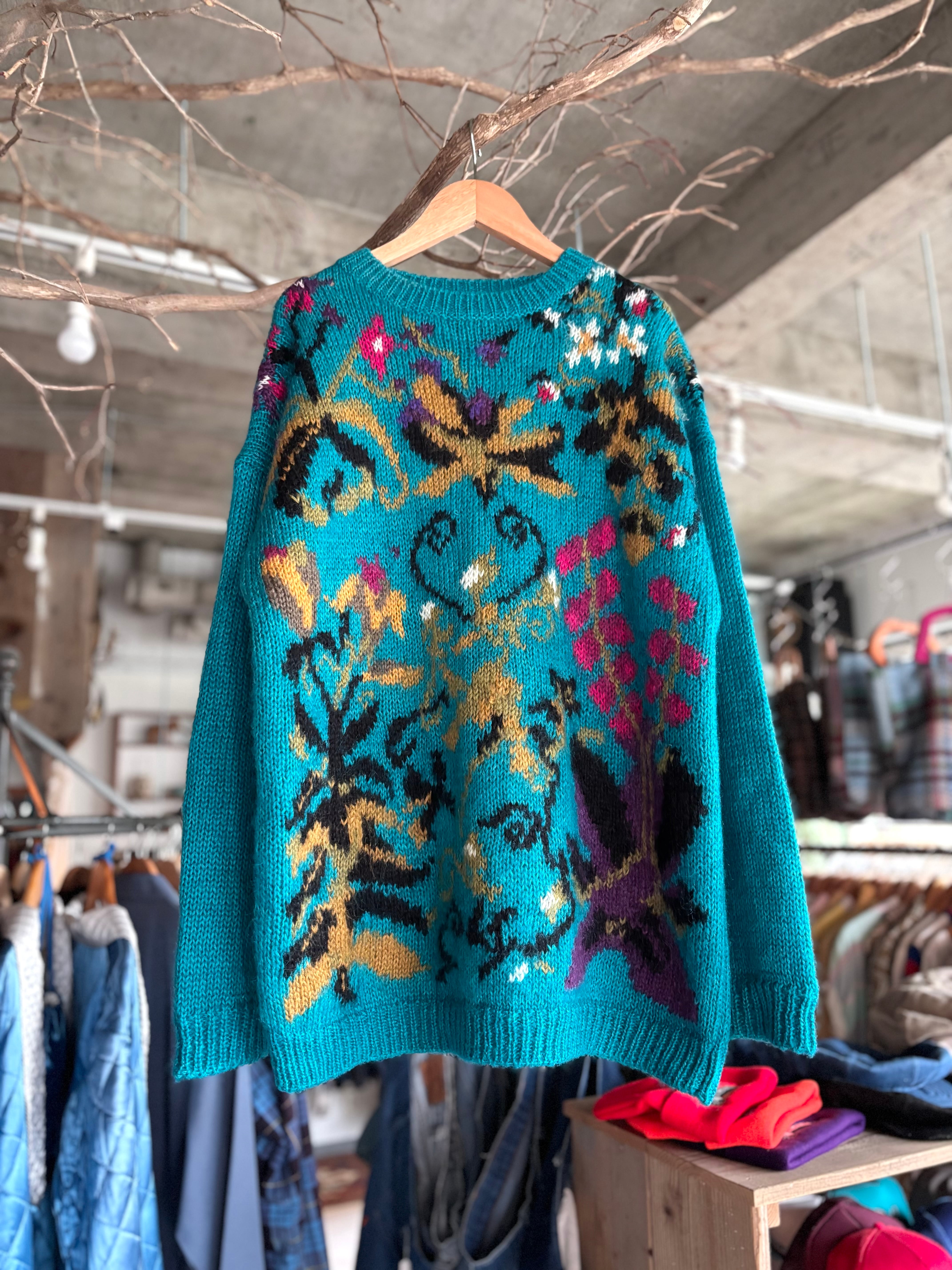 アクリル×ウールモヘア混紡のニット。リラックスフィット。ターコイズベース×広範囲にわたるボタニカルモチーフ柄。シンプルなボトムスにこれ1枚で決まる可愛さです◎