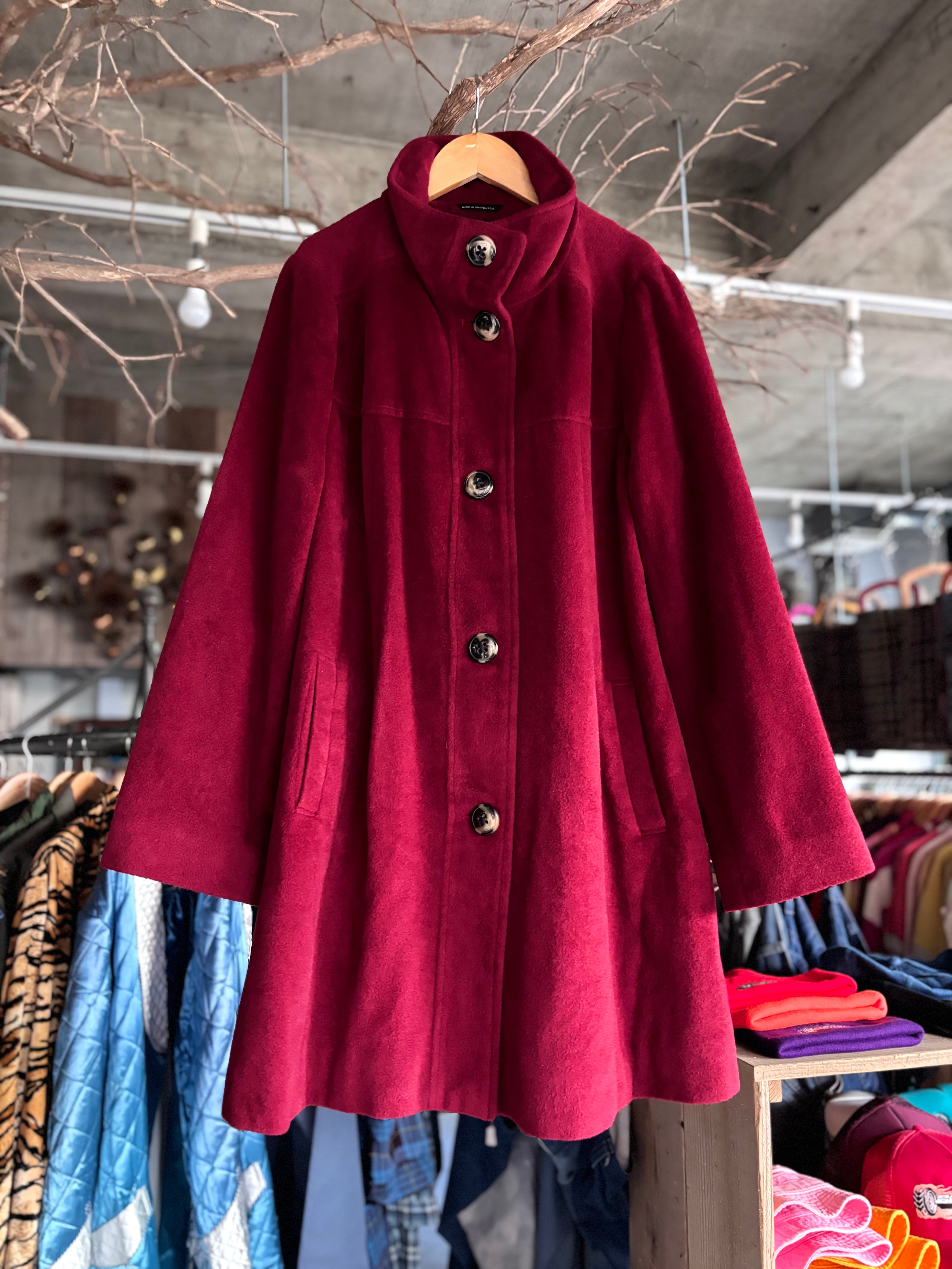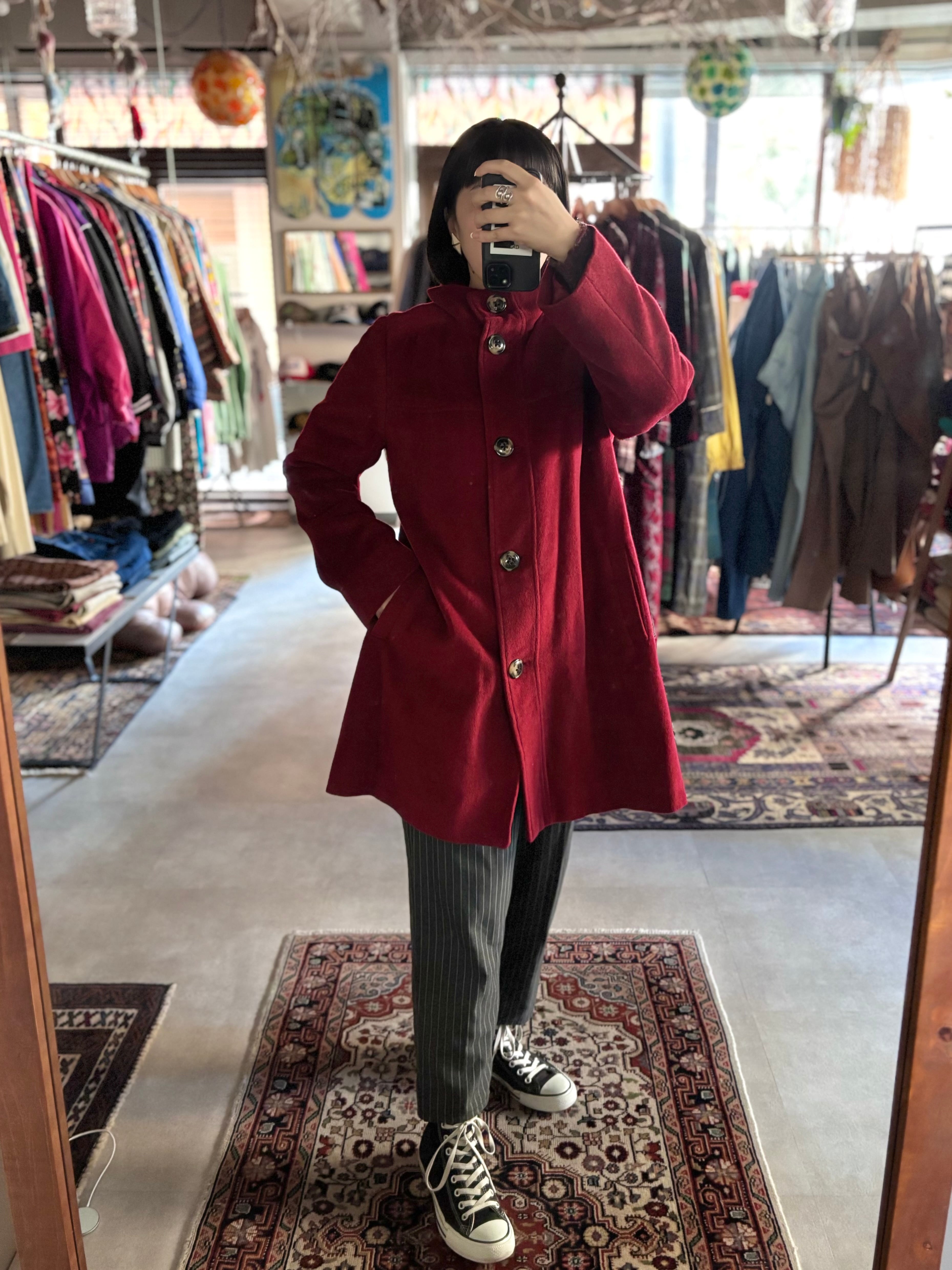 しっかりとした厚みのあるウール×アクリル×アンゴラ混紡生地。リラックスフィット。スタンドカラー仕様。落ち着いたワインレッド+きれいなAラインシルエットがクラシカルな印象。デニムと合わせてカジュアルスタイルはもちろん、ロングスカートとも相性抜群です。冬の主役になるカラーアウターをお探しの方におすすめです◎