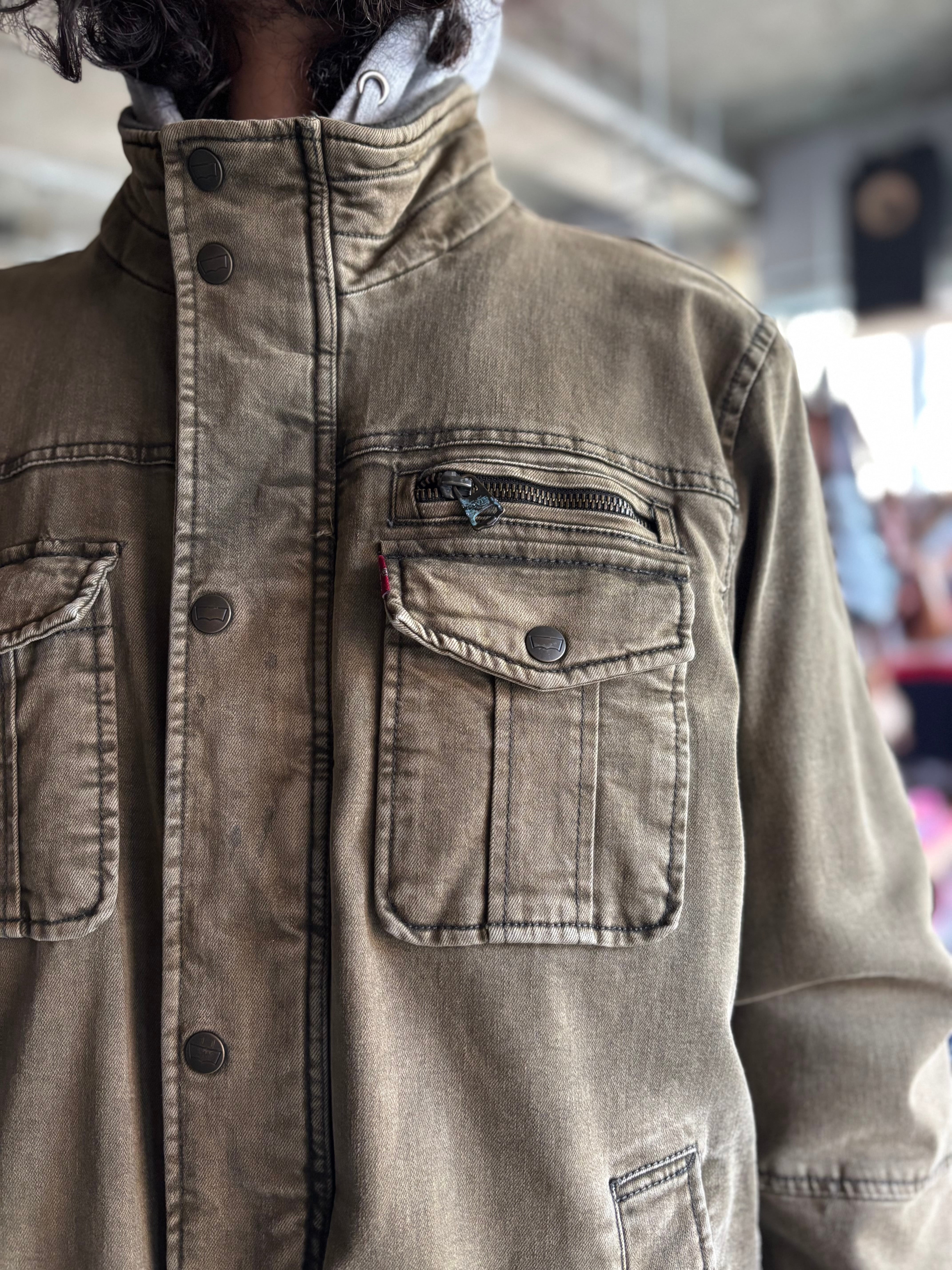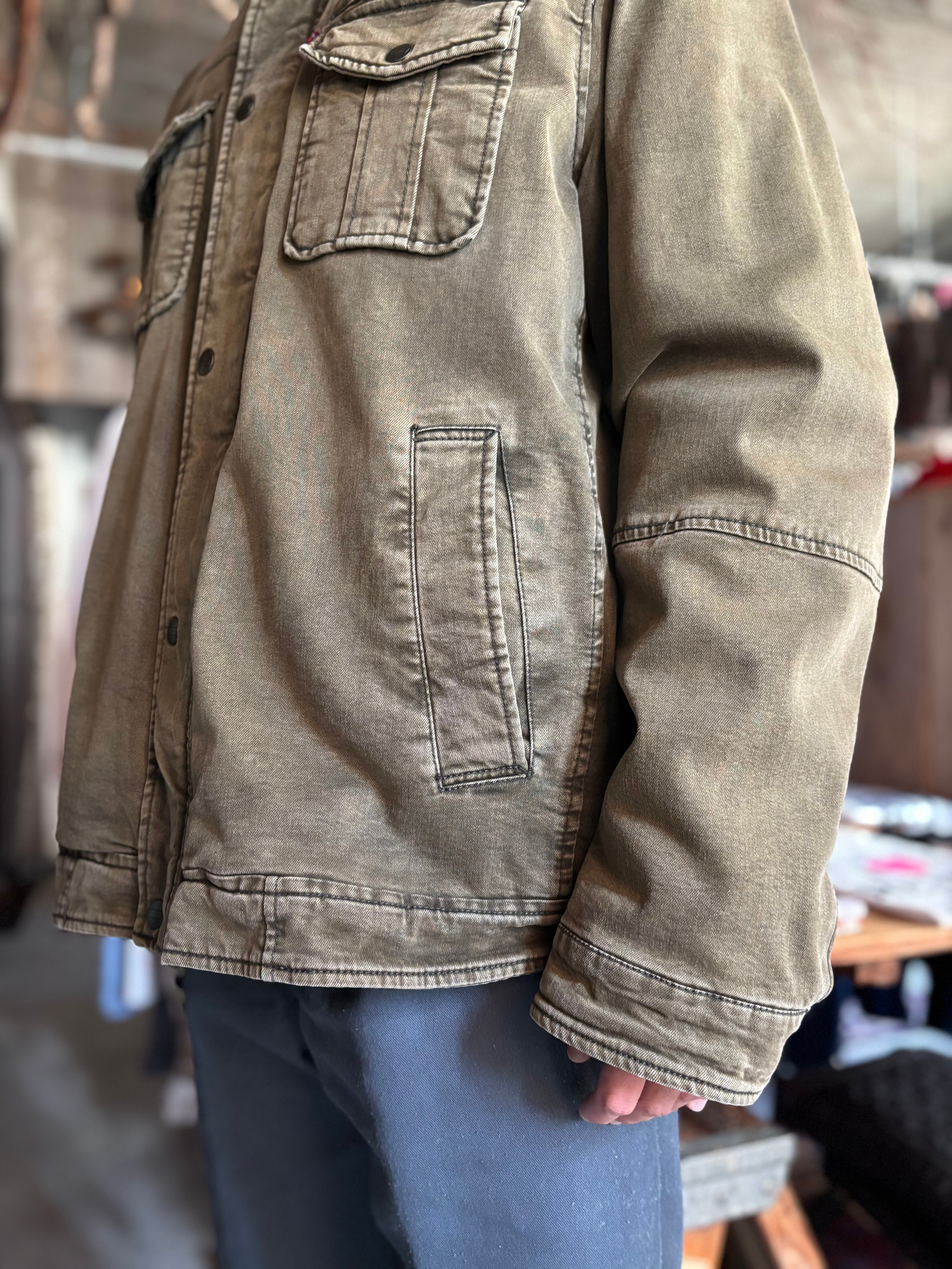 しっかりした厚みのコットン生地。リラックスシルエット。リブ付きのスタンドカラーに、比翼フロントのライディングジャケット。綺麗なコンディション。