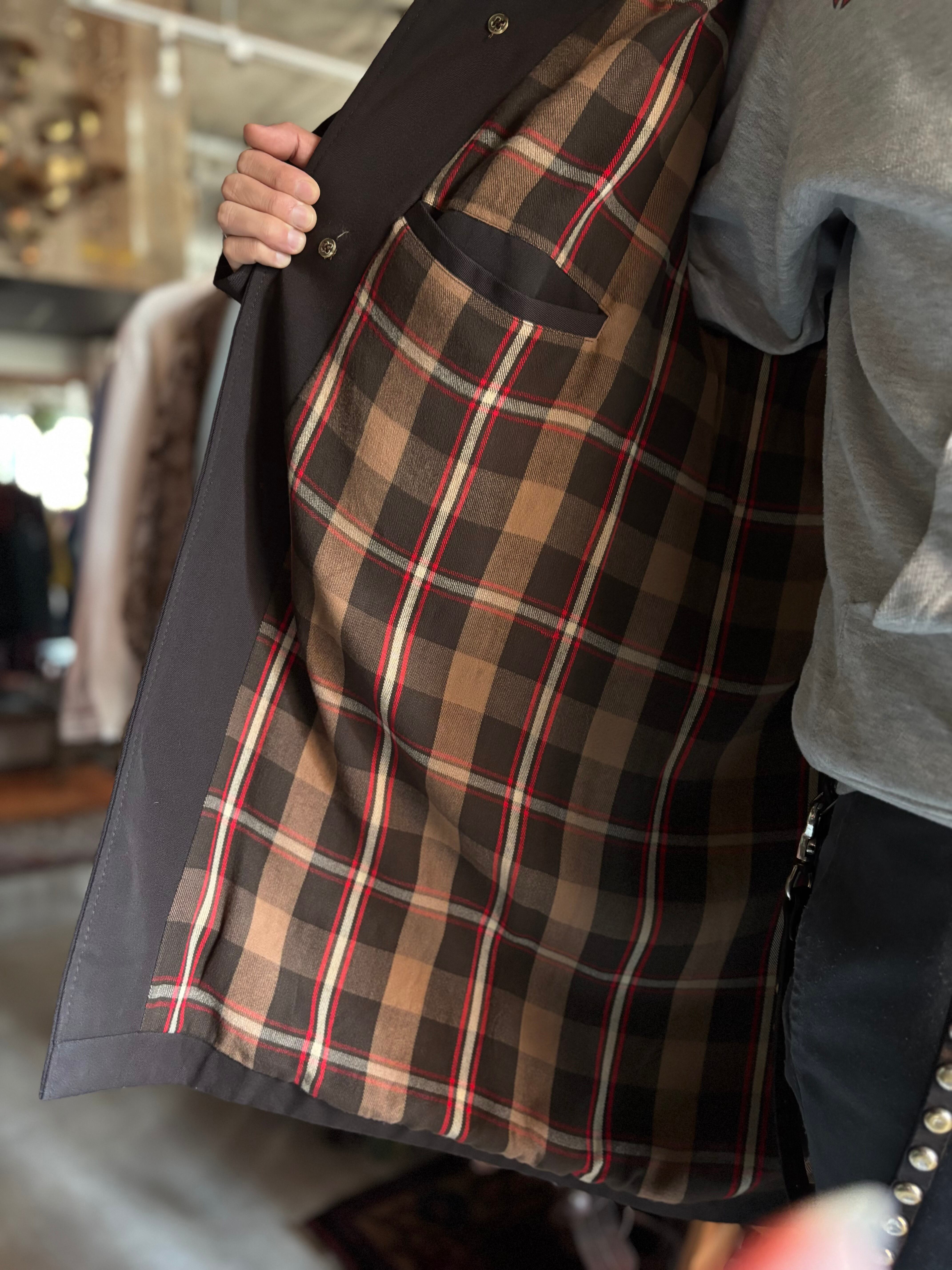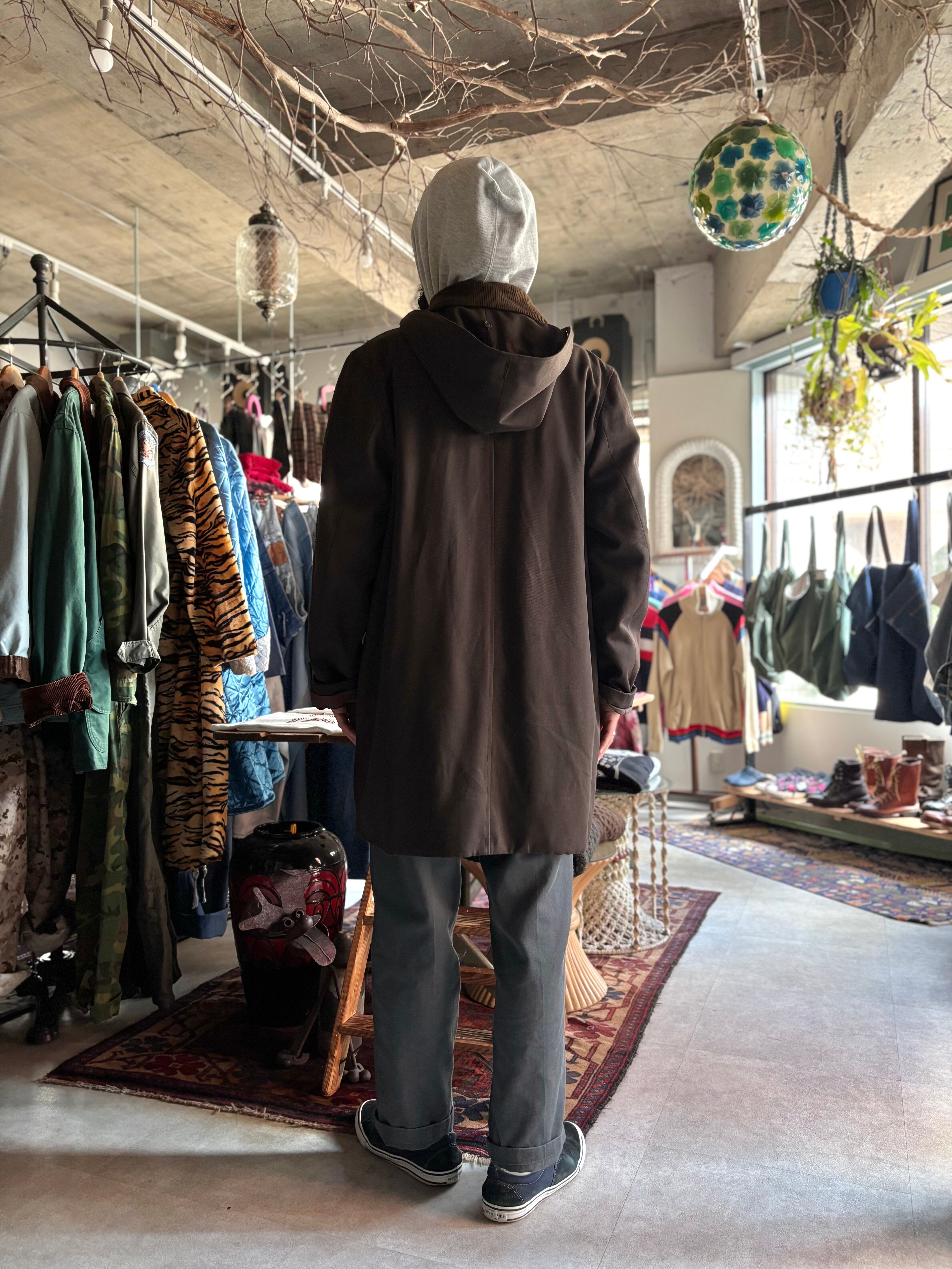 厚みのあるポリレーヨン素材。内側はフランネルライナー。リラックスシルエット。ベルギー製のビンテージモデル。取り外しのできる大きめフードに、セットインスリーブ、凝った仕様の襟周りなどディテール満載。モッズパーカーのような感覚で着用できます。