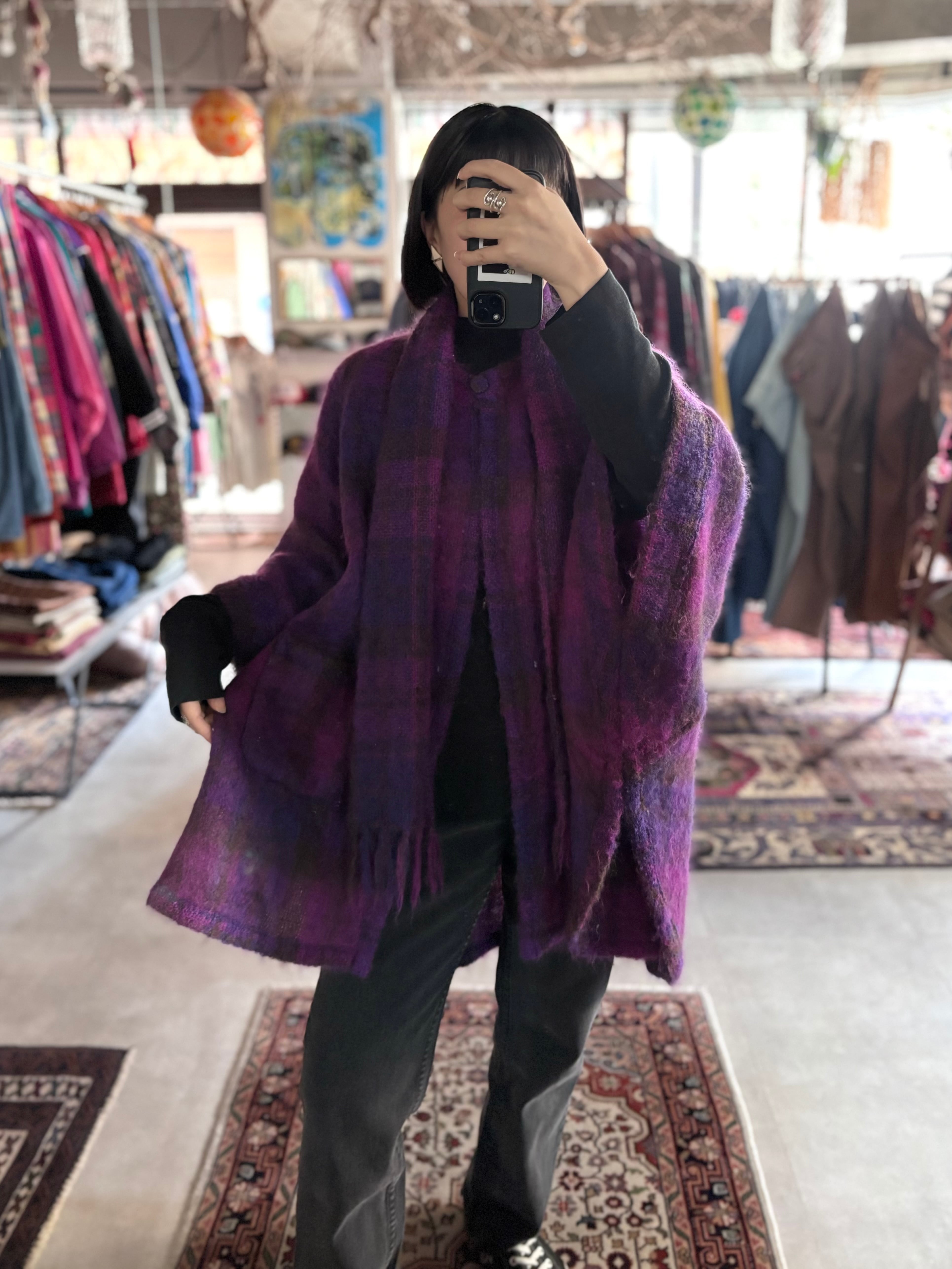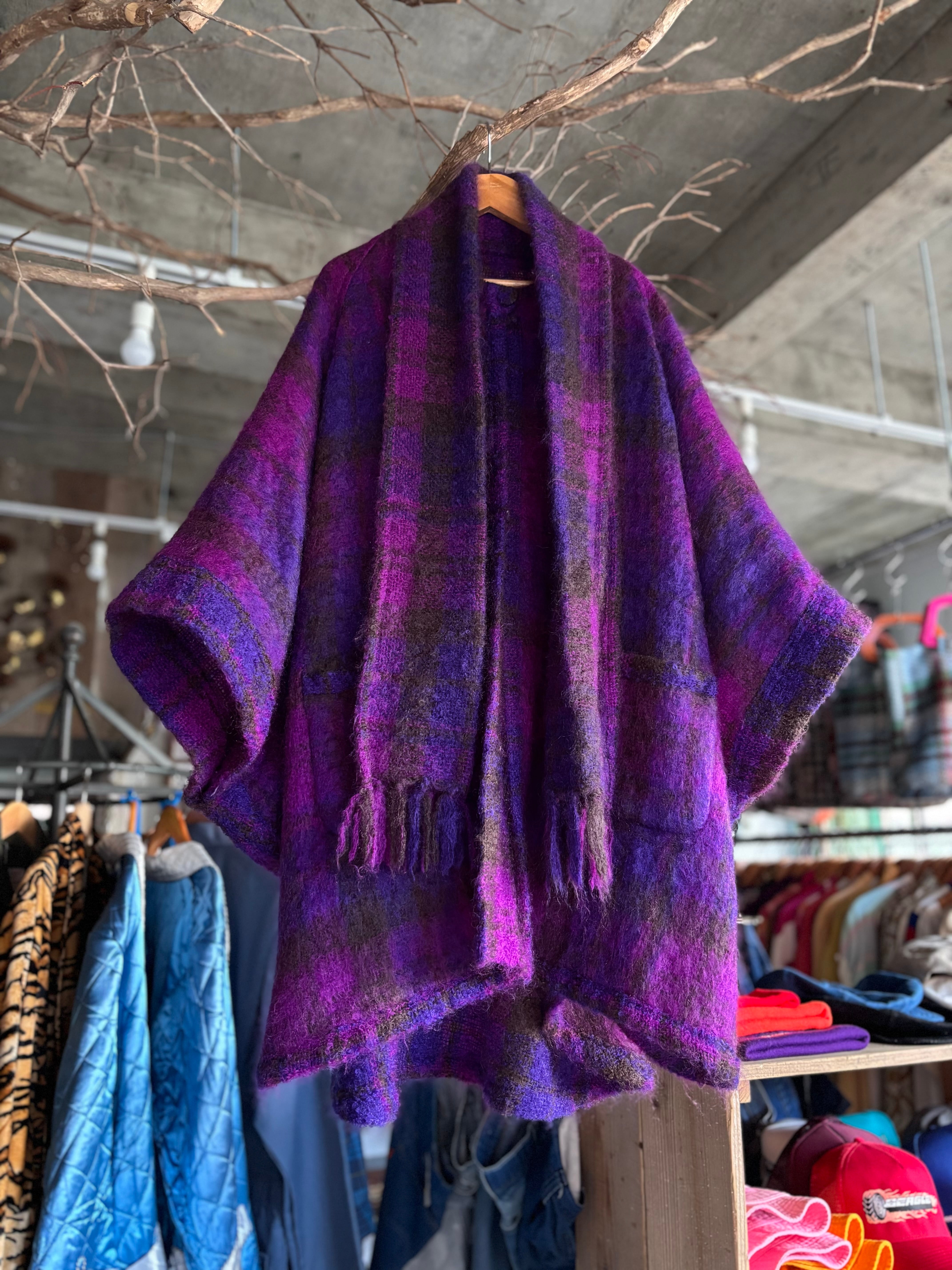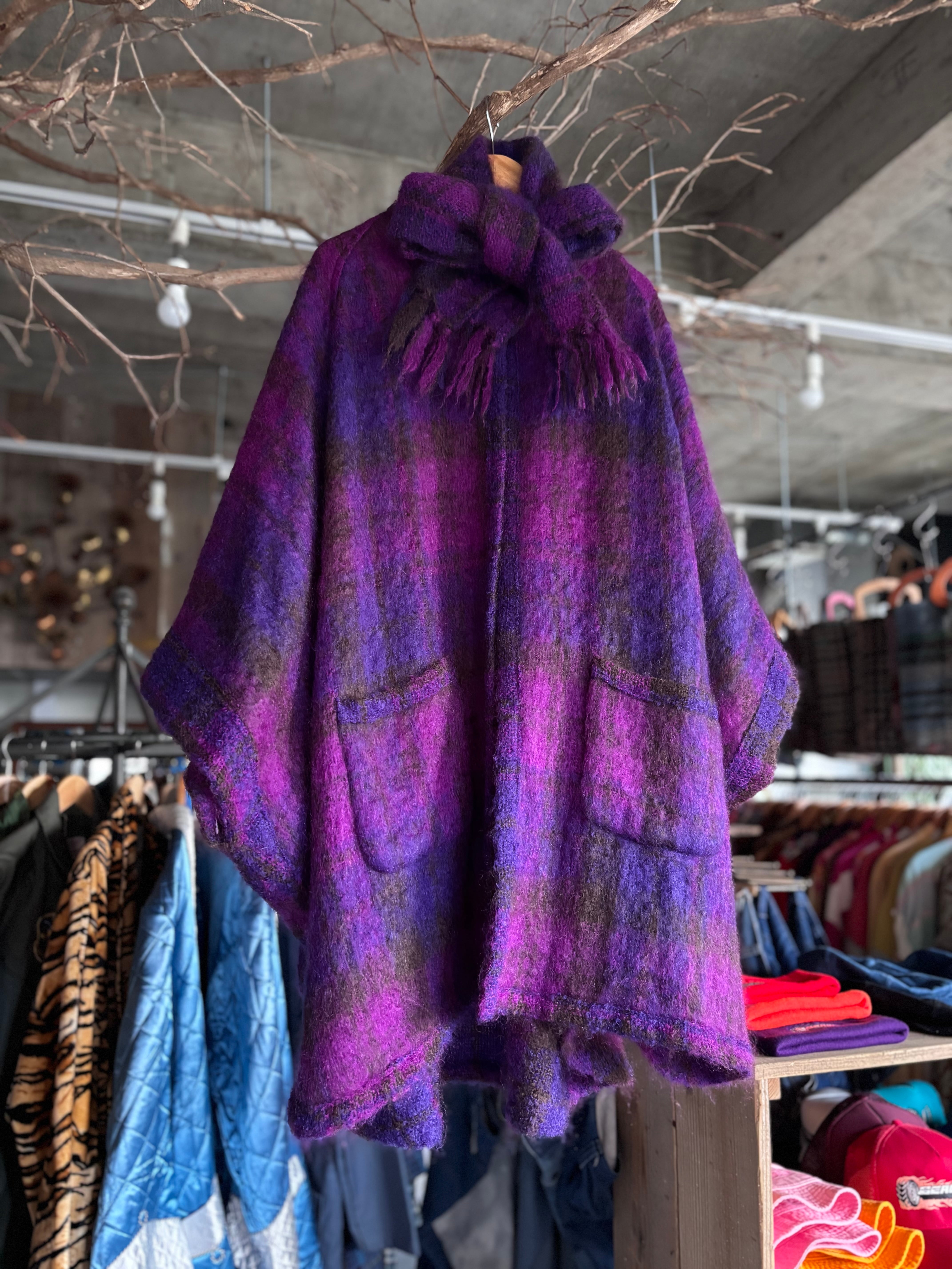 ふんわりと毛足のあるウール×モヘアの混紡生地を使用したポンチョ。深みのあるパープルとブラウンのチェック。裏表のそれぞれ同じ位置にボタンとポケットが付く贅沢リバーシブル仕様(柄は変わりません)。ショールのような襟元と長すぎない丈感がバランス良く、肩から羽織るだけでスタイルが完成する存在感のある1枚。
