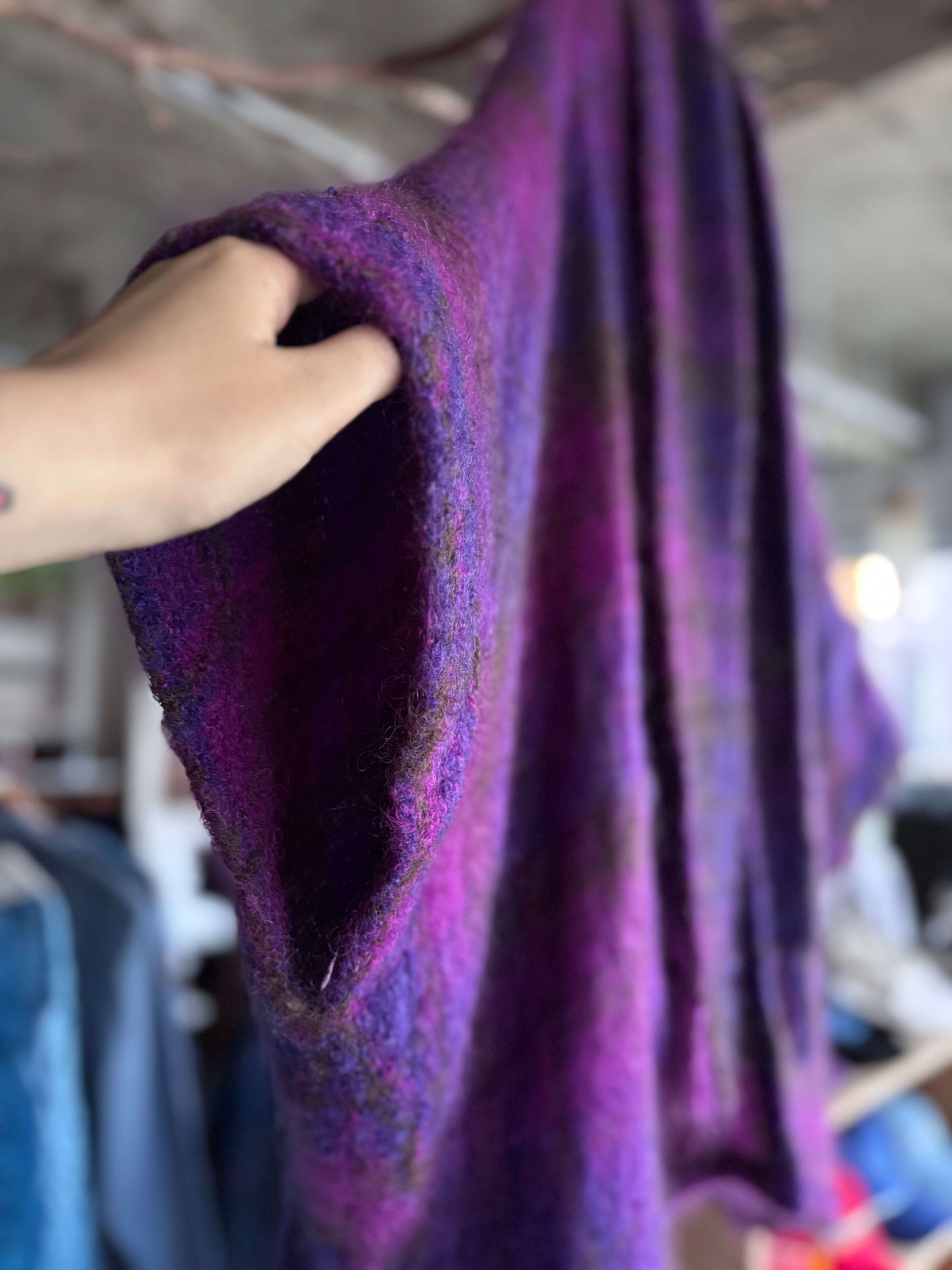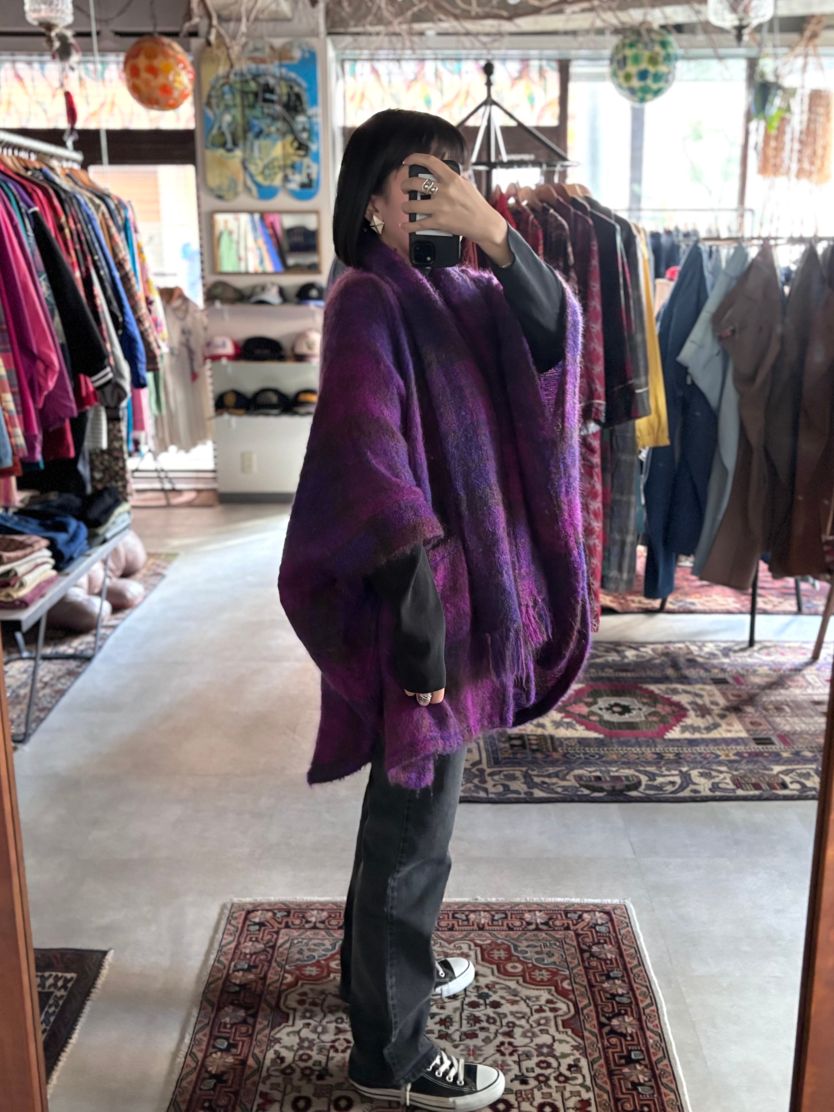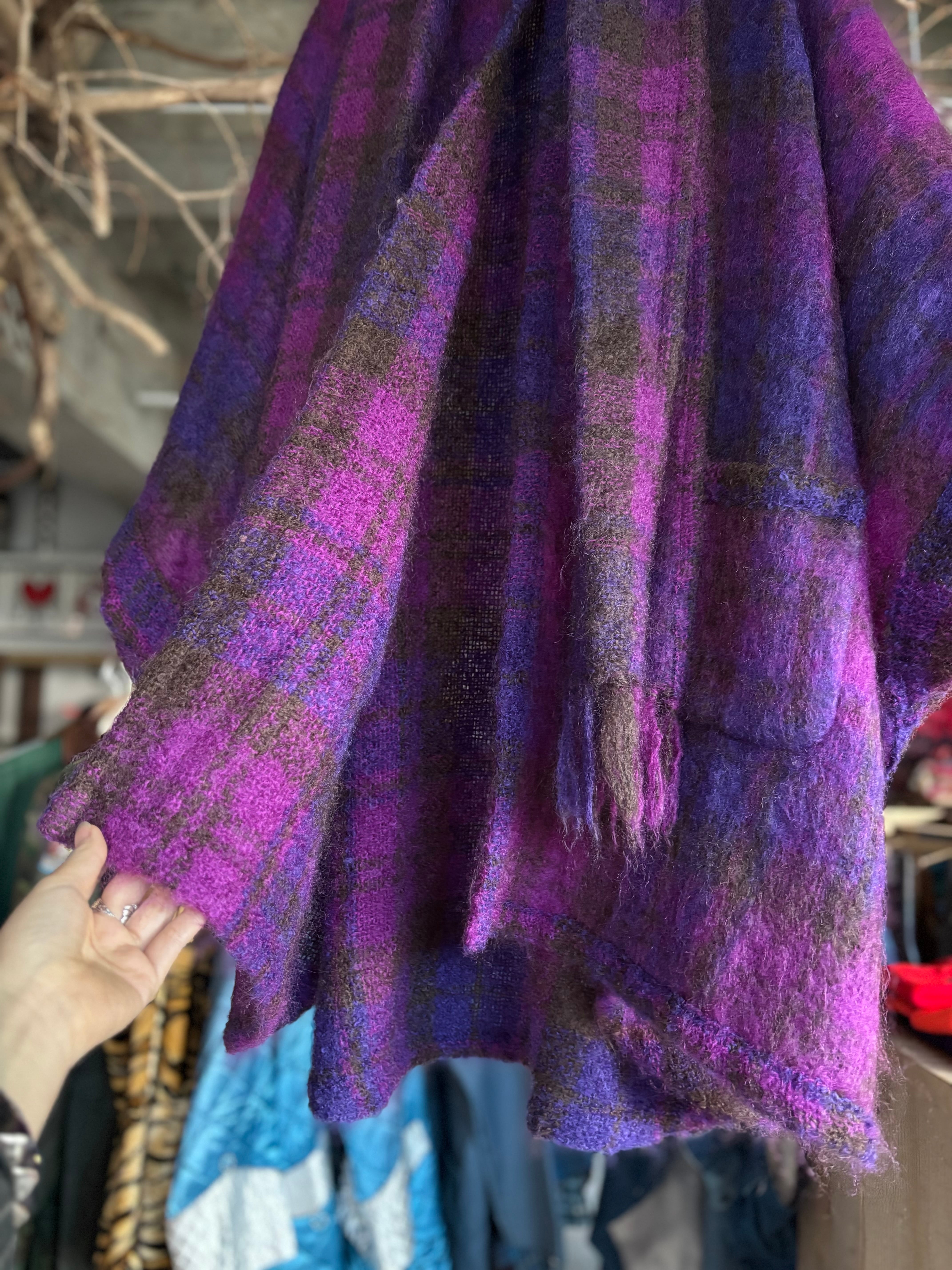 ふんわりと毛足のあるウール×モヘアの混紡生地を使用したポンチョ。深みのあるパープルとブラウンのチェック。裏表のそれぞれ同じ位置にボタンとポケットが付く贅沢リバーシブル仕様(柄は変わりません)。ショールのような襟元と長すぎない丈感がバランス良く、肩から羽織るだけでスタイルが完成する存在感のある1枚。