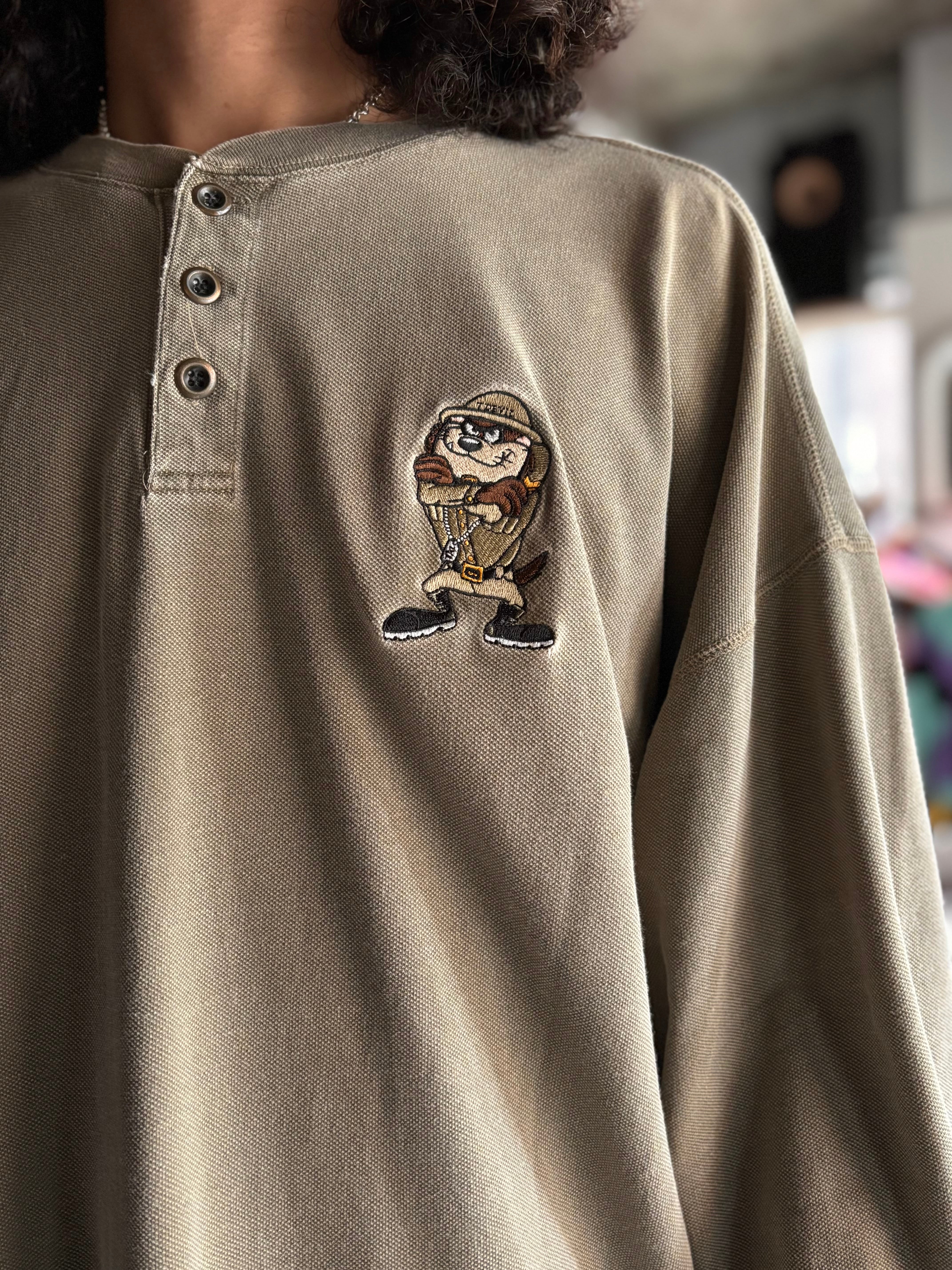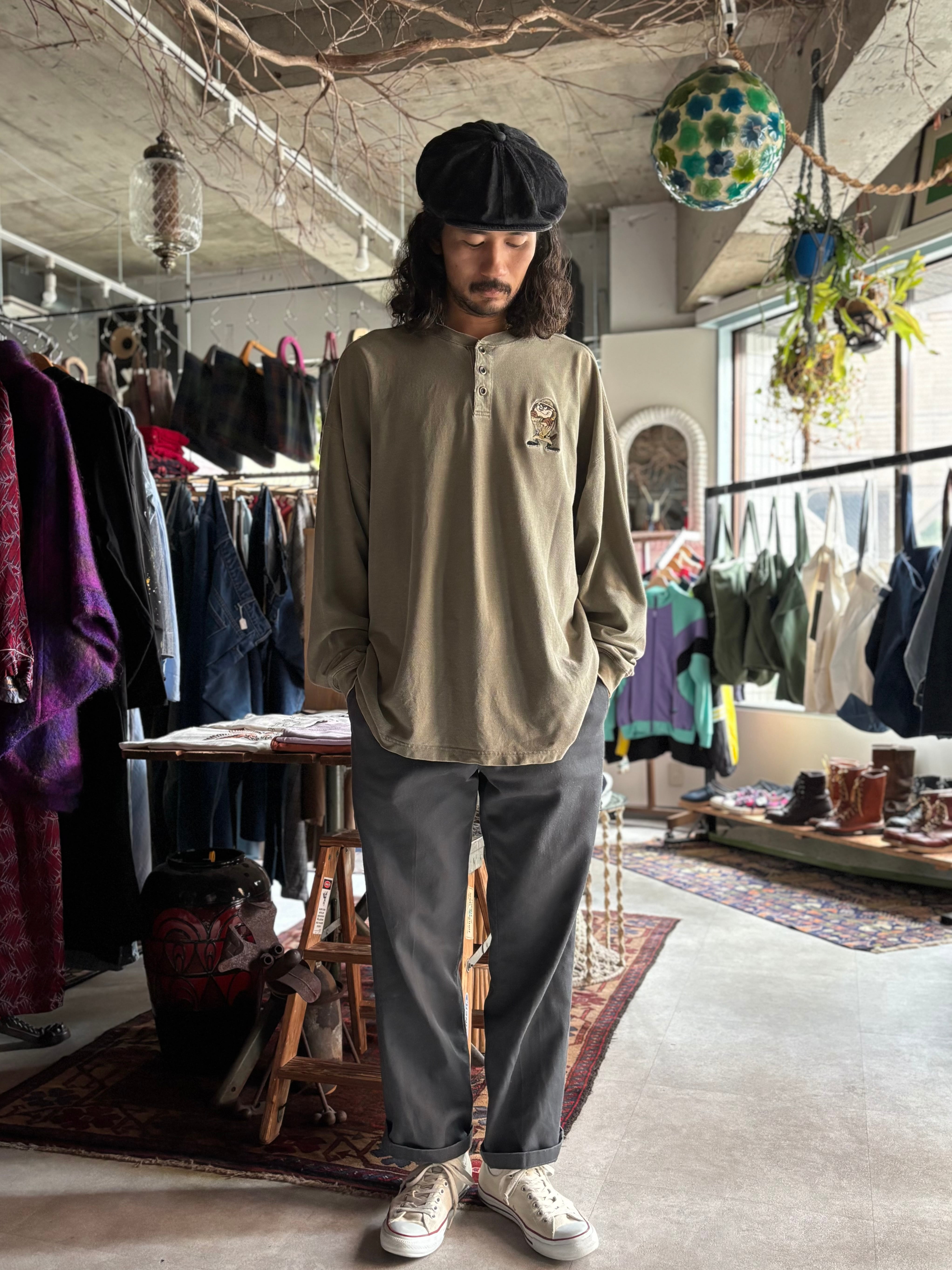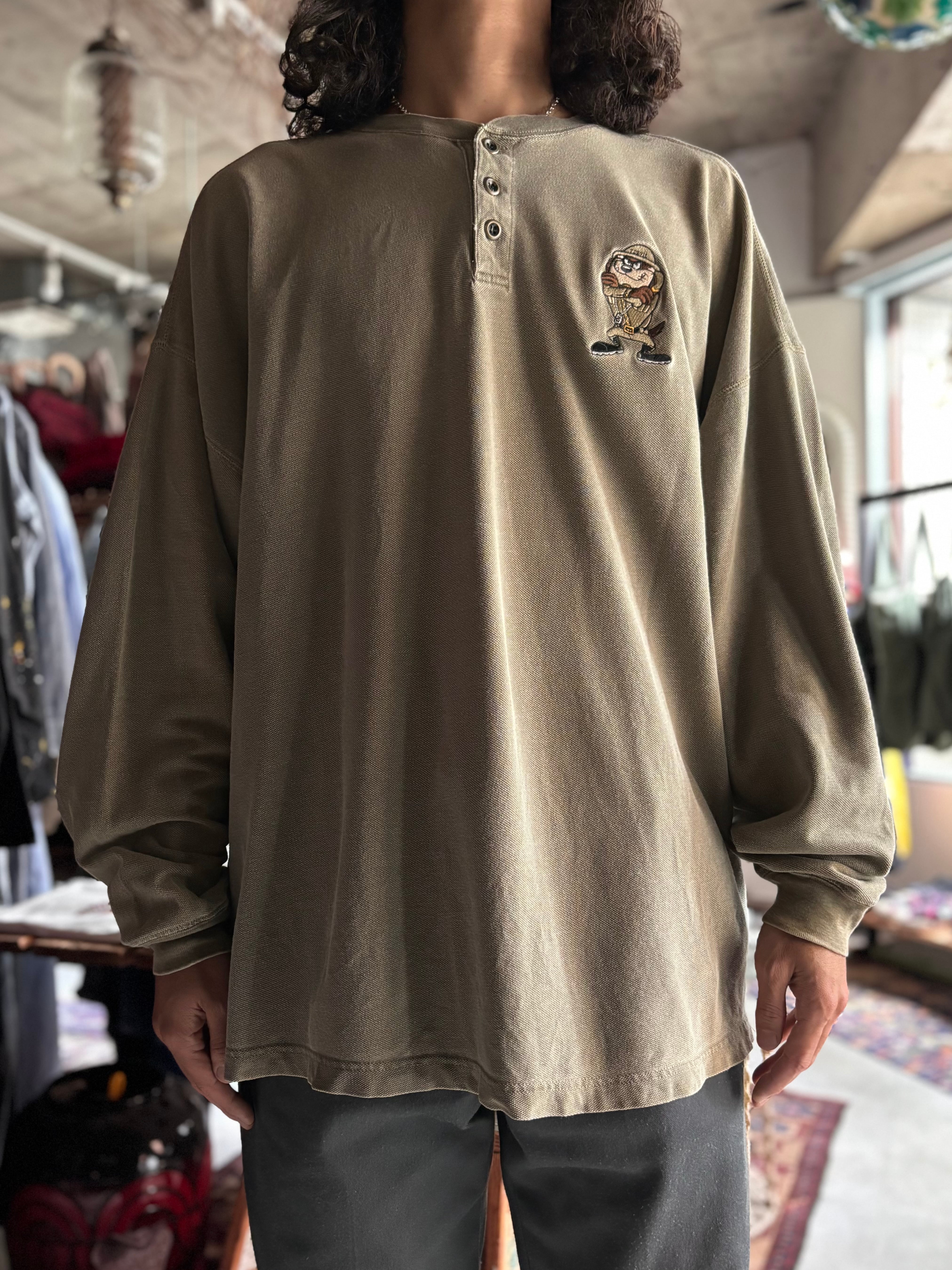 洗い込まれて柔らかくなった鹿子生地。リラックスフィット。タズマニアン・テビルの刺繍入り。褪せたカーキベースに、メタルボタンのヘンリーネックがお洒落感抜群です。