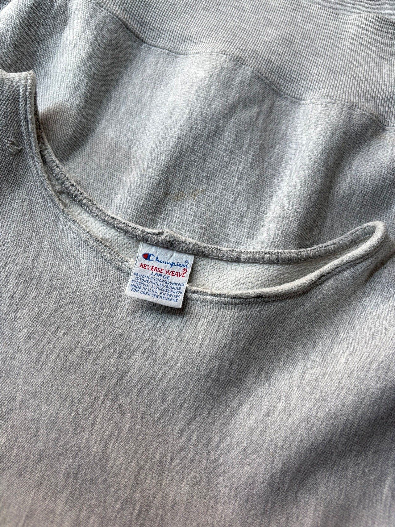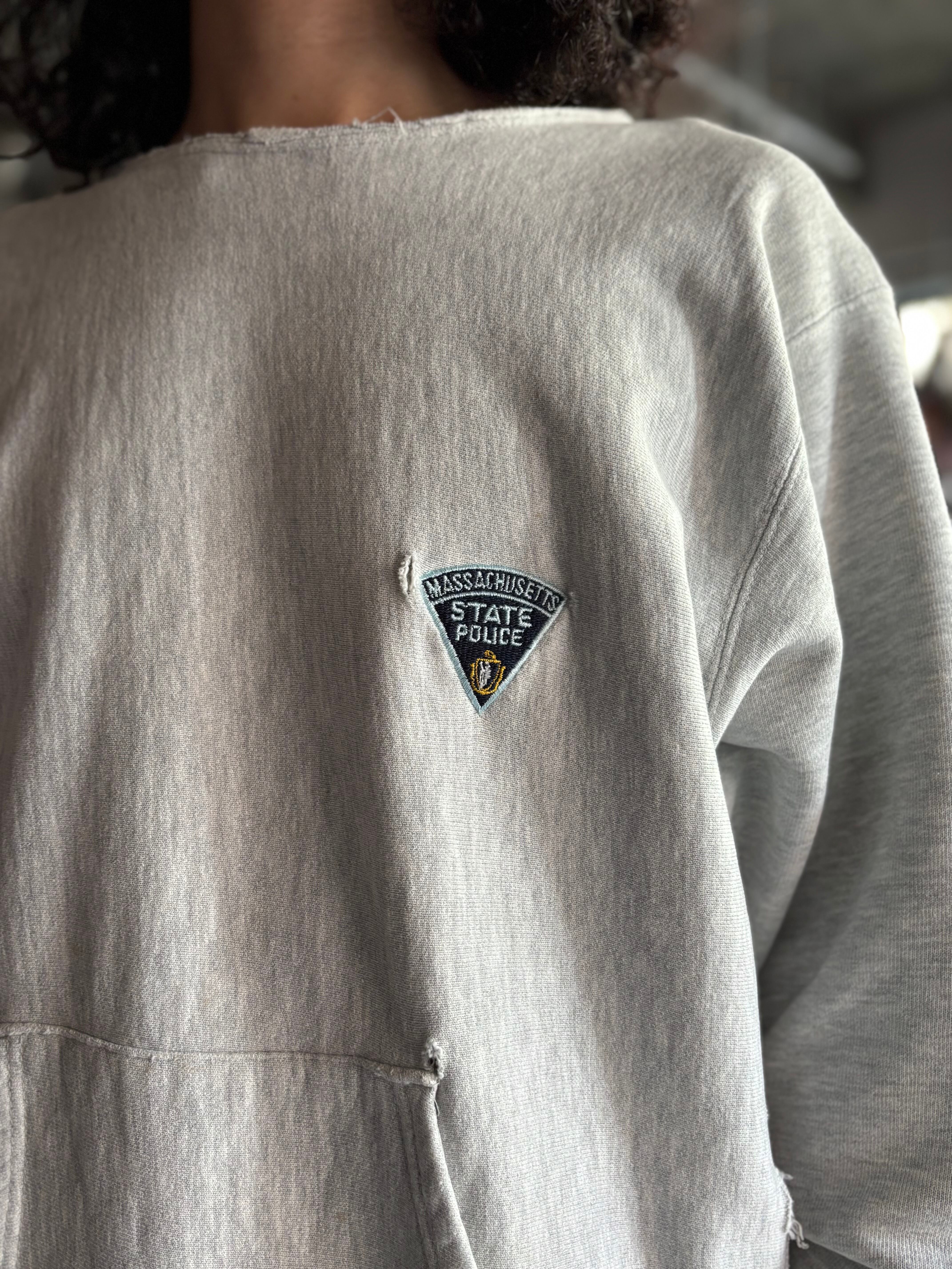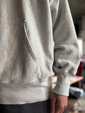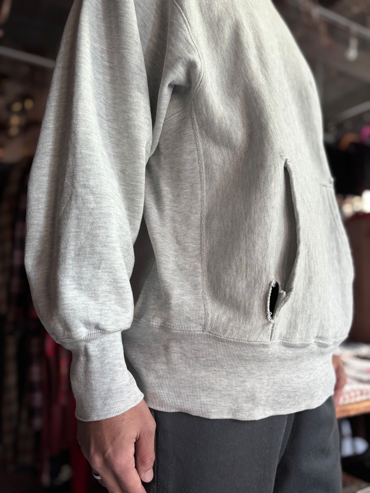 しっかりした厚みのコットン素材。リラックスシルエット。胸に刺繍グラフィック、フードカットオフ仕様。USA製のVINTAGEリバースウィーヴ。