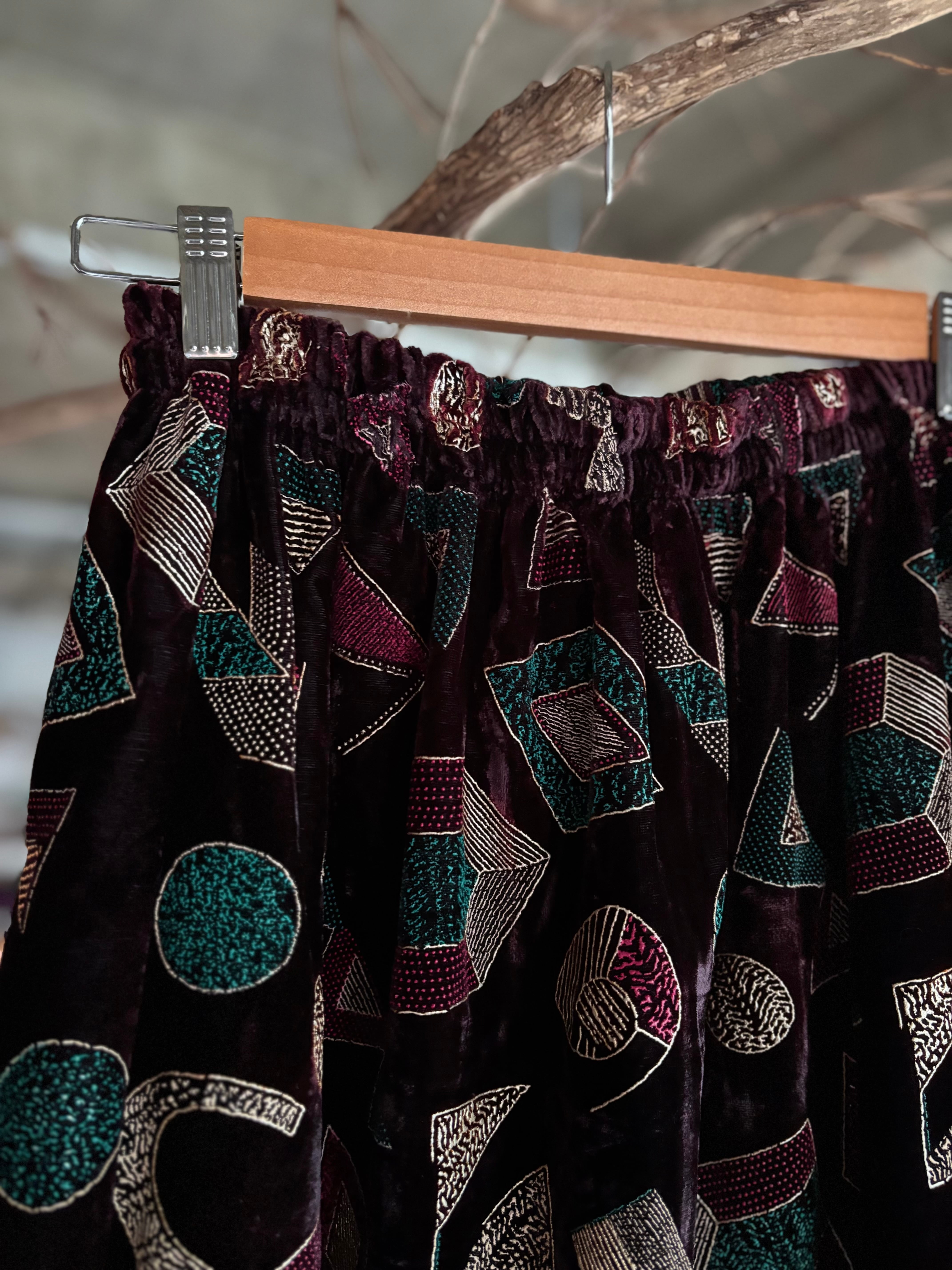 深みのあるバーガンディーベロアにポップな幾何学模様。ライナー付き。USA製。秋冬のお洒落にぴったりのスカートです。