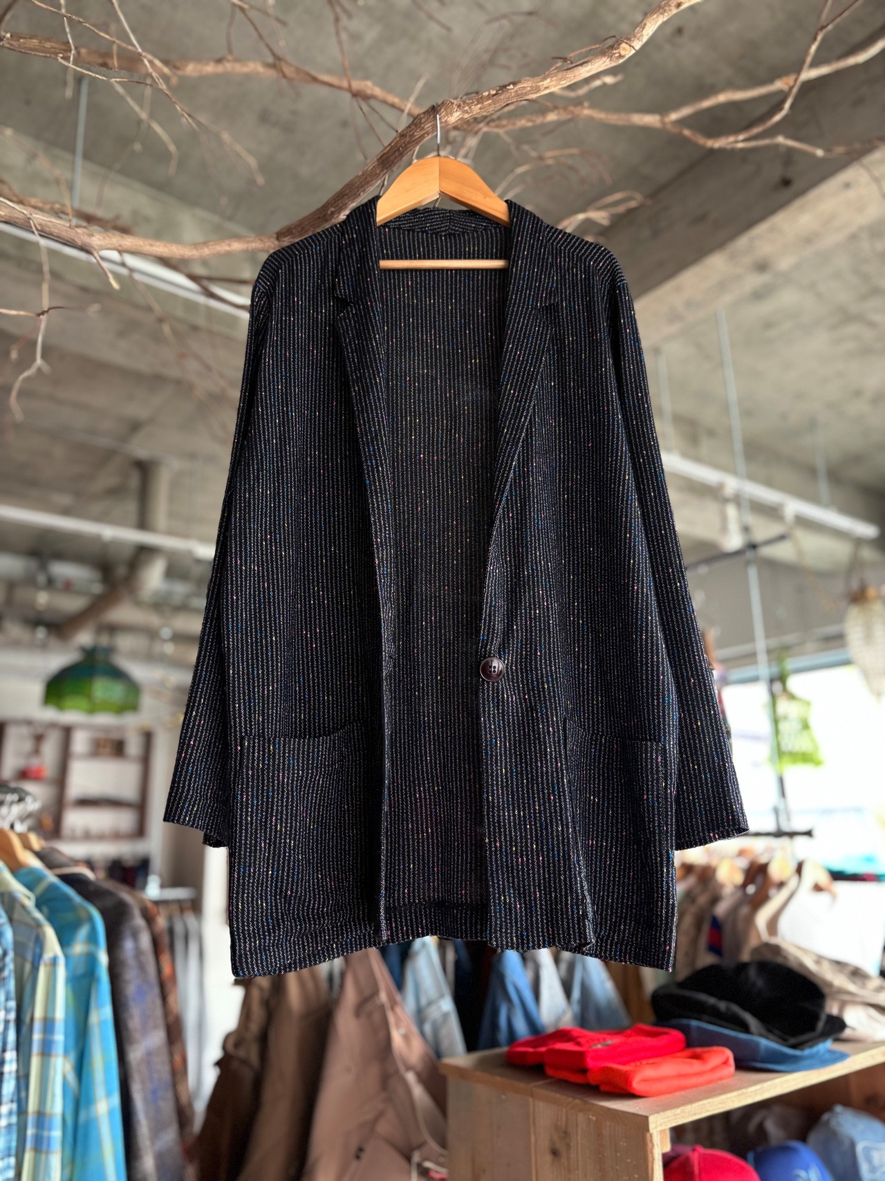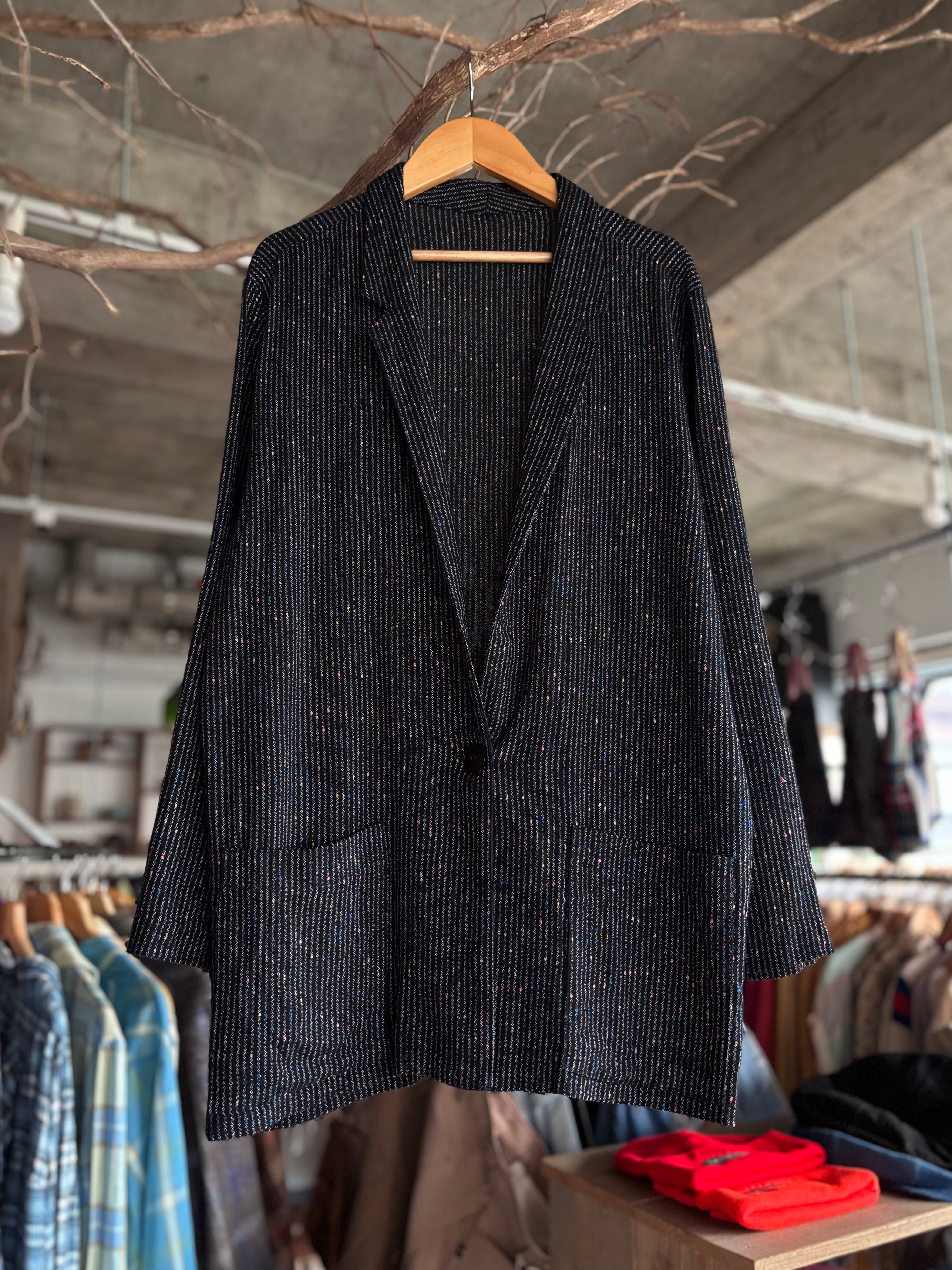細かなカラードットが織り込まれたストライプ地のジャケット。オーセンティックフィット。遠目にはシック、近くで見ると遊び心のある生地感。軽やかな着心地で、シャツのように羽織れるライトアウター。カーディガン代わりのインナー使いにもおすすめです◎
