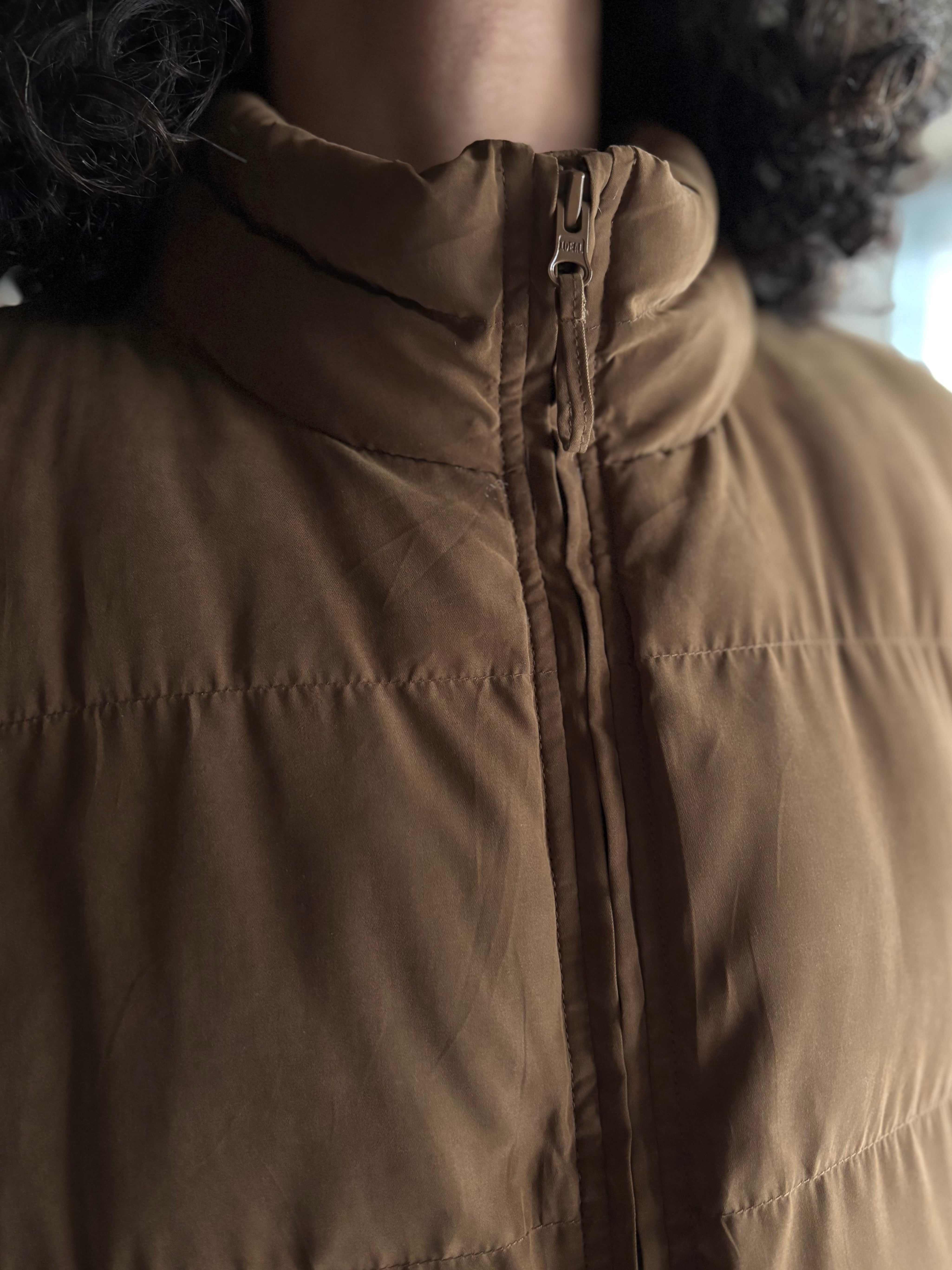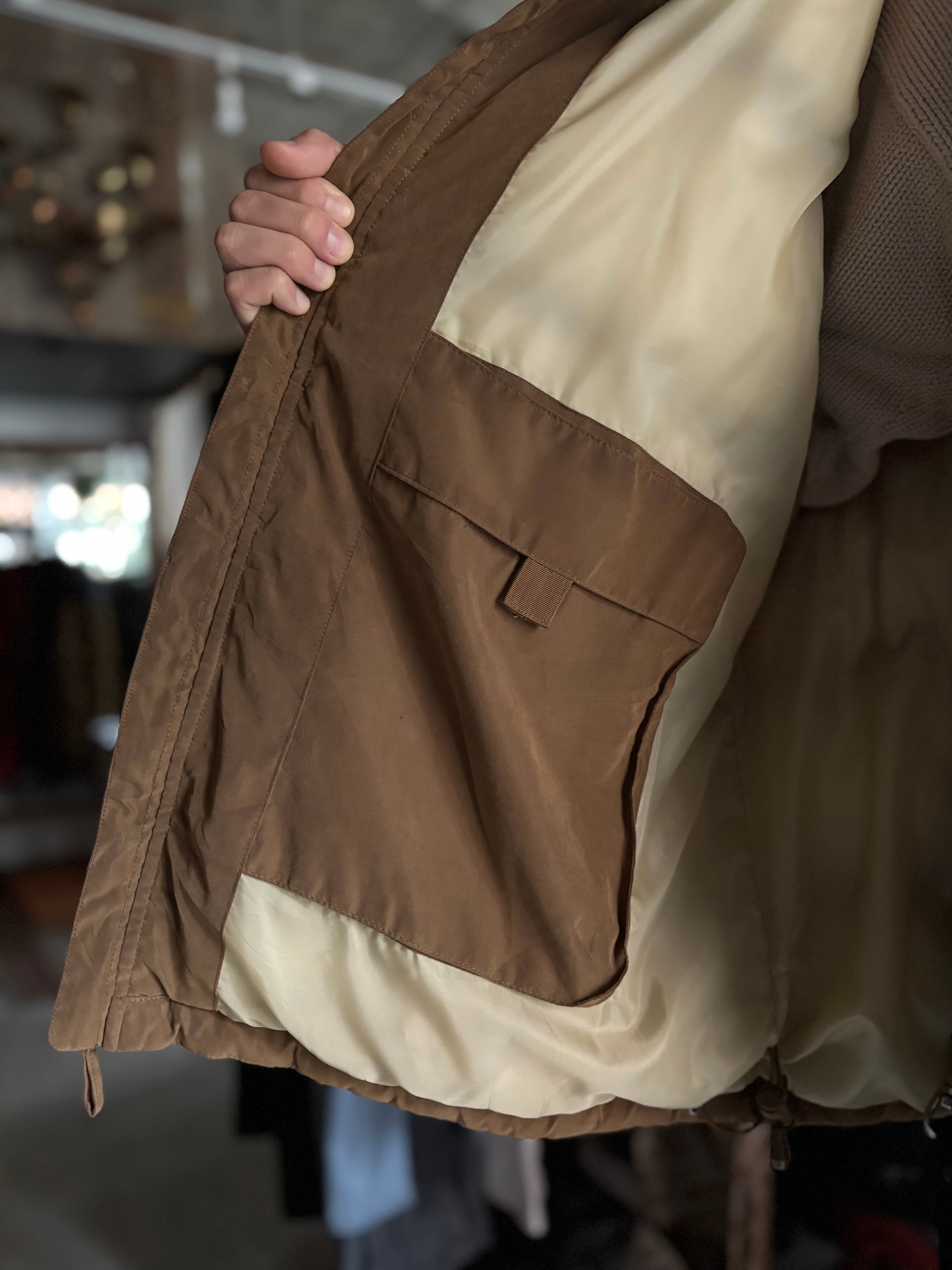 柔らかい肌触りのポリエステルシェル。軽く着心地の良い中綿入り。ルーズフィット。綺麗なコンディション。アウターの上から楽々羽織ることができます。