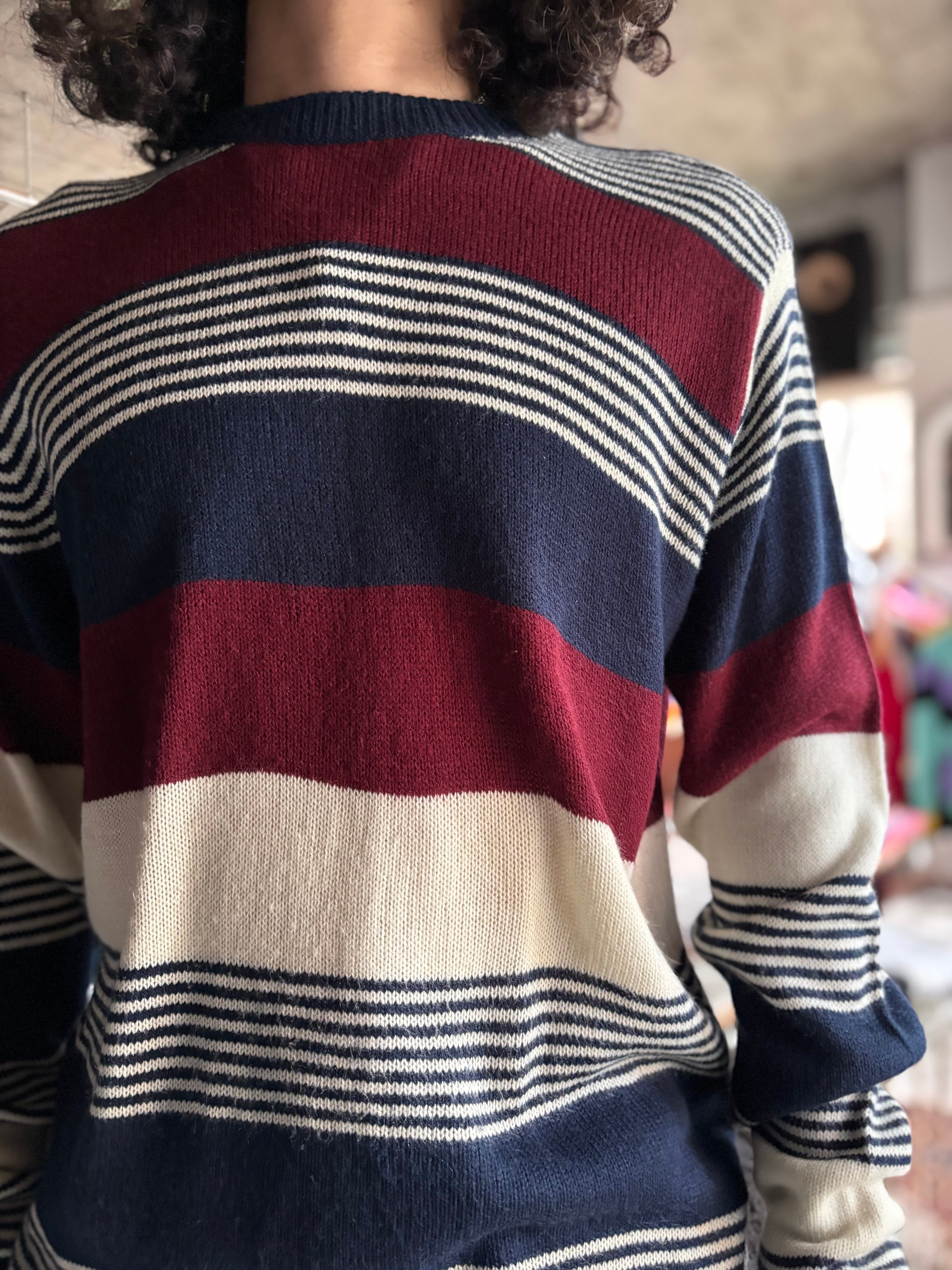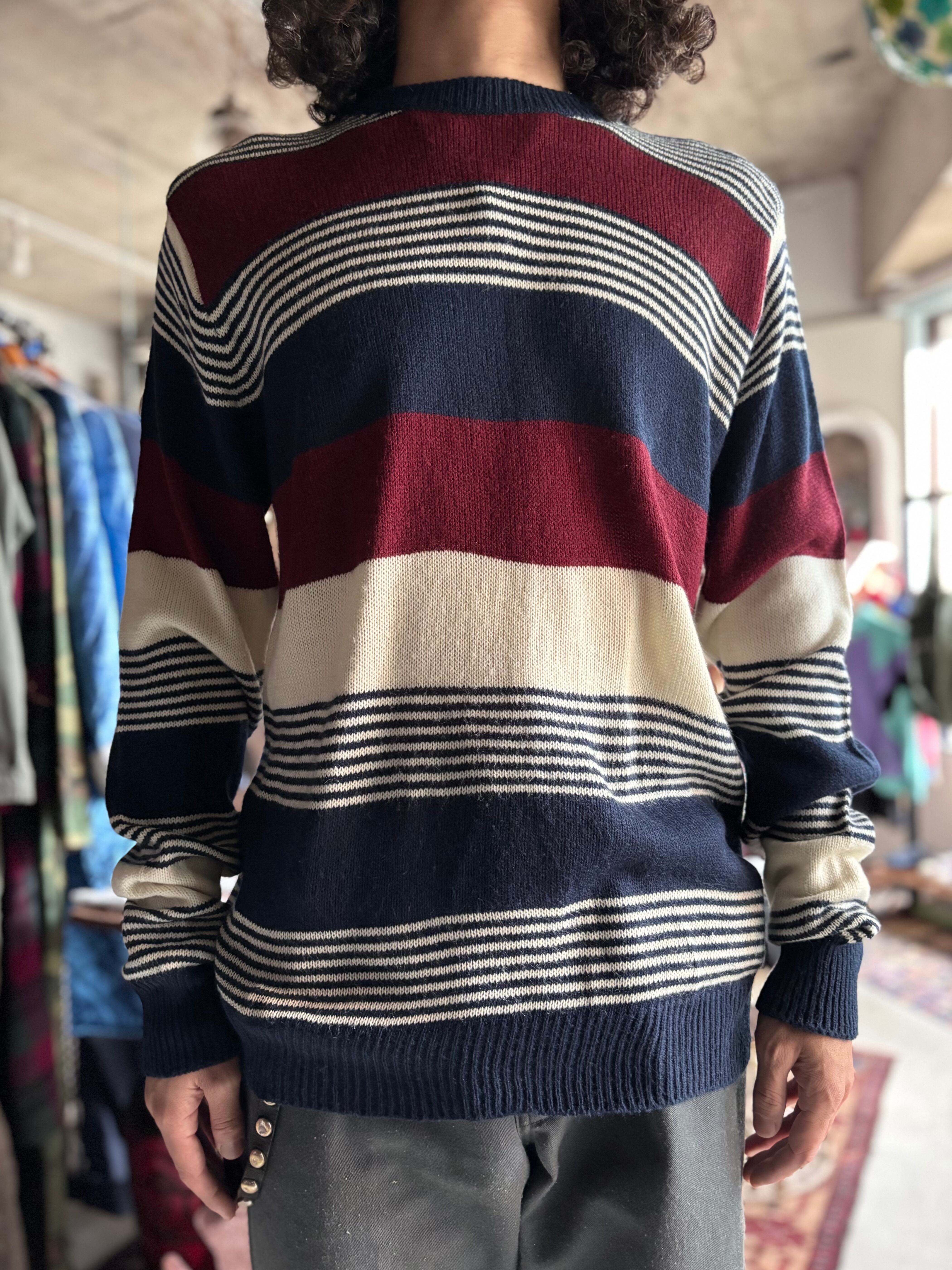 軽い着心地のアクリル素材。オーセンティックフィット。レトロなマルチボーダー。ロンT感覚で着用できる1着です。