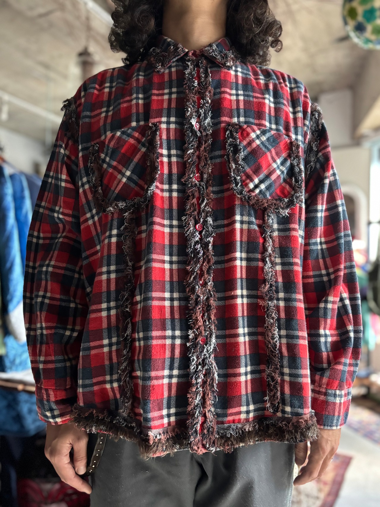 90s~00sのレギュラーシャツにフリンジ加工したテープで装飾カスタムしたモデル。全て、シャツのベースに合わせてデザインを変えている一点ものです。ユニセックスでおすすめです。