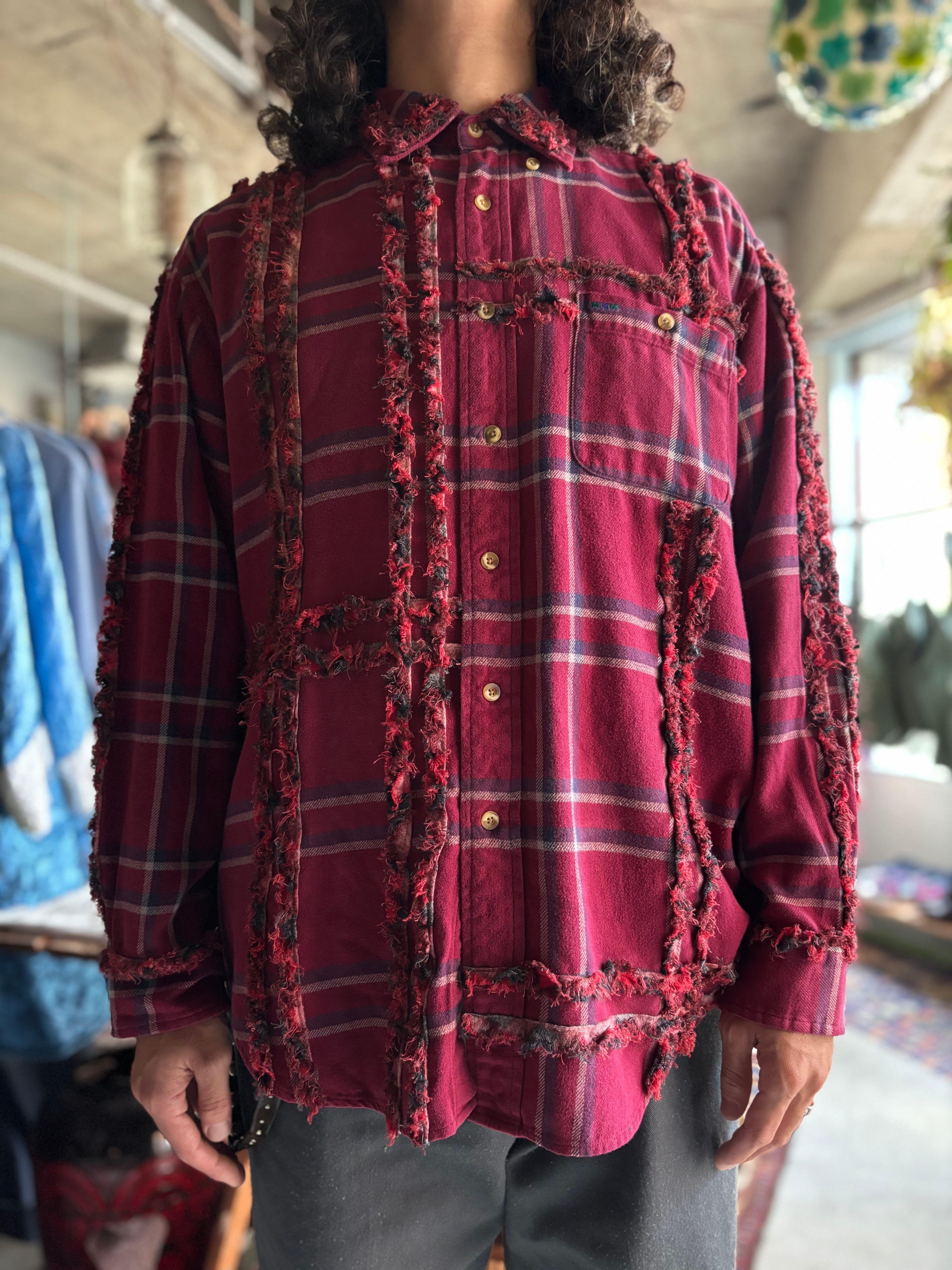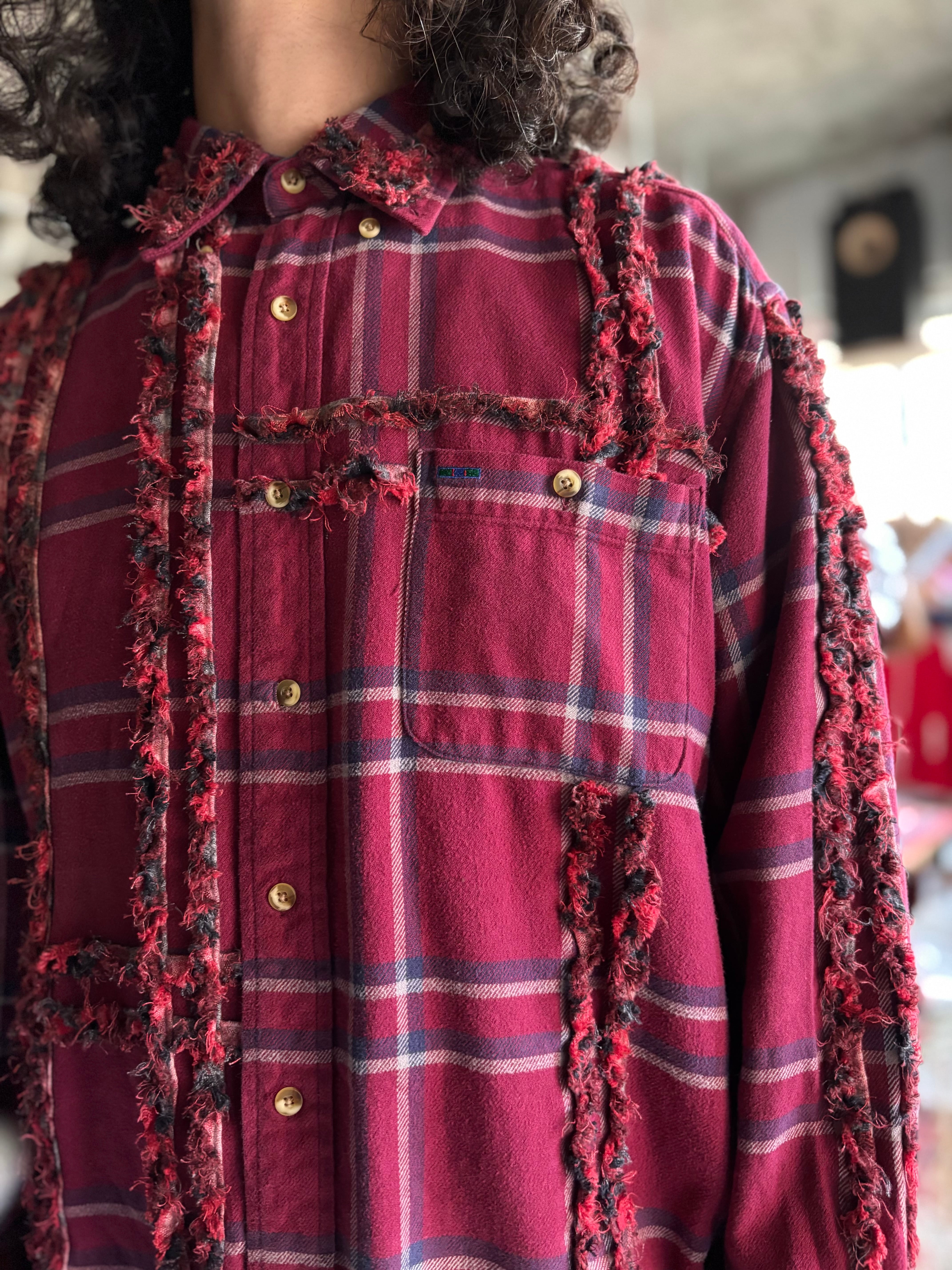 90s~00sのレギュラーシャツにフリンジ加工したテープで装飾カスタムしたモデル。全て、シャツのベースに合わせてデザインを変えている一点ものです。ユニセックスでおすすめです。