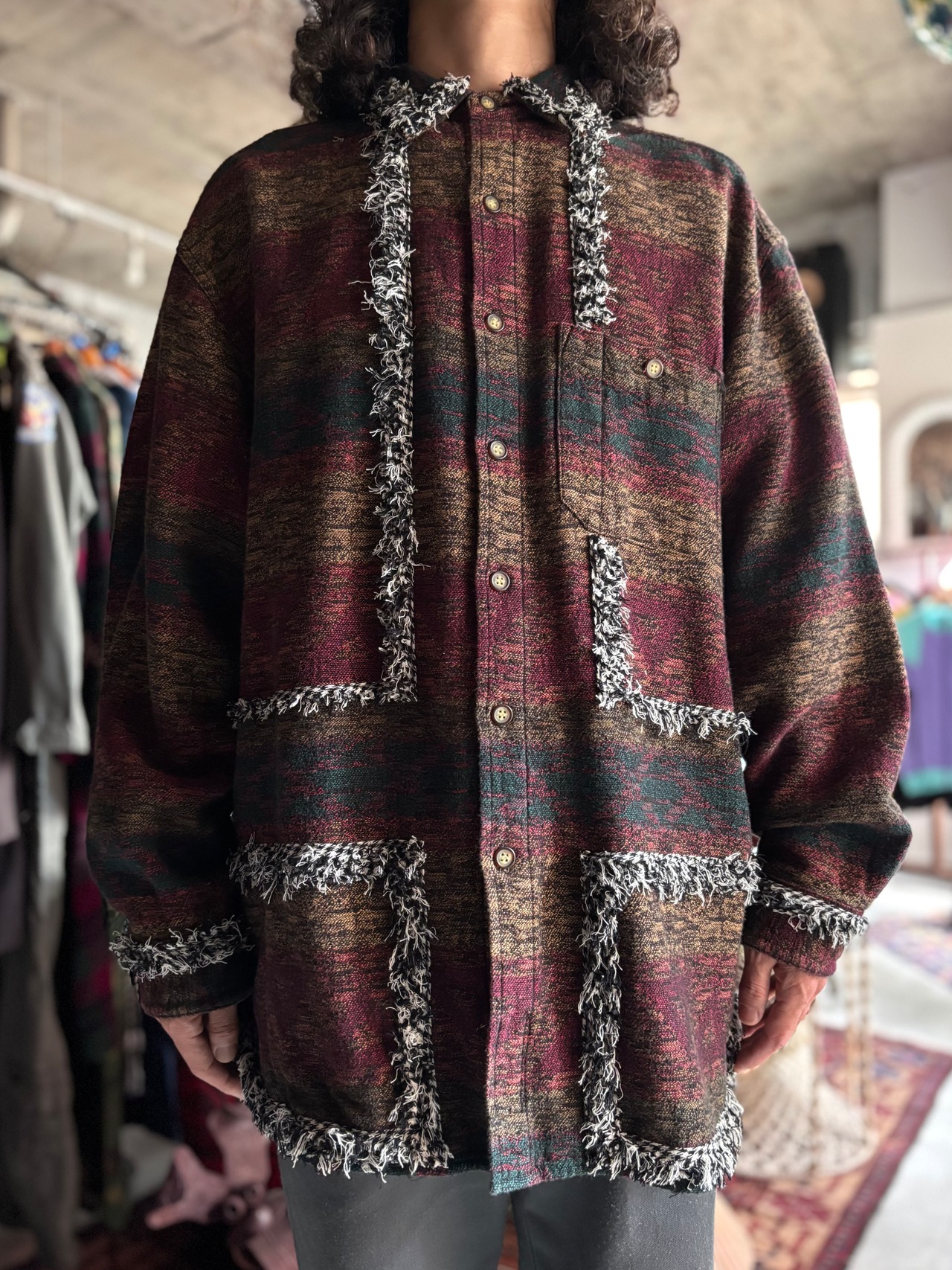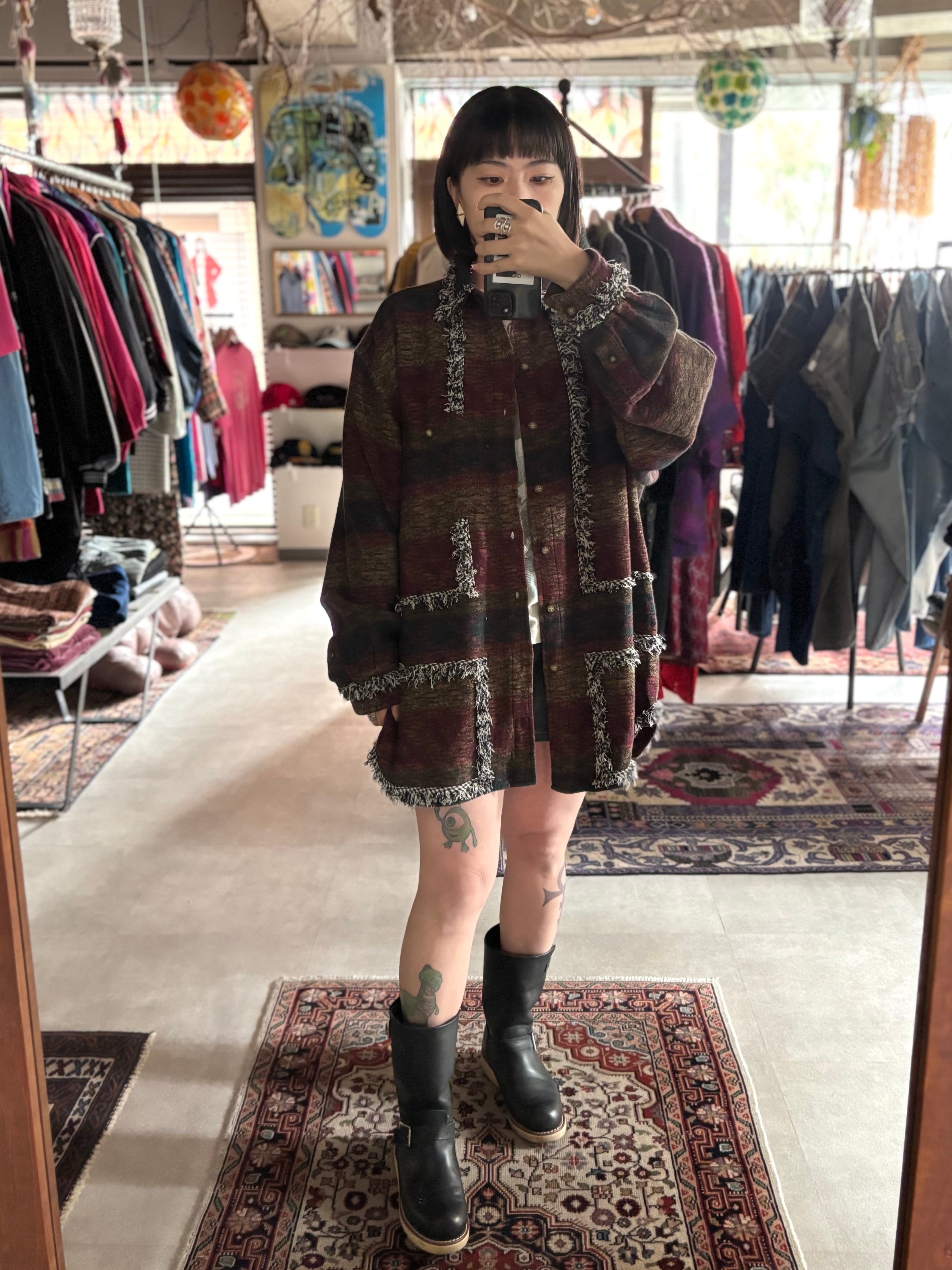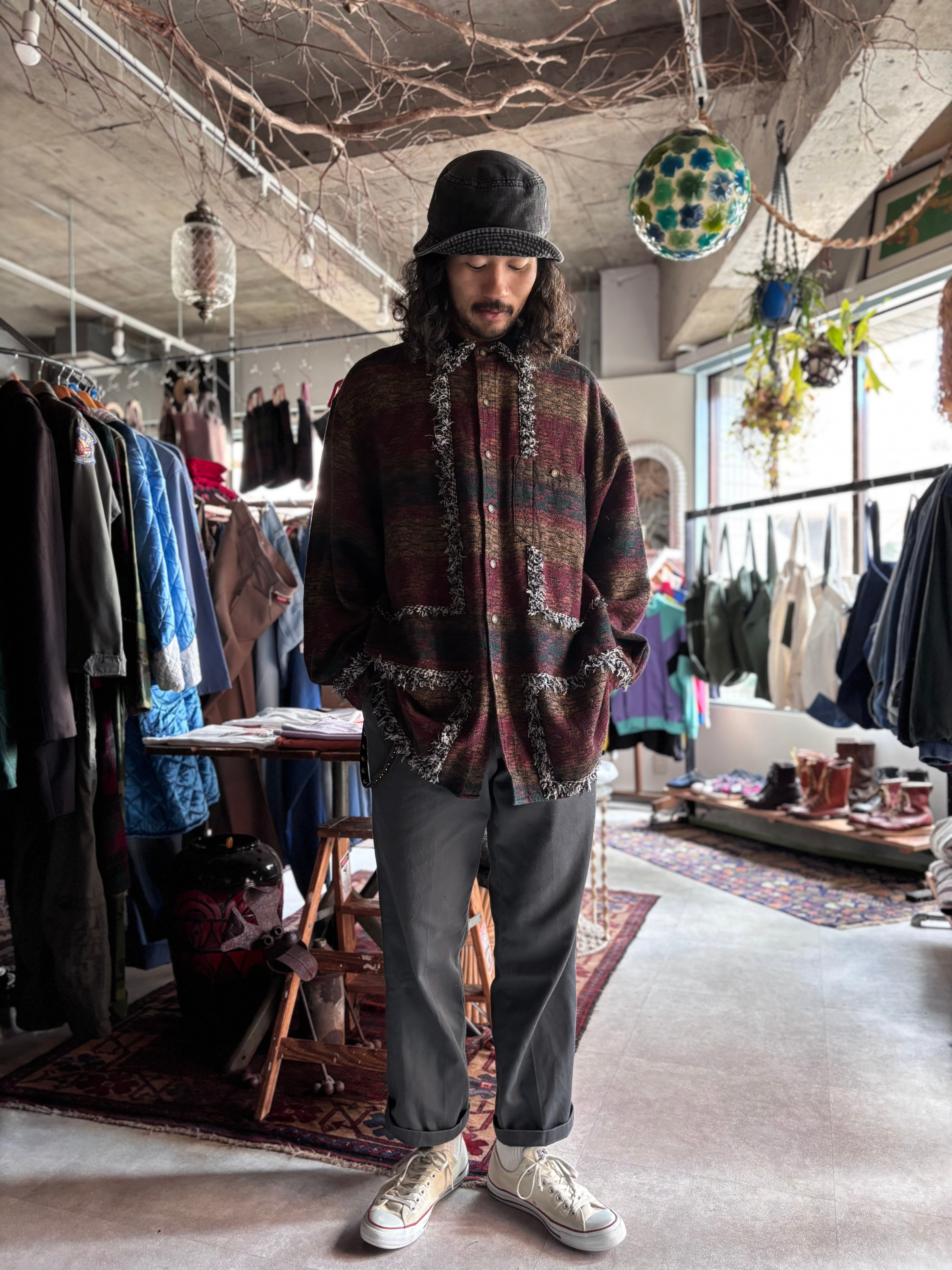 90s~00sのレギュラーシャツにフリンジ加工したテープで装飾カスタムしたモデル。全て、シャツのベースに合わせてデザインを変えている一点ものです。ユニセックスでおすすめです。