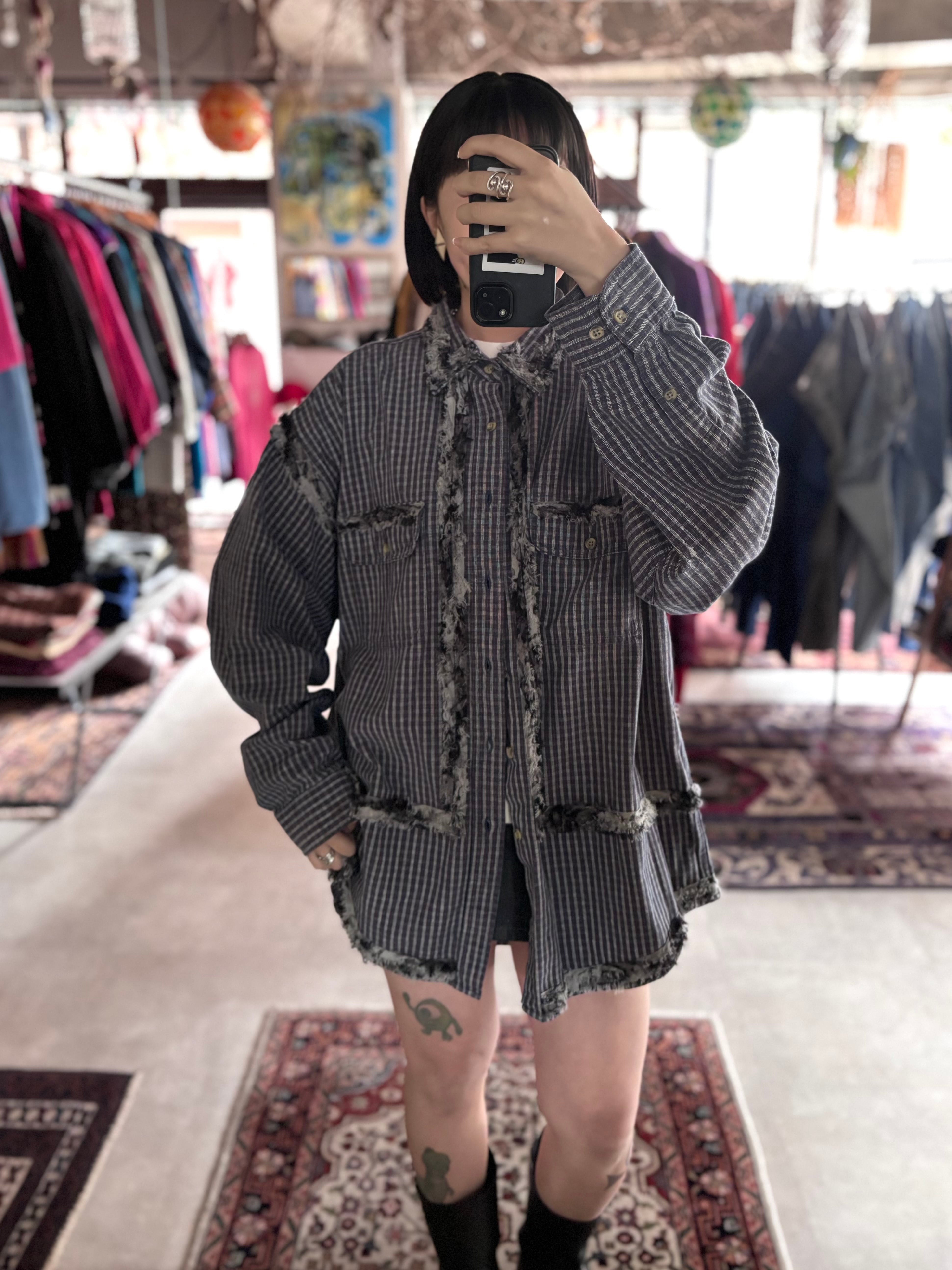 90s~00sのレギュラーシャツにフリンジ加工したテープで装飾カスタムしたモデル。全て、シャツのベースに合わせてデザインを変えている一点ものです。ユニセックスでおすすめです。