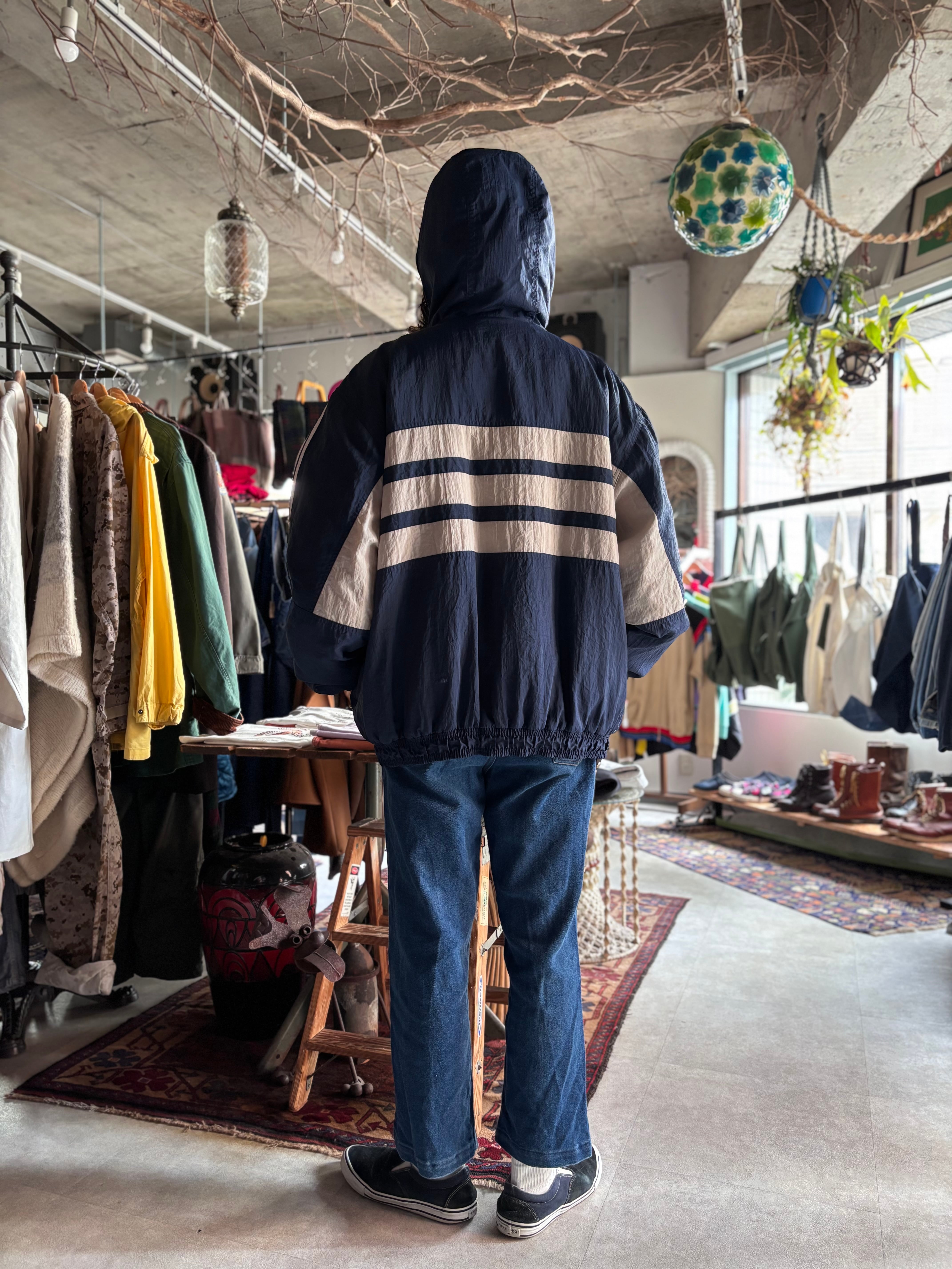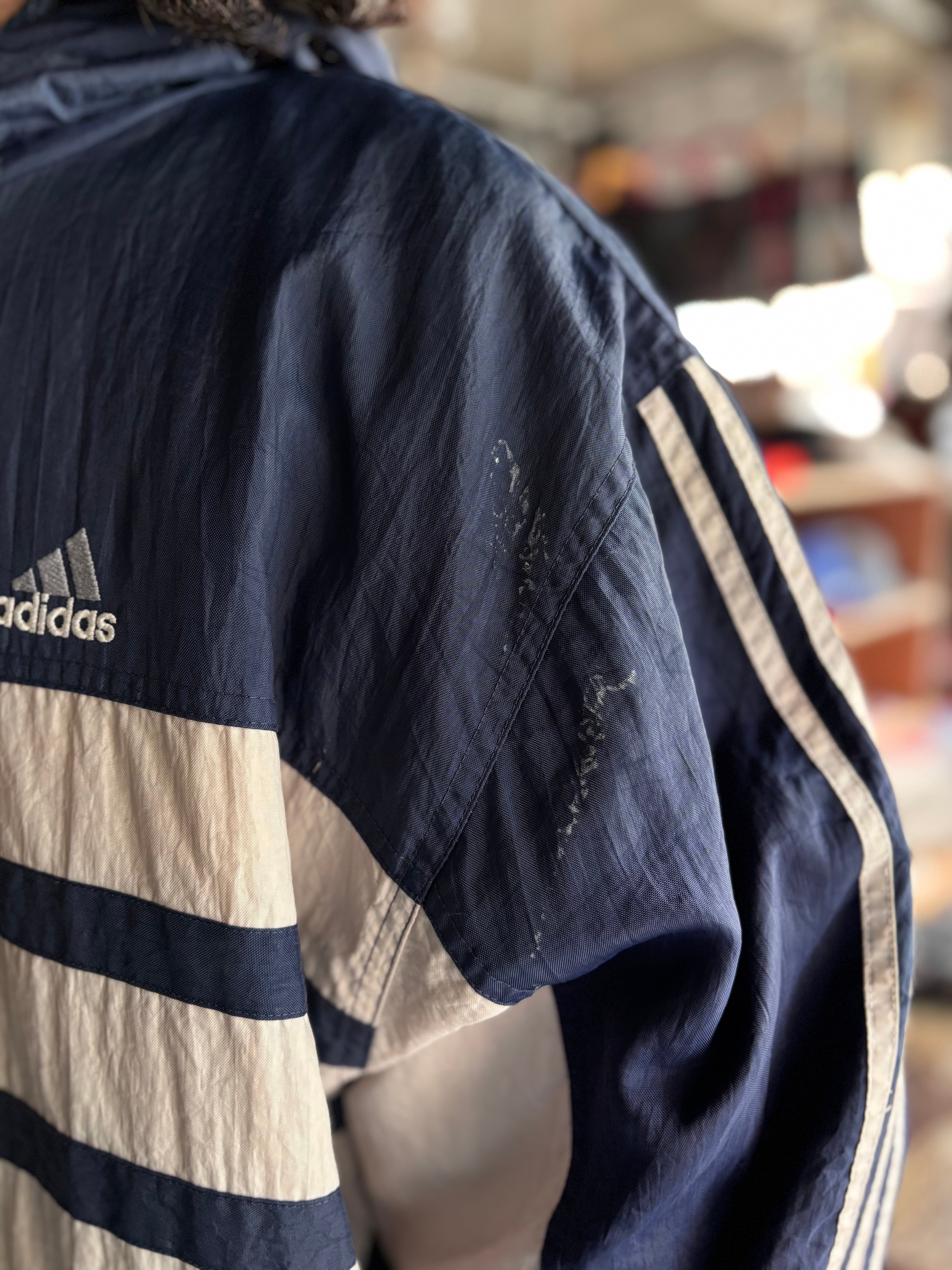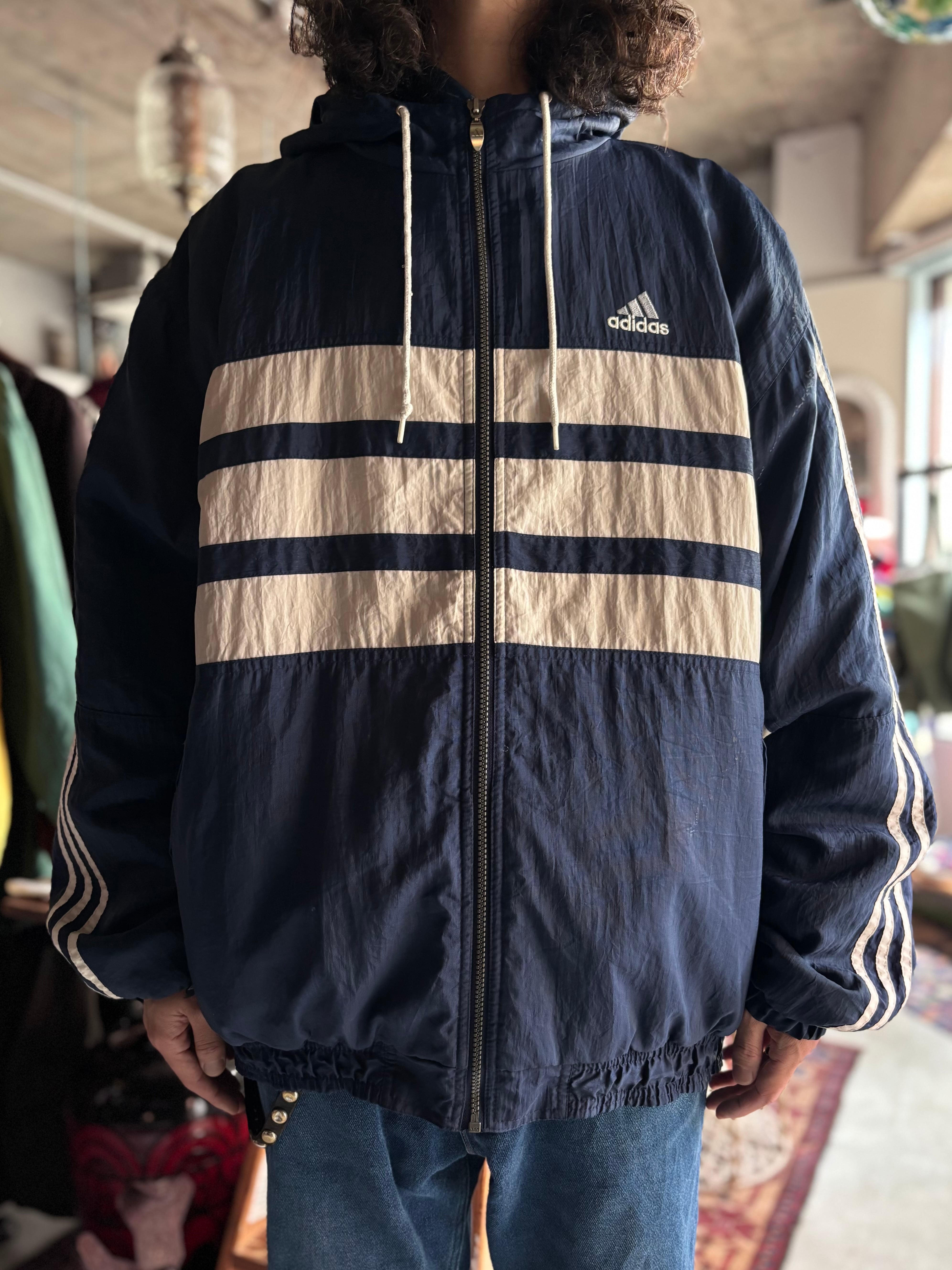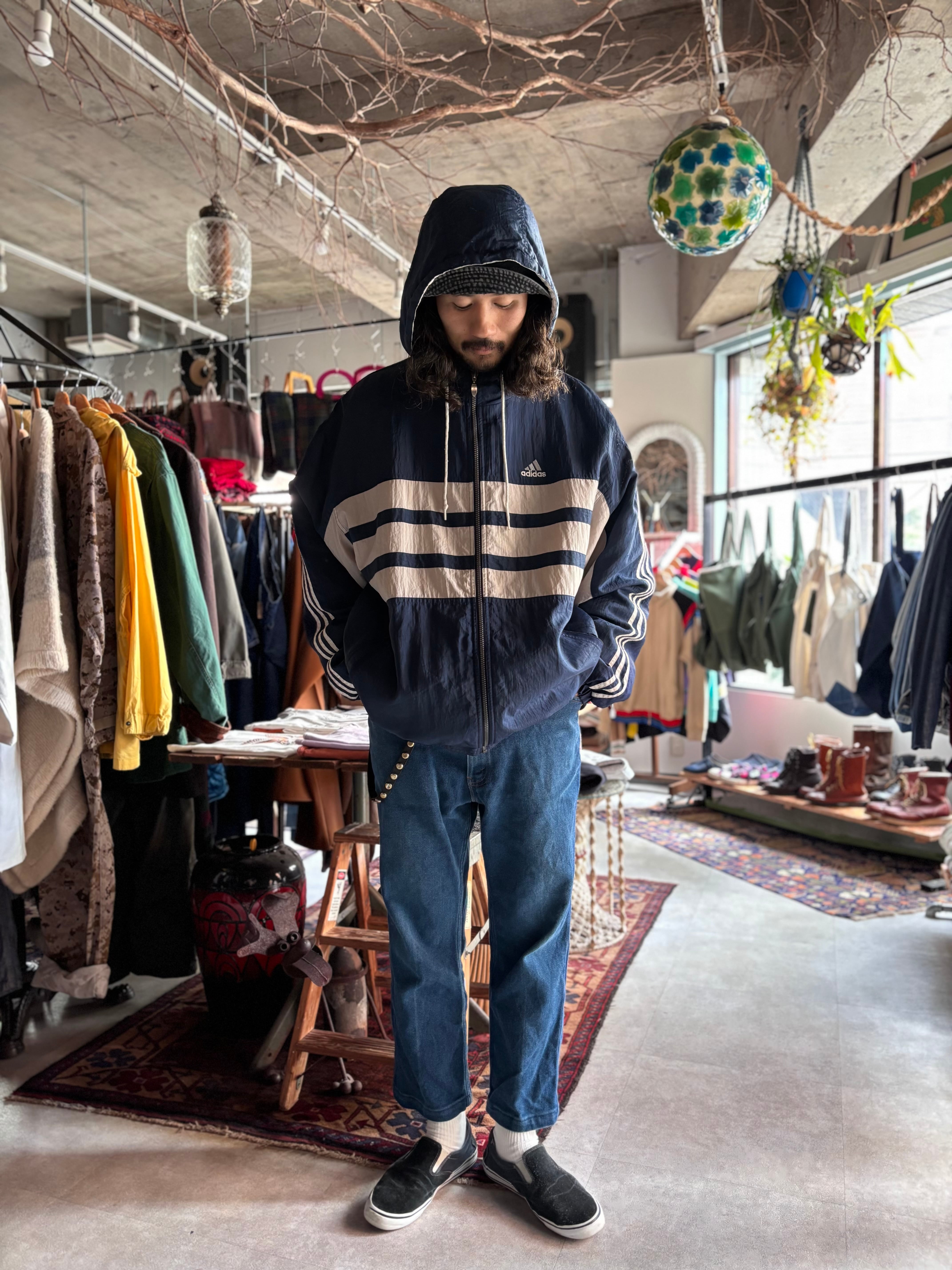 シワ感のあるナイロン素材に、内側はキルティングライナー。リラックスフィット。帽子の上から被ることができる大きめフード。万国旗タグが付くOLDアディダス。