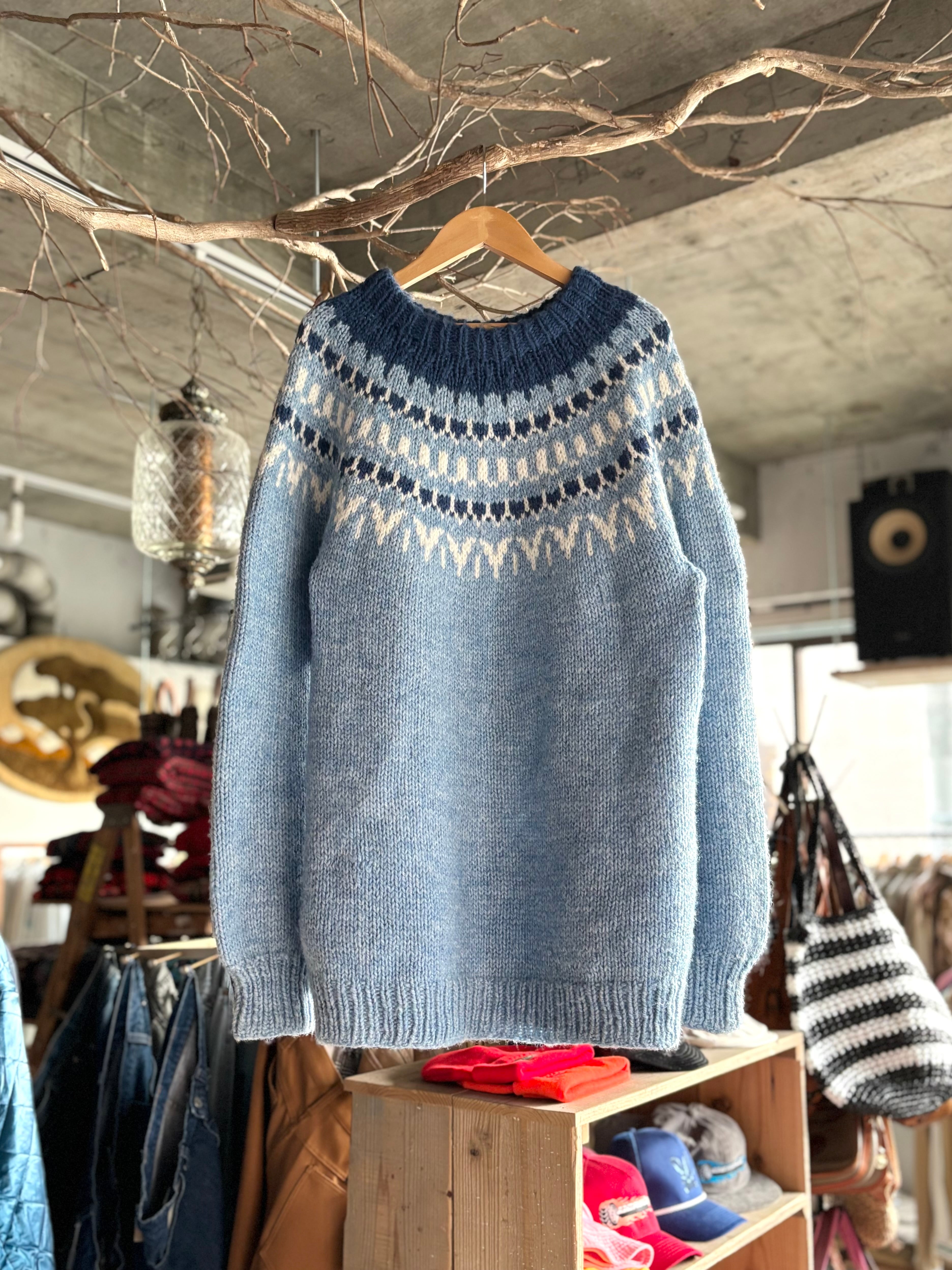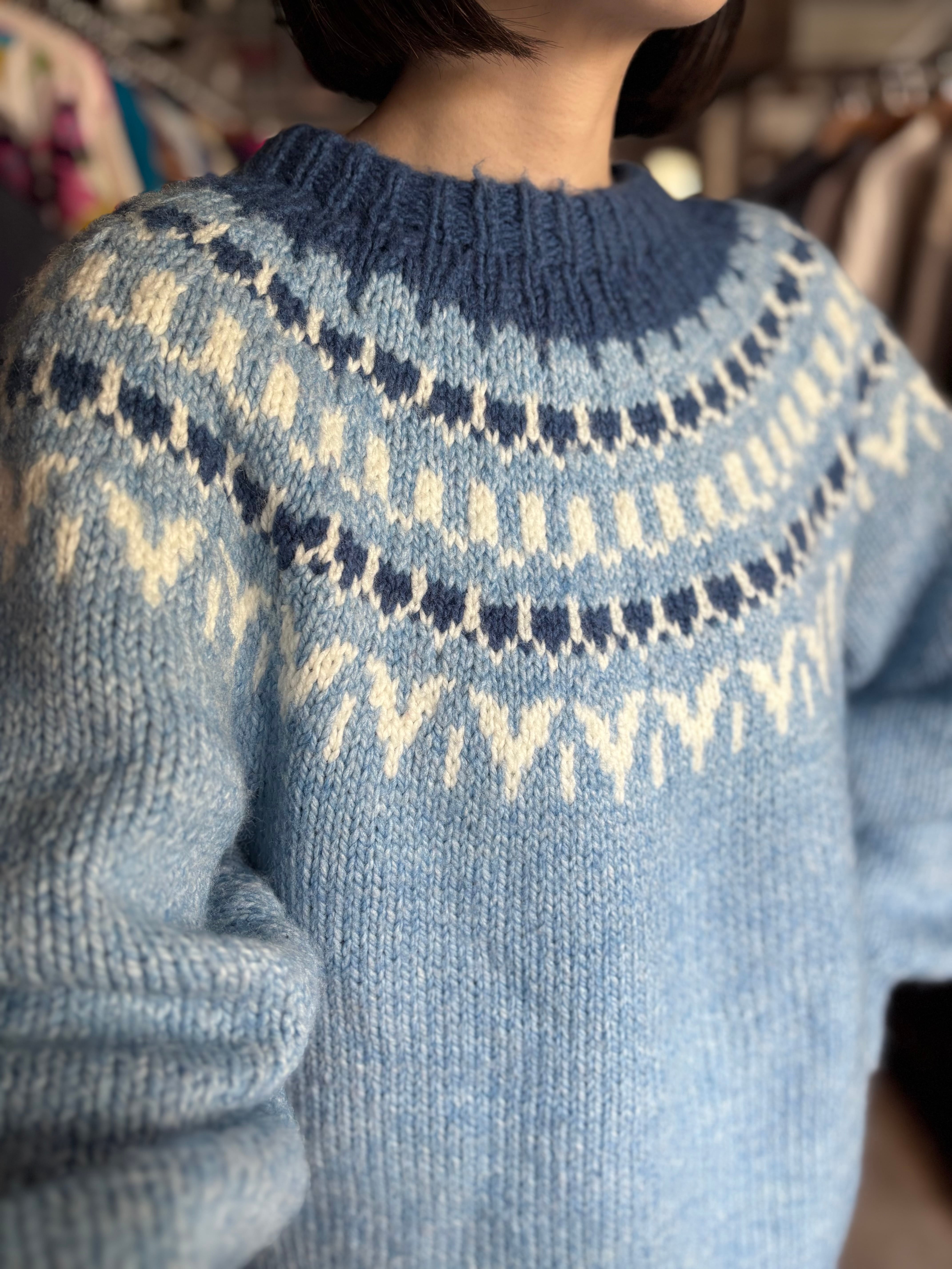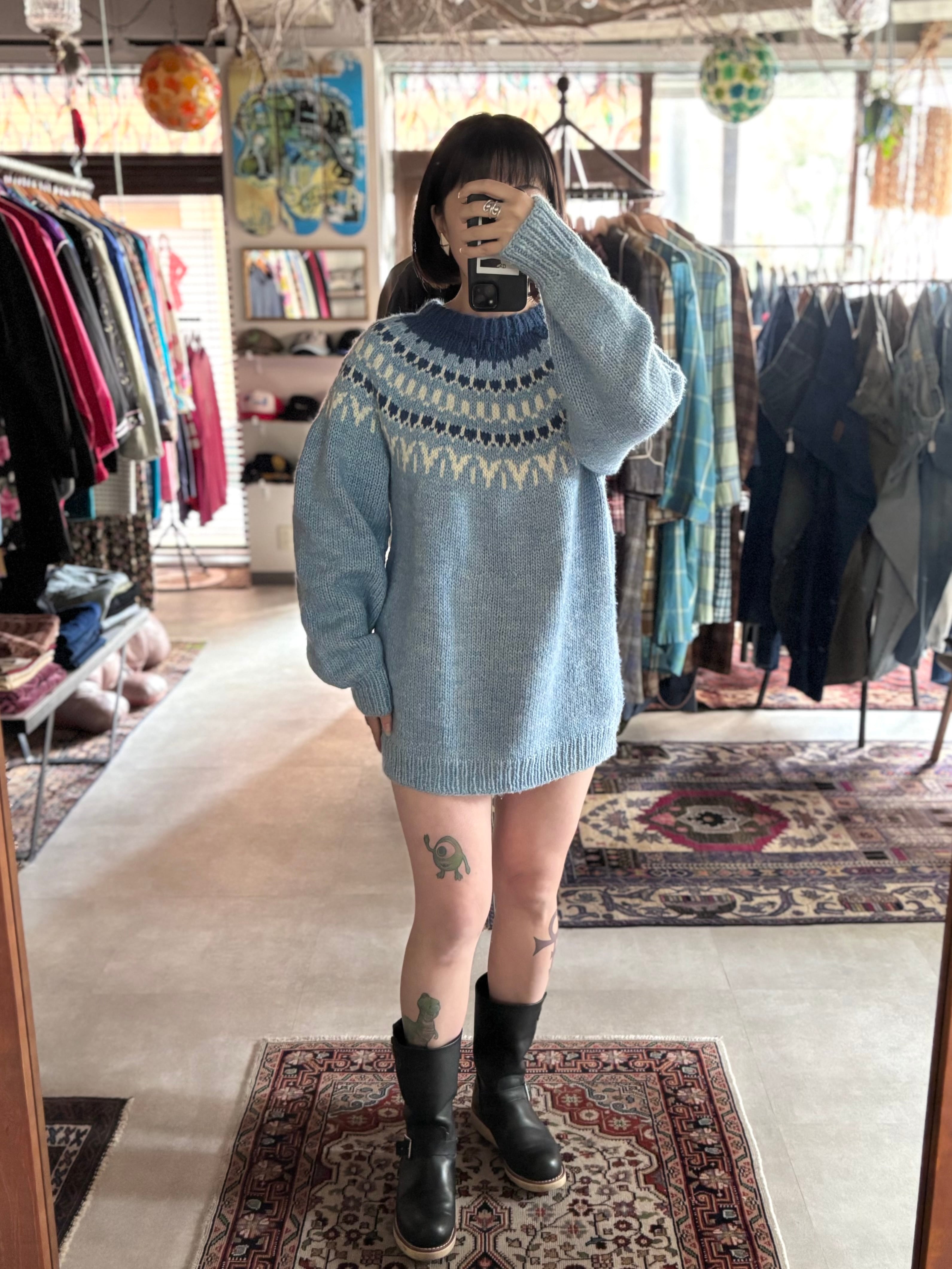 おそらくアクリル×ウール混紡のしっかりと厚みのあるノルディックニット。リラックスフィット。着用時のチクチク感少なめ。淡いブルー・ホワイト・ネイビーのベーシックな配色と、たっぷりとしたアーム。ショートパンツやミニスカートを合わせてワンピースのようにご着用いただいても可愛いです。