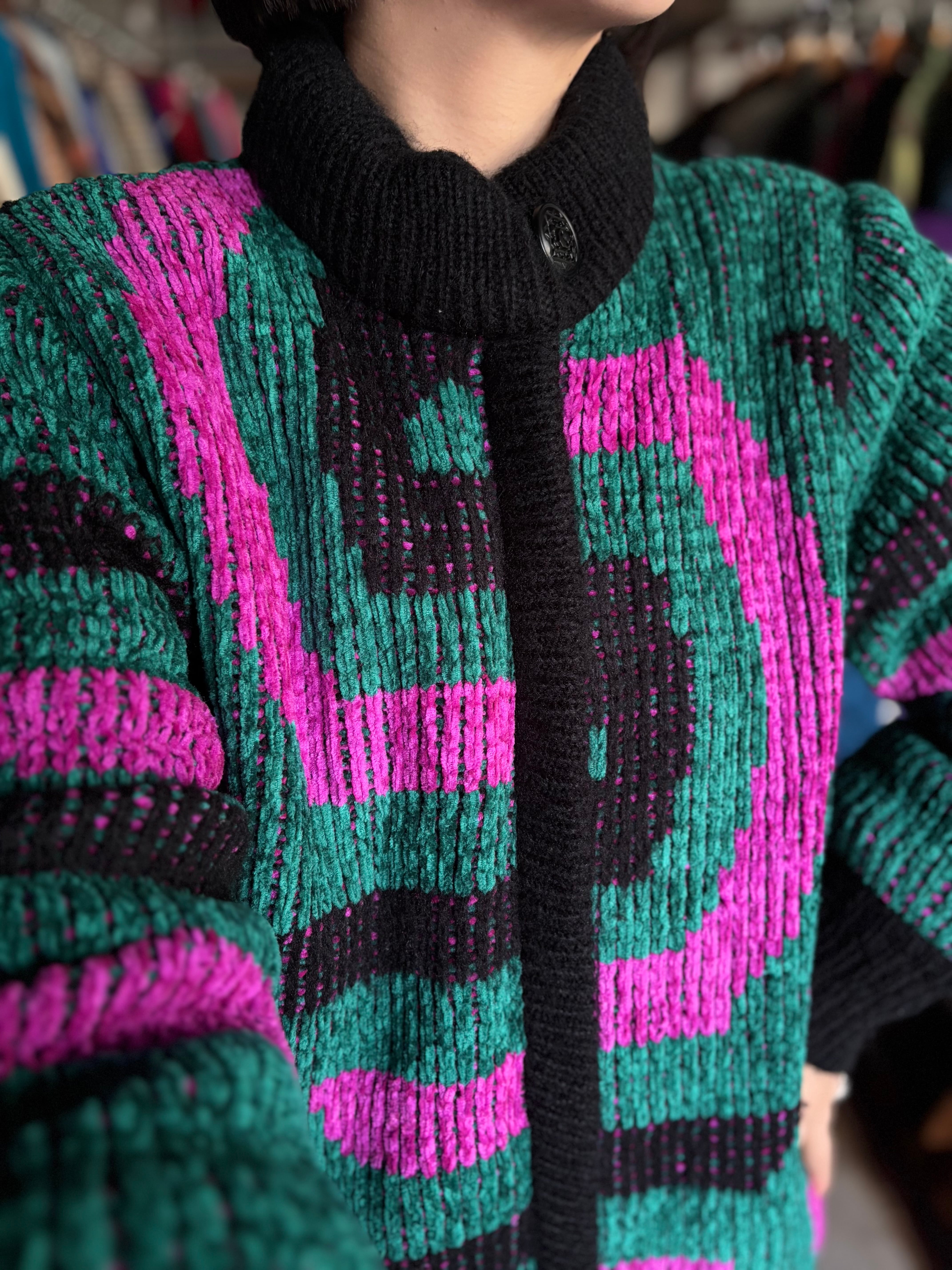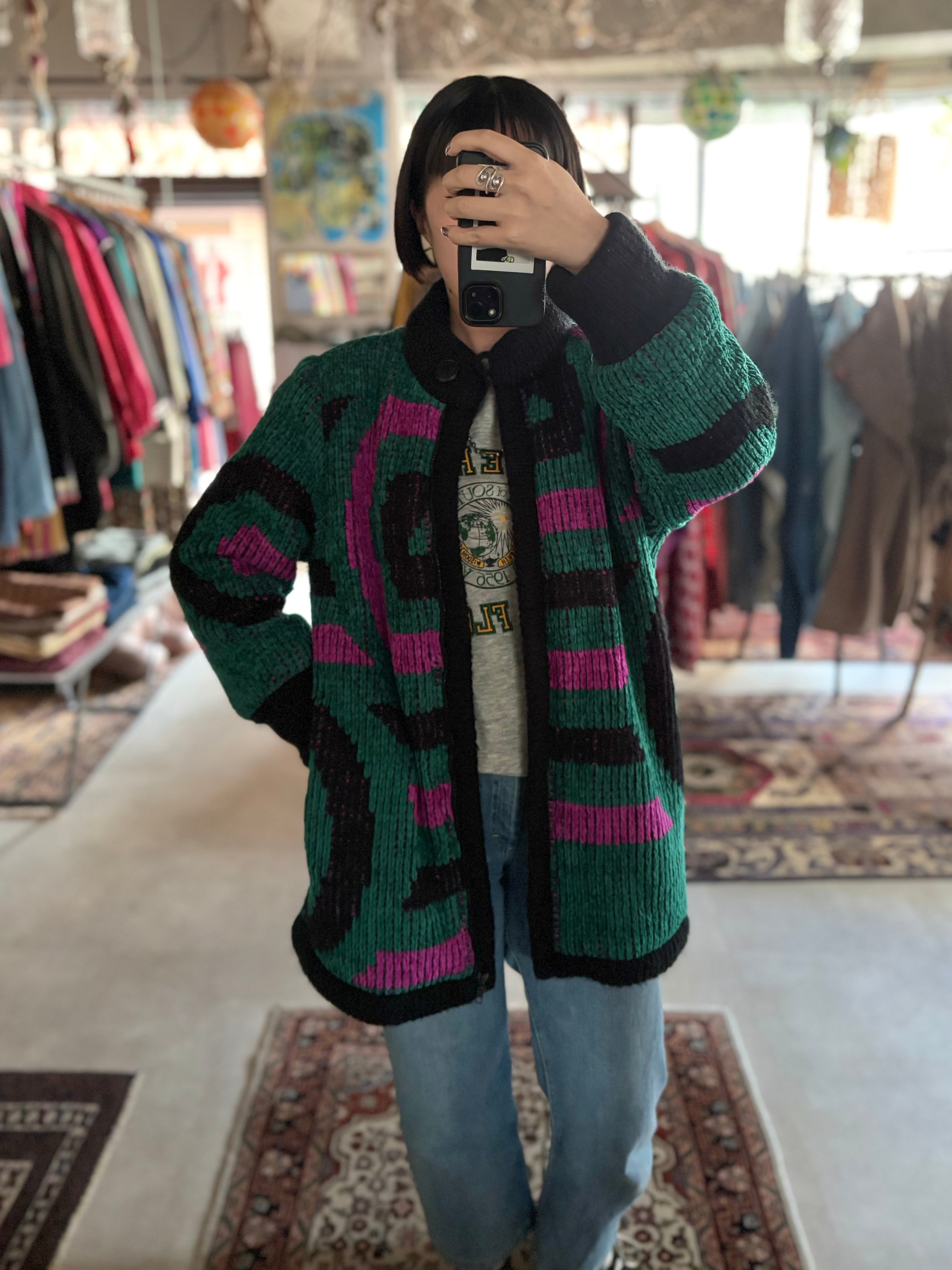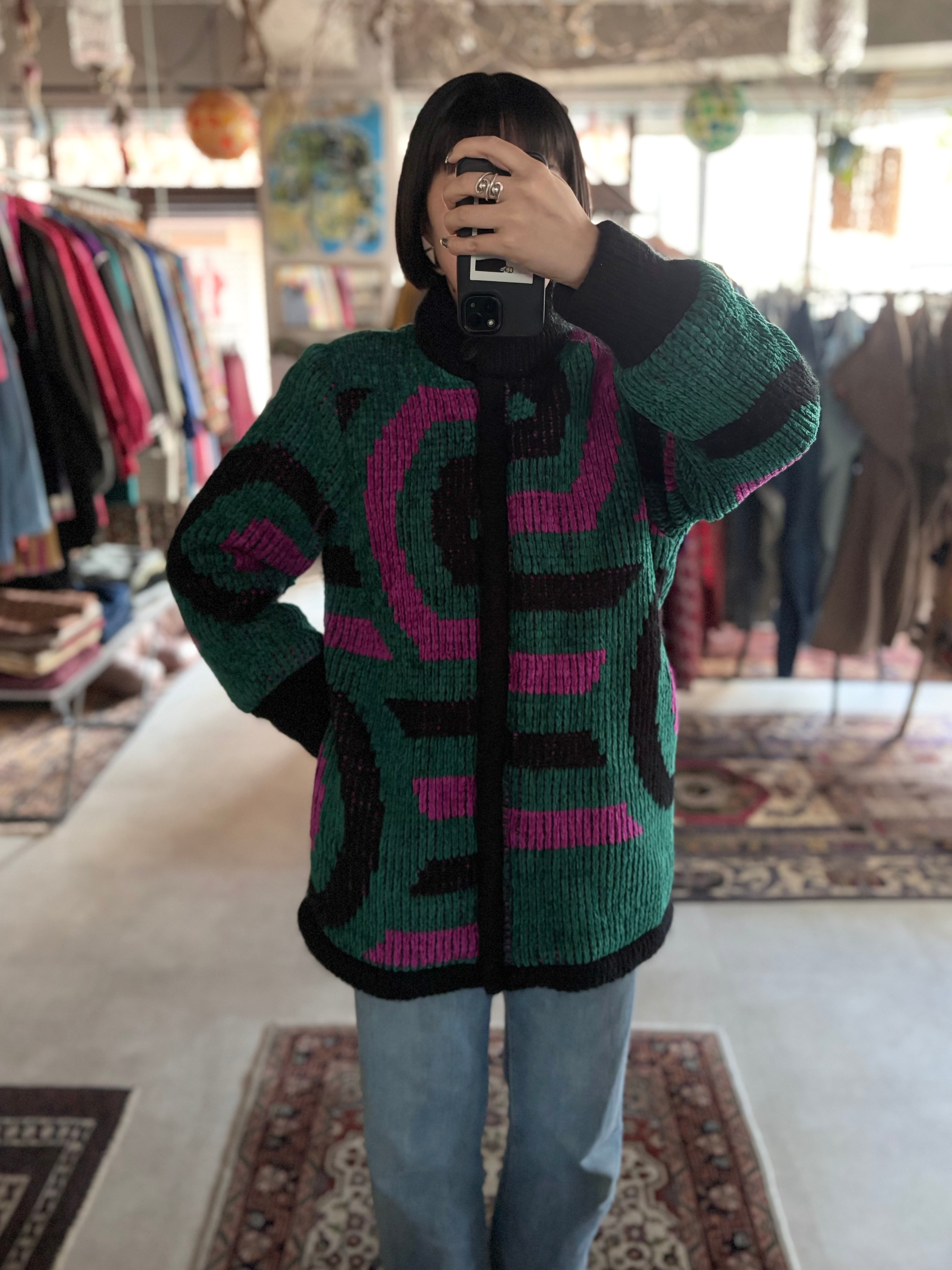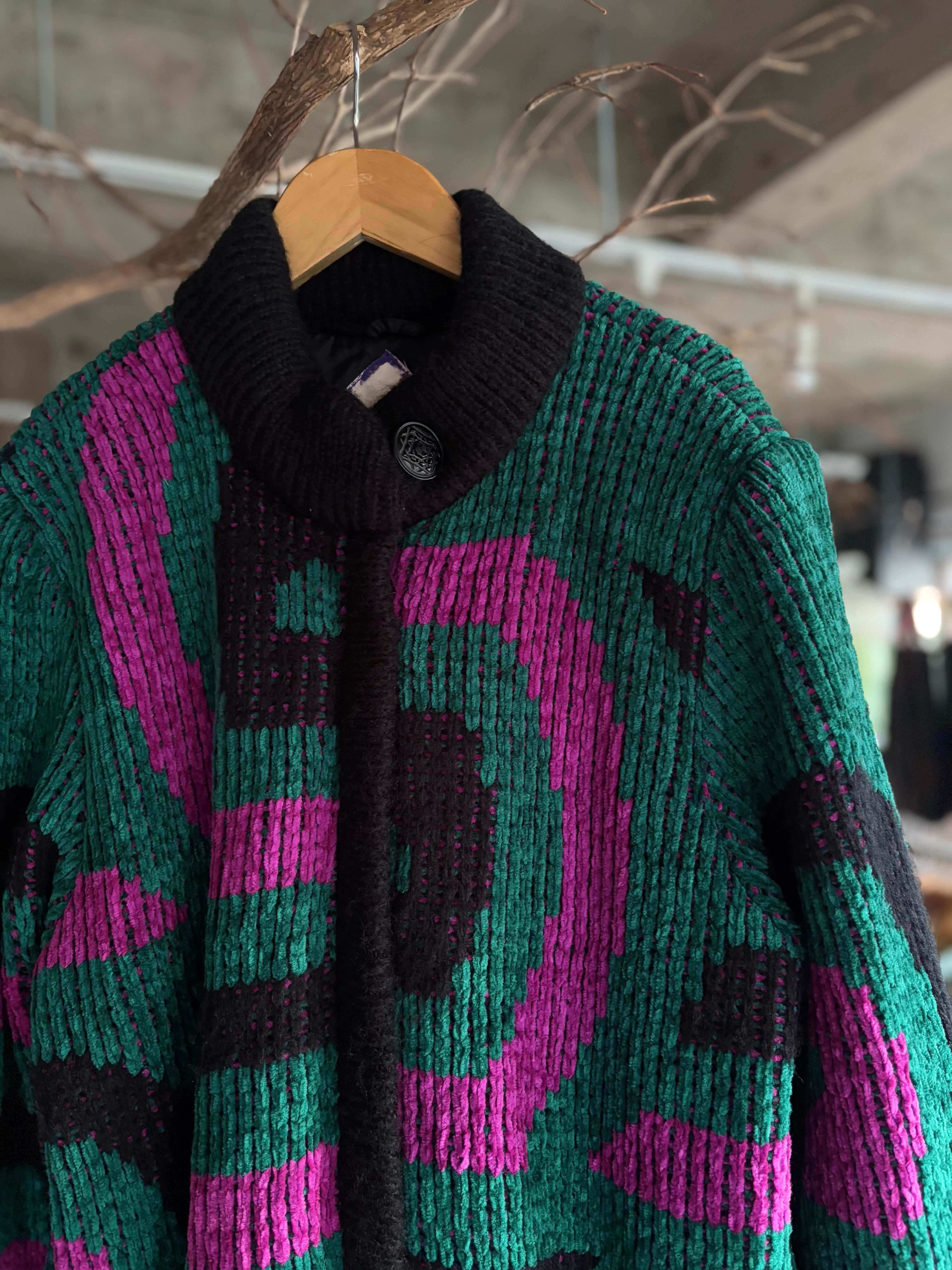 グリーン×マゼンタ×ブラックのサイケデリックな配色と、抽象的なパターンが印象的なニットコート。フロントはネック部分に大ぶりループボタンが付くフルジップ仕様。ポケット付き。内側はナイロンライニングが付いています。80年代らしいグラフィックが魅力のニットアウターです。