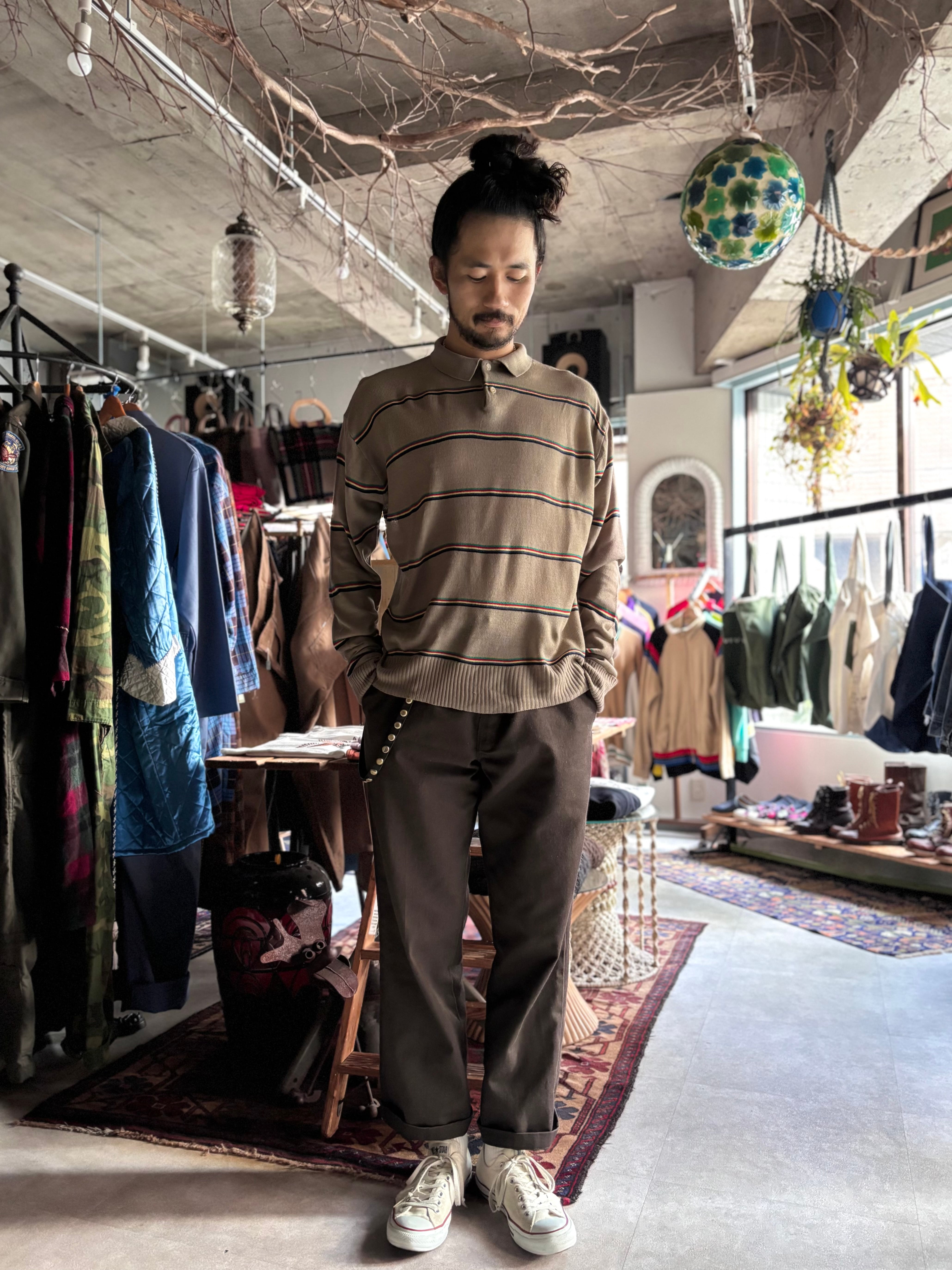 薄手のアクリル素材。だらっと垂れるオーセンティックフィット。レトロなマルチボーダーが可愛いです。