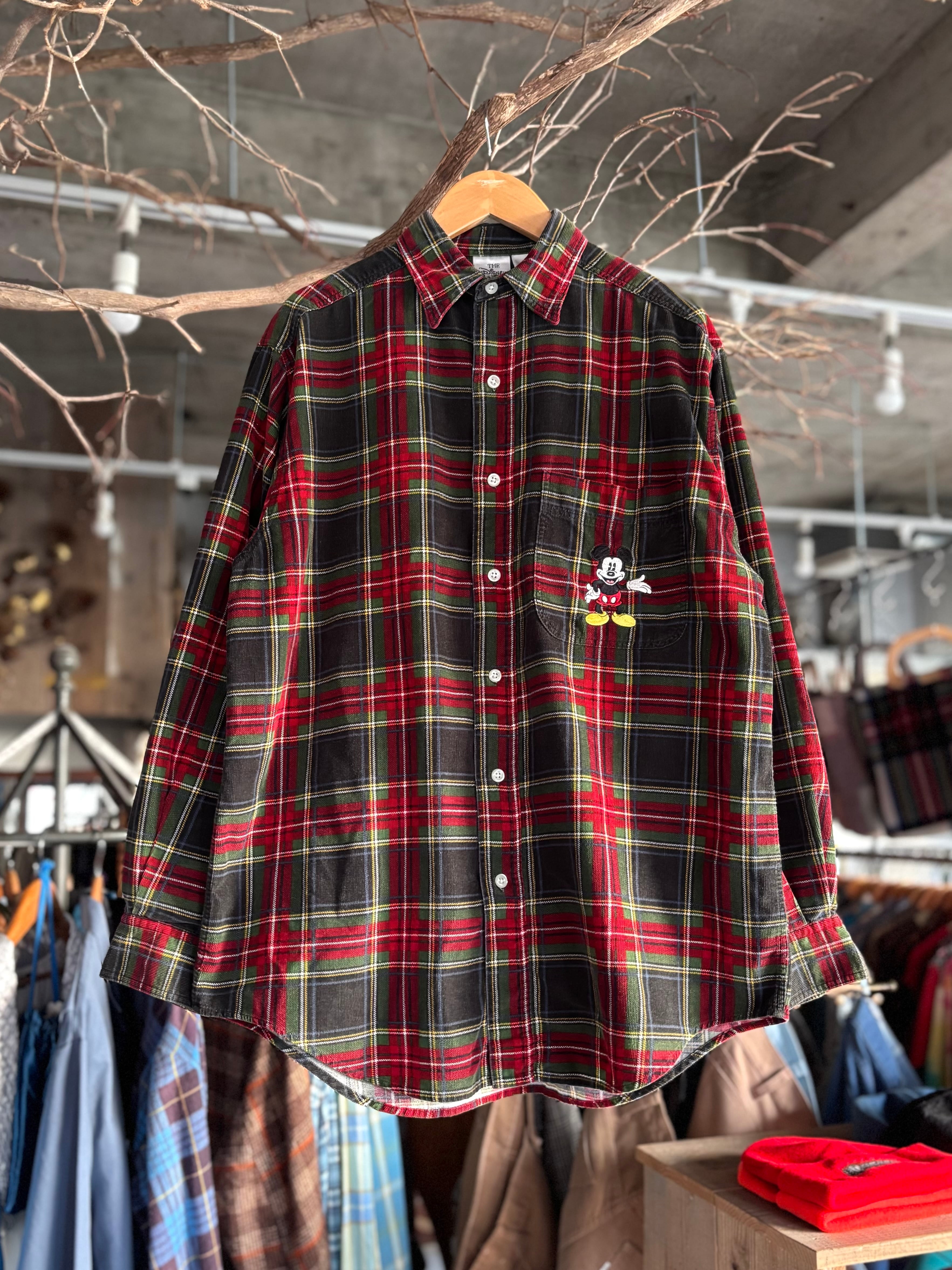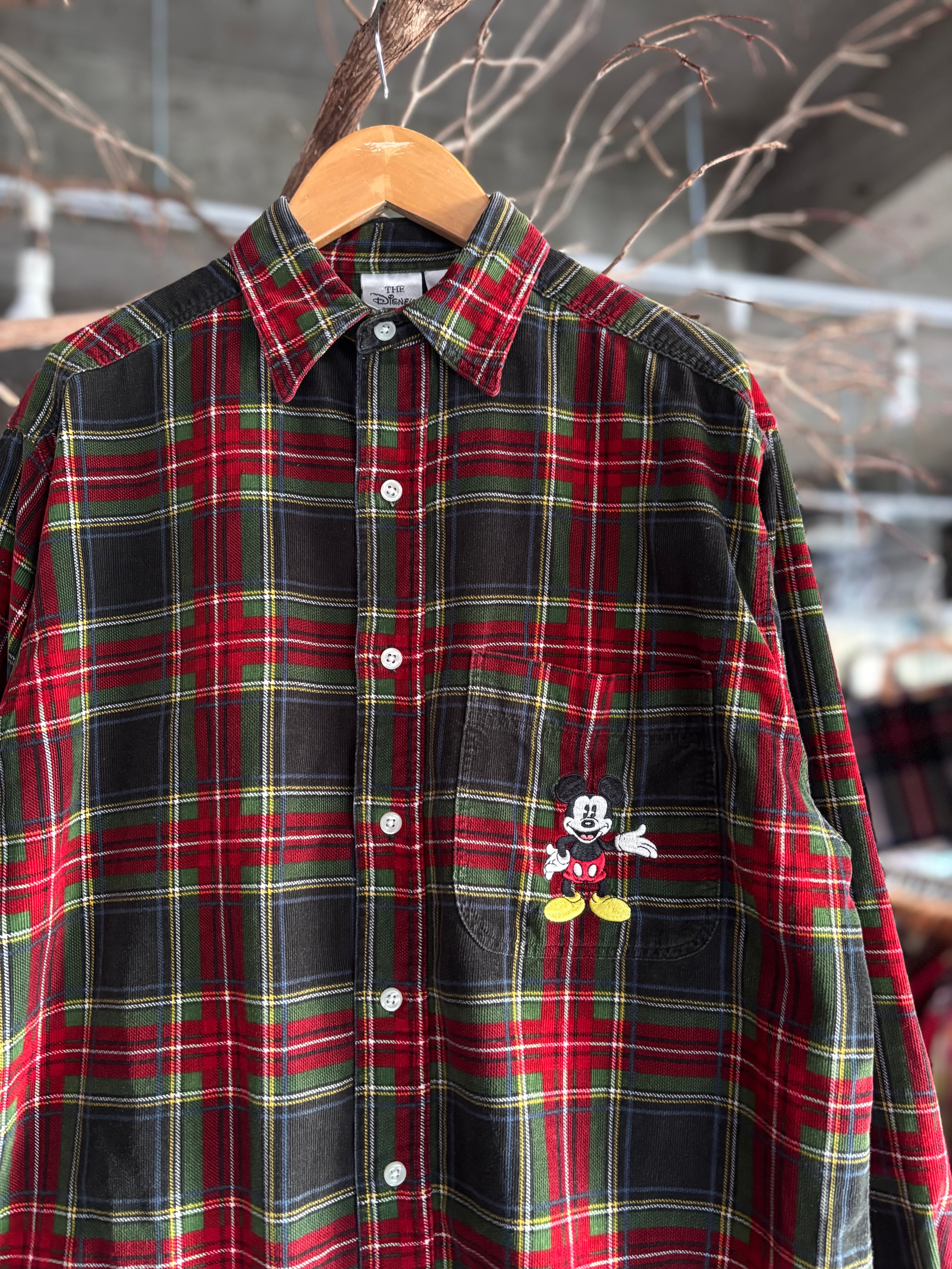 やわらかく着心地の良い細軸コーデュロイ素材。リラックスフィット。トラディショナルなタータンチェック柄。胸ポケにミッキー刺繍入りのオフィシャル物。ユニセックスでおすすめです。