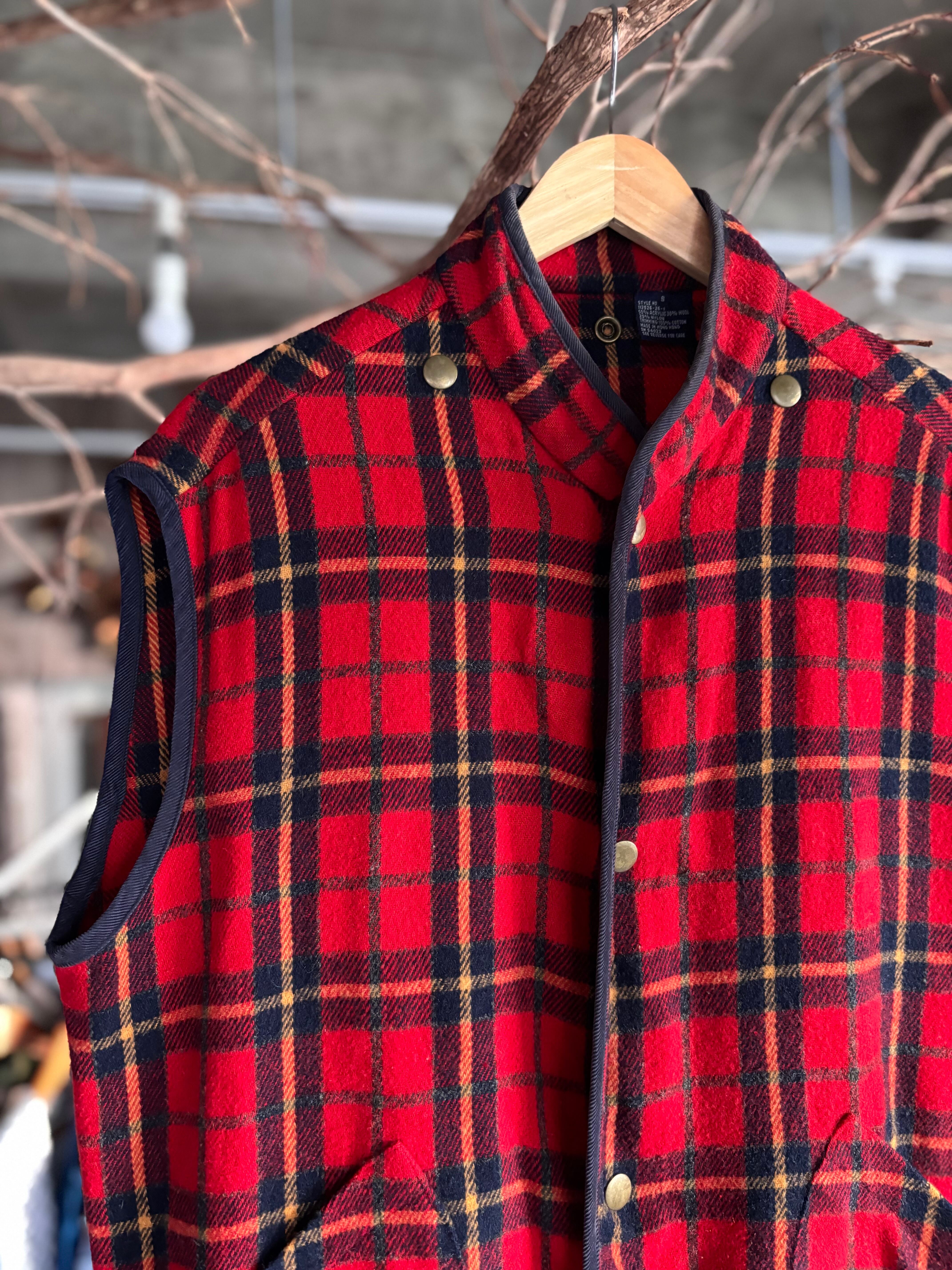 程よい厚みでやわらかいウール×アクリル×ナイロン混紡のライナーベスト。コンパクトな着丈のリラックスフィット。トラディショナルな赤タータン。スナップボタン仕様、ポケット付き。シンプルなカットソーやシャツとのレイヤードスタイルにいかがでしょうか。