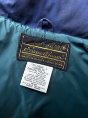 ざらっとしたコットンポリのシェル、中綿はグースダウン入り。リラックスフィット。黒タグが付く90s USA製のvintageエディバウアー製。インナーポケットにドローコードまで抜かりないディテール。長めの丈がとても暖かいです。